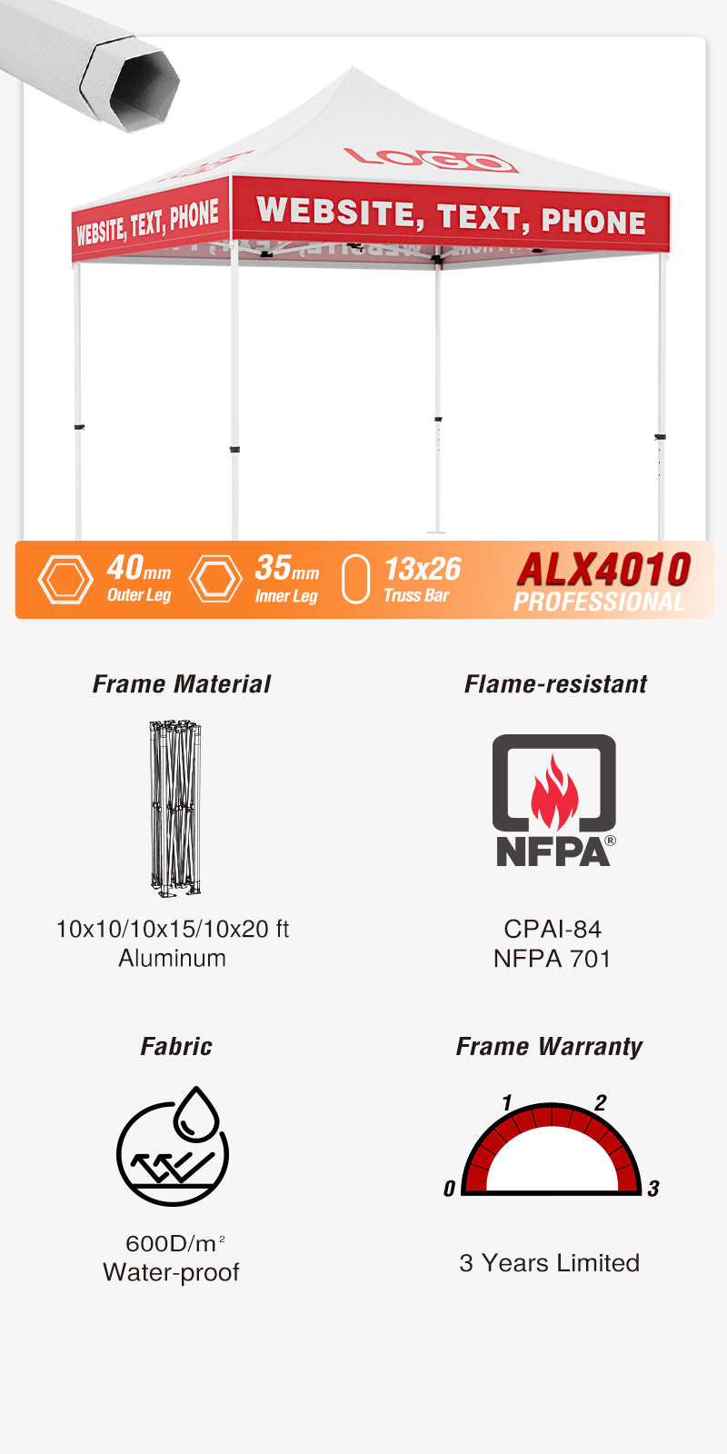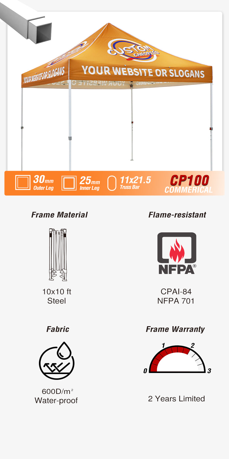 10x10 Slant Leg Pop-up Canopy Tent, 10x10 Base 8x8 Top (Flame)