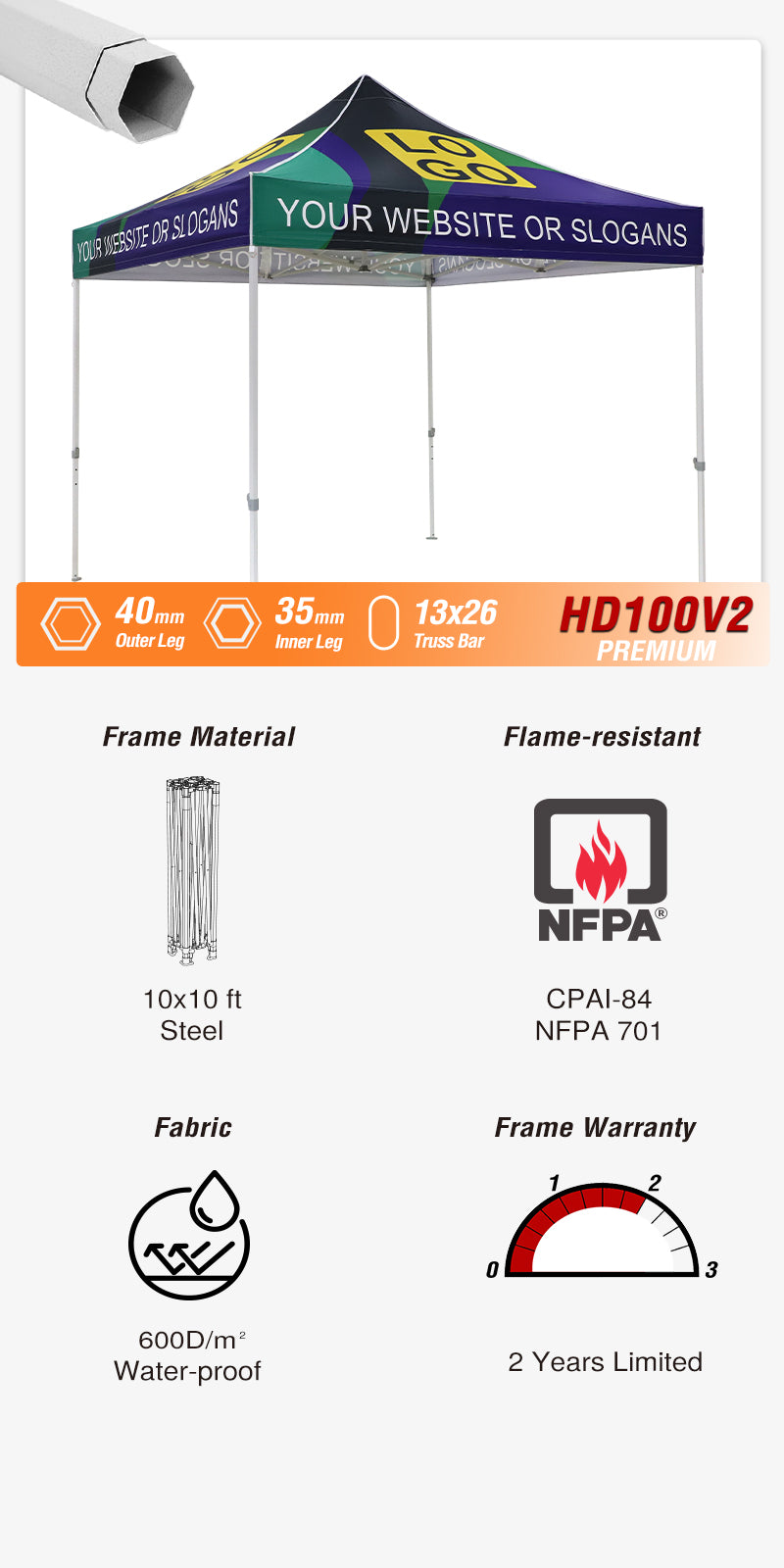 Slant Leg Pop up Canopy Tent, 10x10 Base 8x8 Top with SHADE GRAPHiX High Quality Digital Printed Top