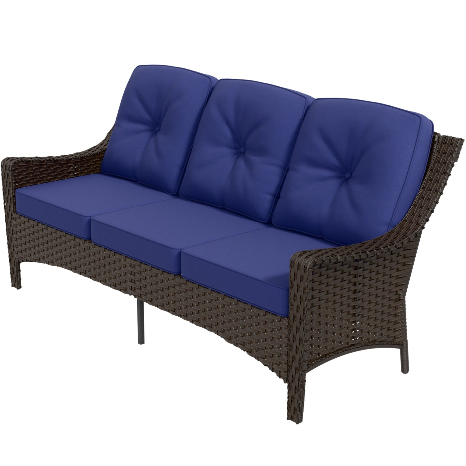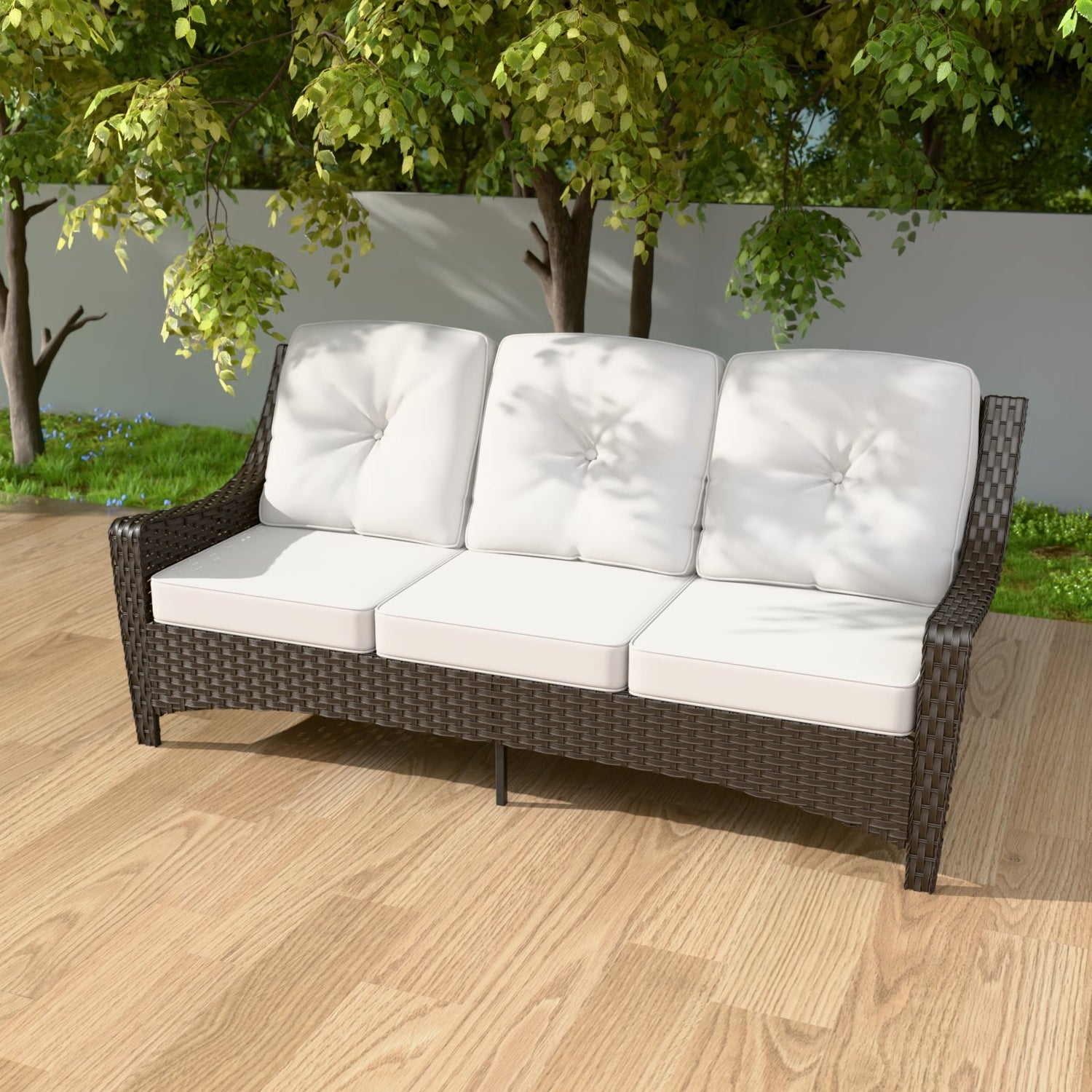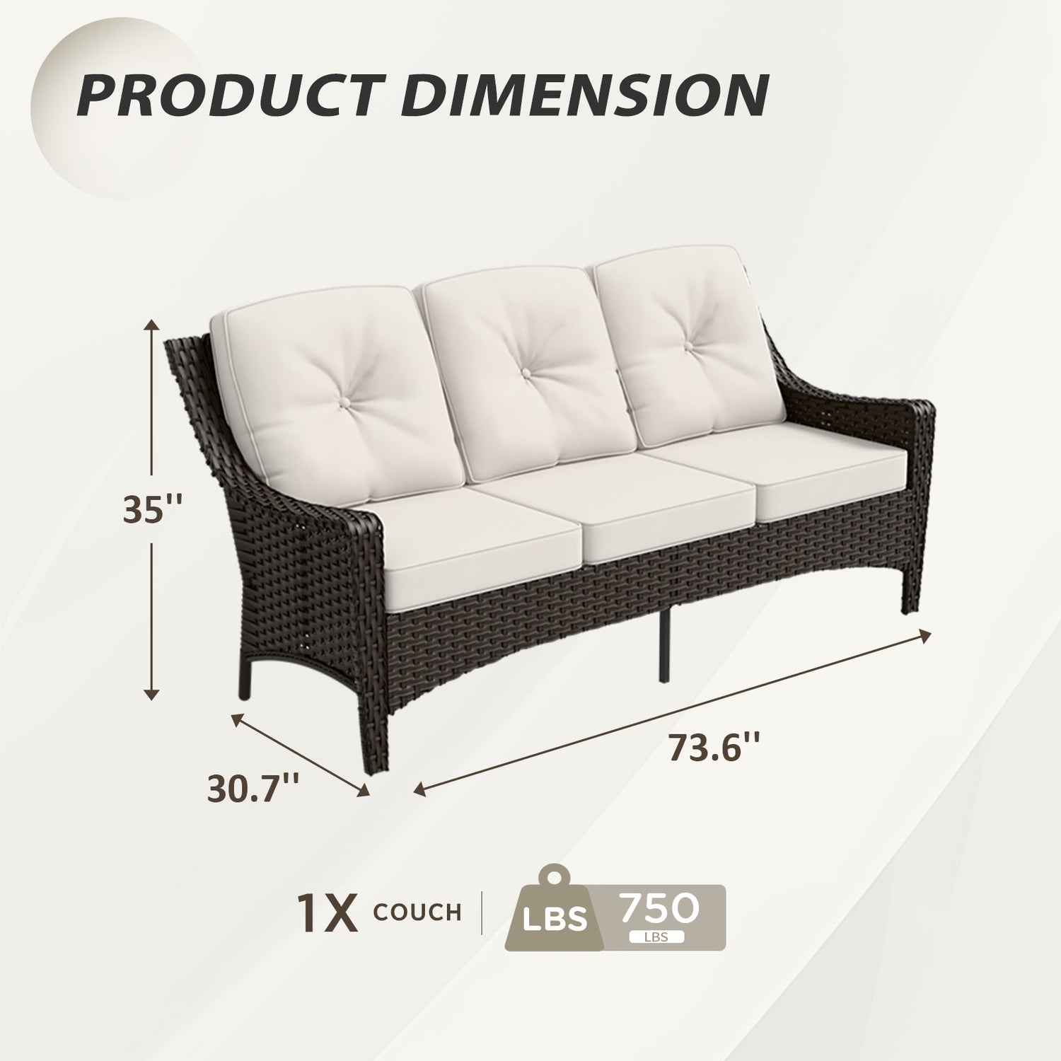 SIZED FOR OUTDOORS: Measuring 73.6" W x 30.7" D x 35" H, this wicker 3 seat sofa is perfectly suited for various outdoor settings, including patios, decks, balconies, porches or gardens. With a sturdy design that supports up to 750 lbs, it’s built to fit a variety of outdoor spaces.
