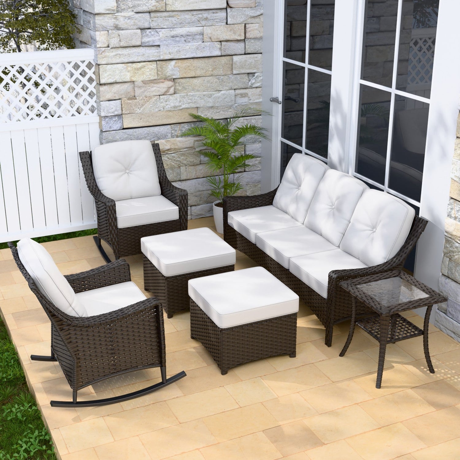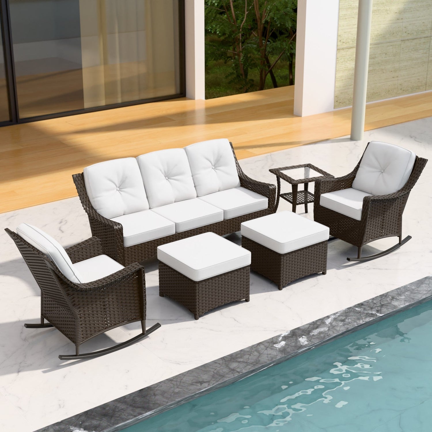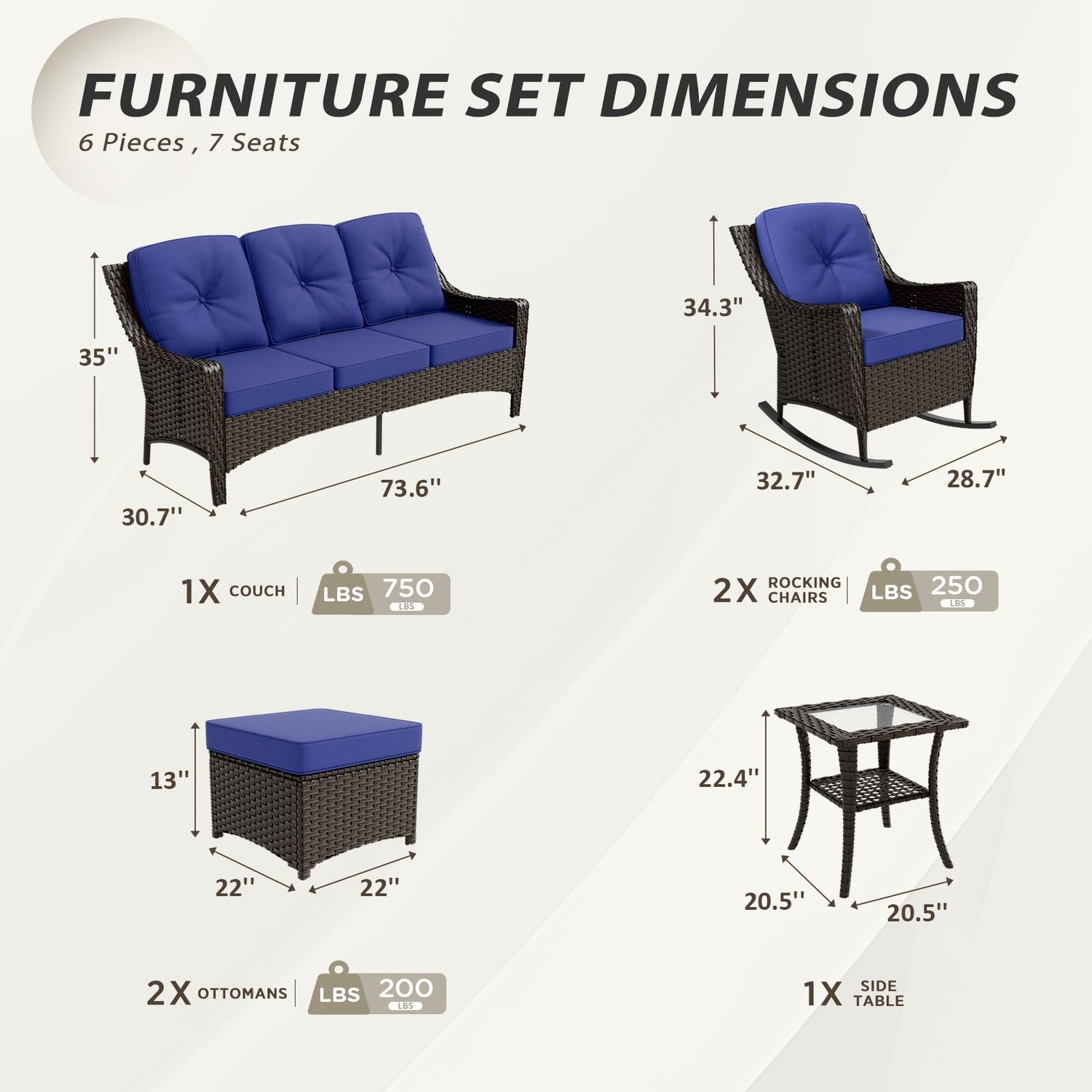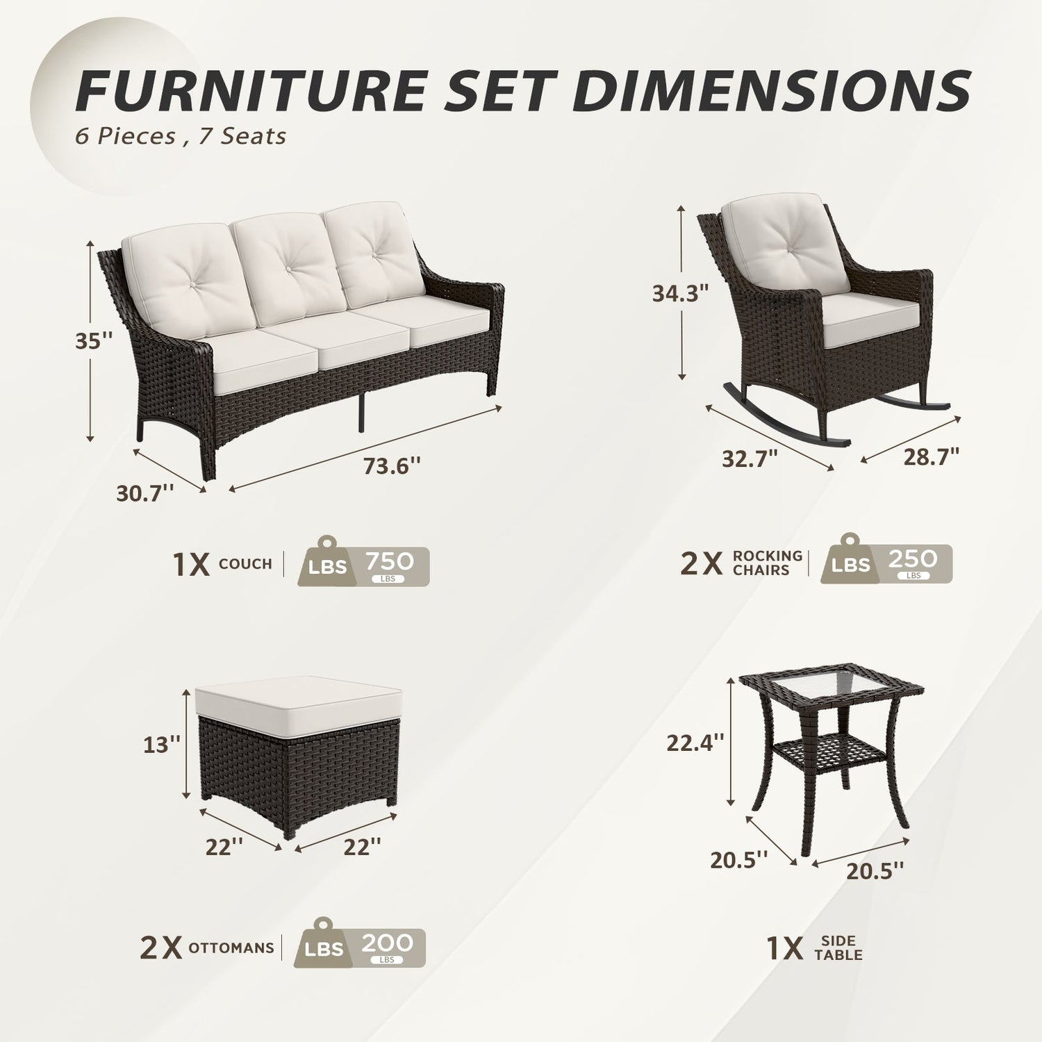 CLASSIC DESIGN: Transform your outdoor space with this timeless 6 piece wicker patio set, featuring a 3 seater sofa, 2 rocking chairs, 2 ottomans, and one side table. The combination of woven rattan and deep, plush cushions adds both comfort and style, perfect for relaxation or entertaining guests.
