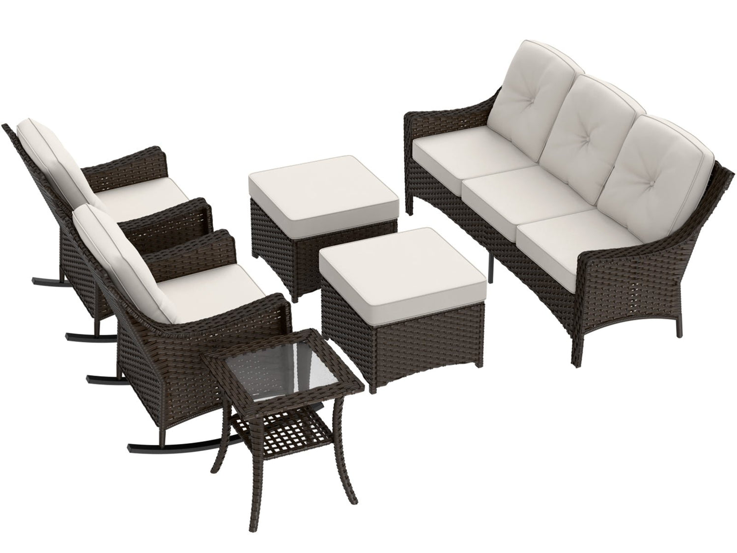 LOUNGE SET: Unwind in style with a comfortable sofa couch and two rocking chairs, featuring high backrests, smooth gentle rocking and cushioned ottomans for added comfort; this wicker set provides everything you need to create a cozy and inviting space for for backyard, porch, garden or poolside lounging.