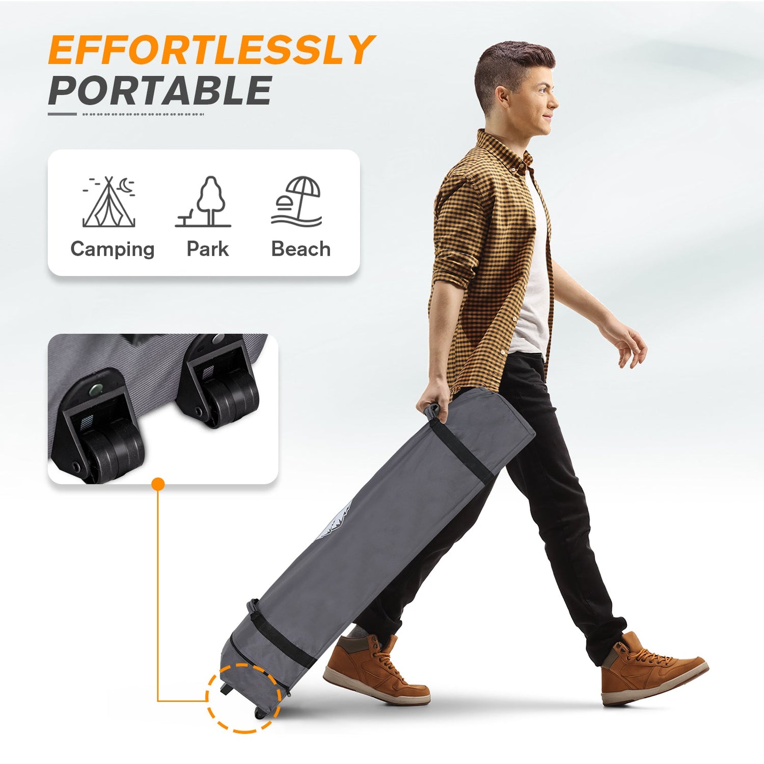 • UPGRADED PACKAGE: This 6.6x6.6 ft instant canopy comes with 1 x canopy frame, 1 x canopy top, 1 x roller bag, 4 x guy ropes, 8 x steel stakes. Take this canopy with you anywhere using the portable compact 600x300D wheeled carrying bag.