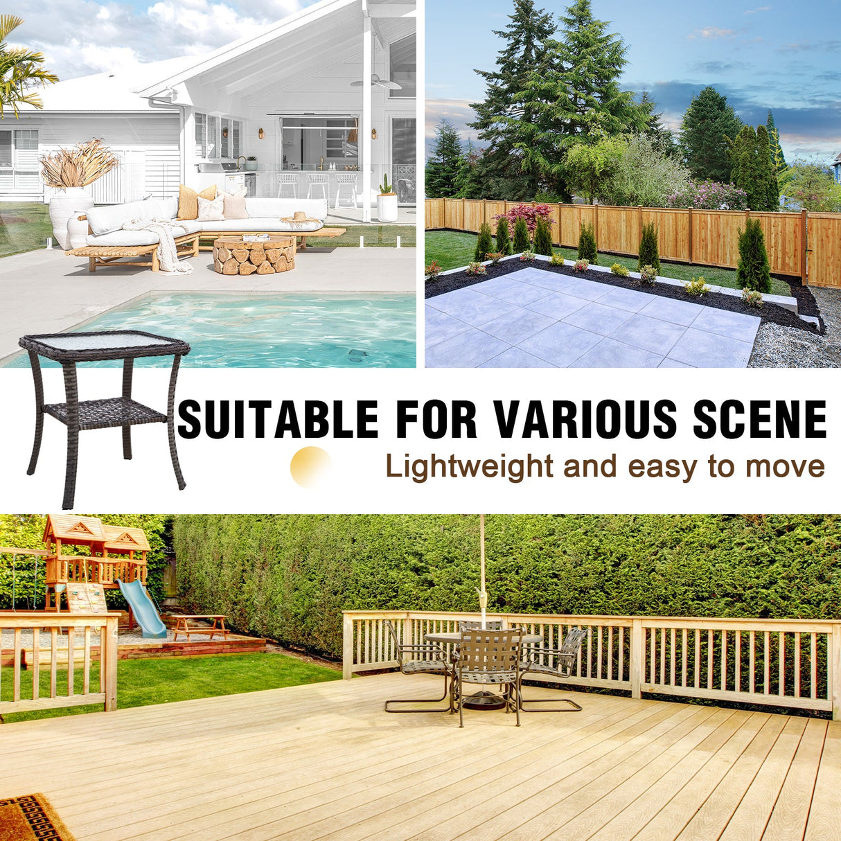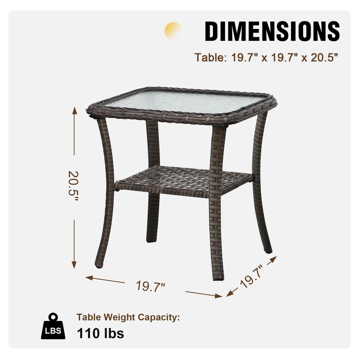 EAGLE PEAK Rustic Veranda Outdoor Wicker Side Table with Lower Storage, Rattan Coffee Table with Tempered Glass Top, Brown
