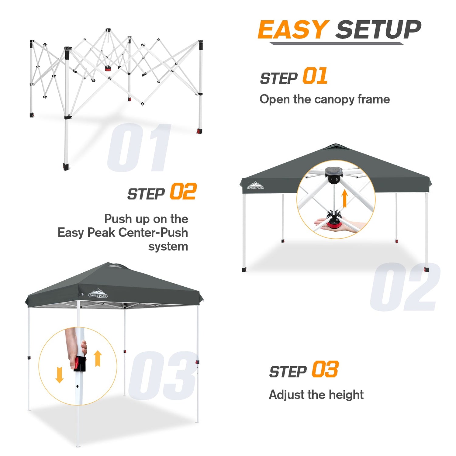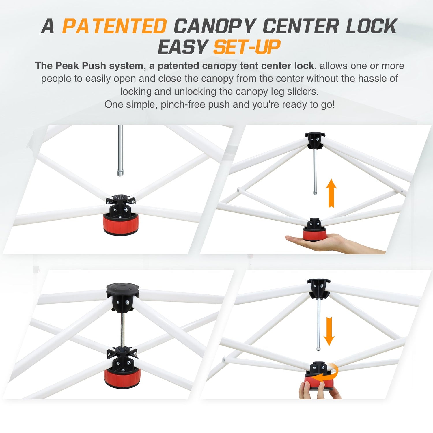 EASY SETUP: This easy setup pop up canopy tent features the Peak Push system, a patented canopy center lock. The portable canopy requires no tools and easily opens and closes from the center in seconds. Its unique canopy tent center lock enables a quick, one person setup, letting you maximize outdoor time with minimal effort.