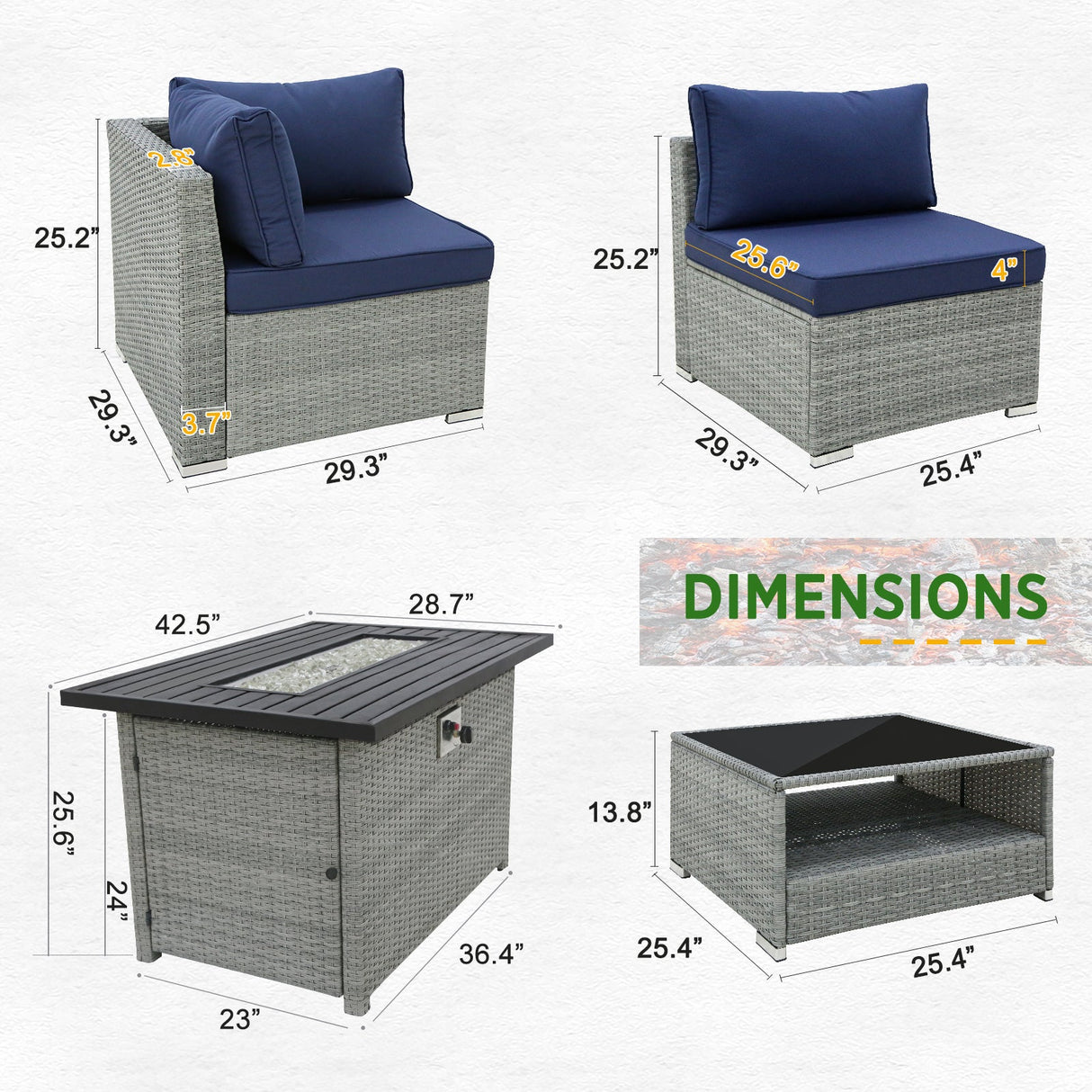 13 Piece Outdoor Wicker Patio Furniture Set with Fire Table and 2 Coffee Tables with Seating for 10 People - Dark Blue is backordered and will ship as soon as it is back in stock.