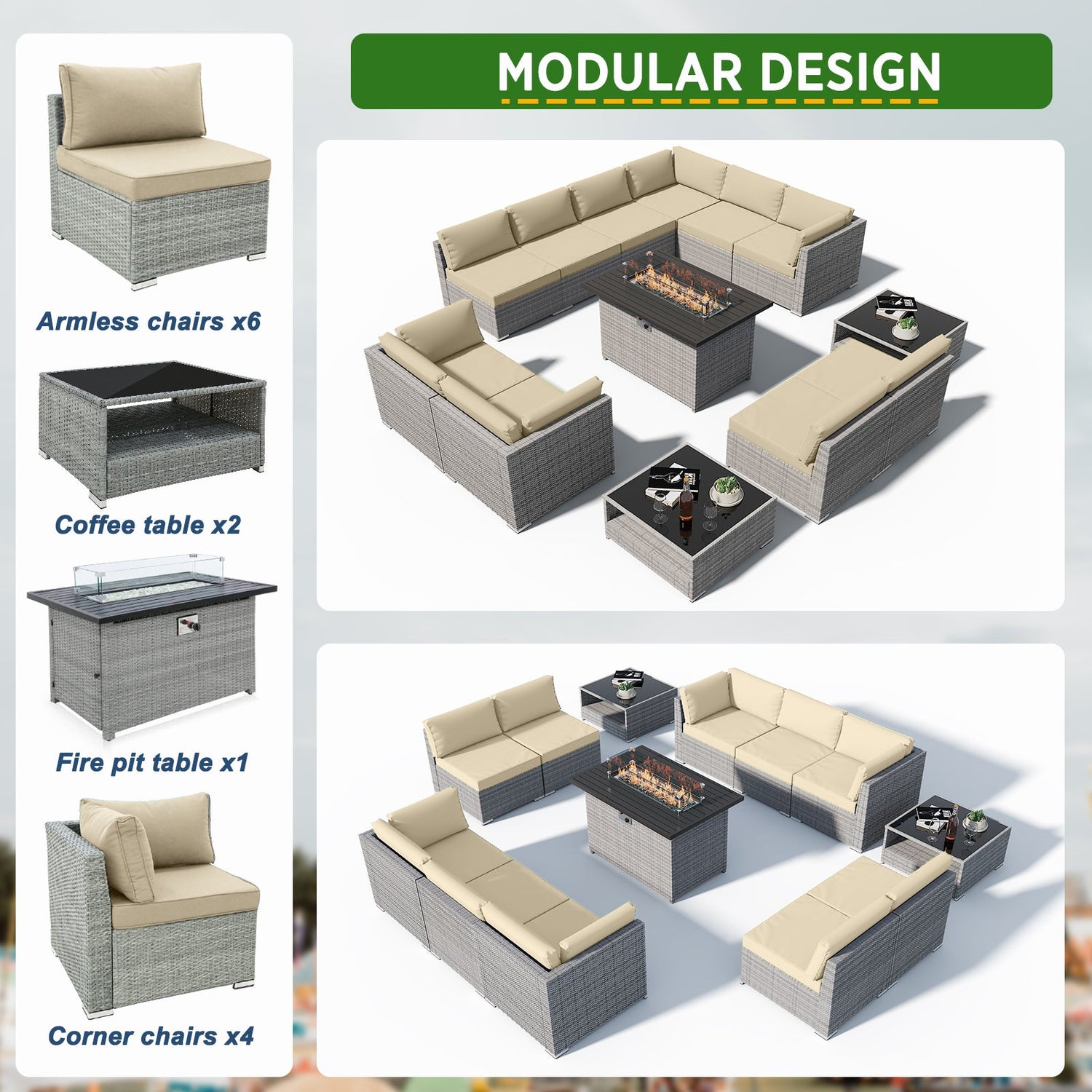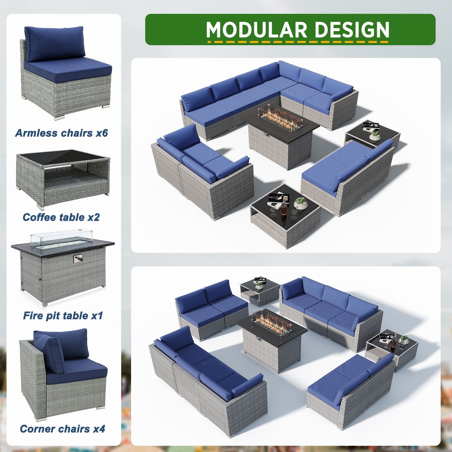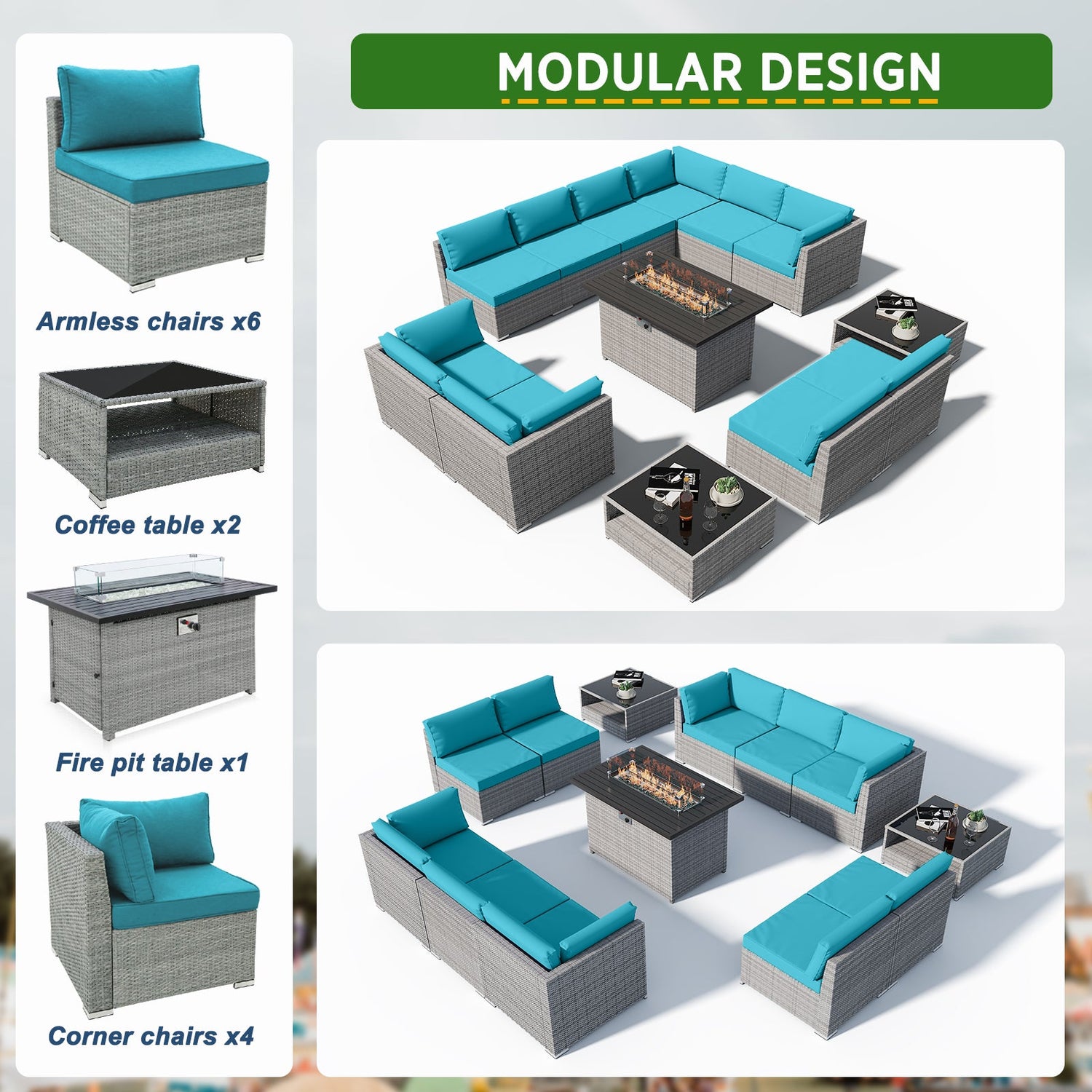 - MODULAR DESIGN: The 13-piece wicker set can be assembled as shown, pieces can be used individually, or configured as desired. Perfectly sized for your balcony, patio, or deck.