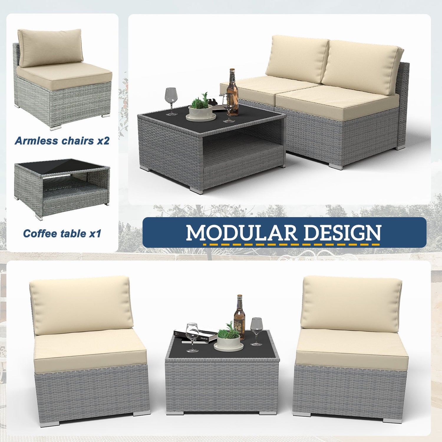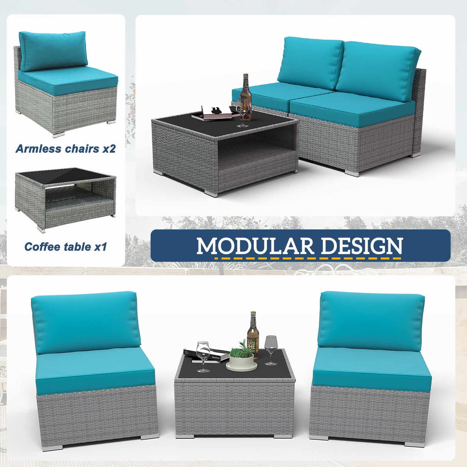 3 Piece Outdoor Patio Armless Chairs with Coffee Table, Sectional Wicker Loveseat Sofa