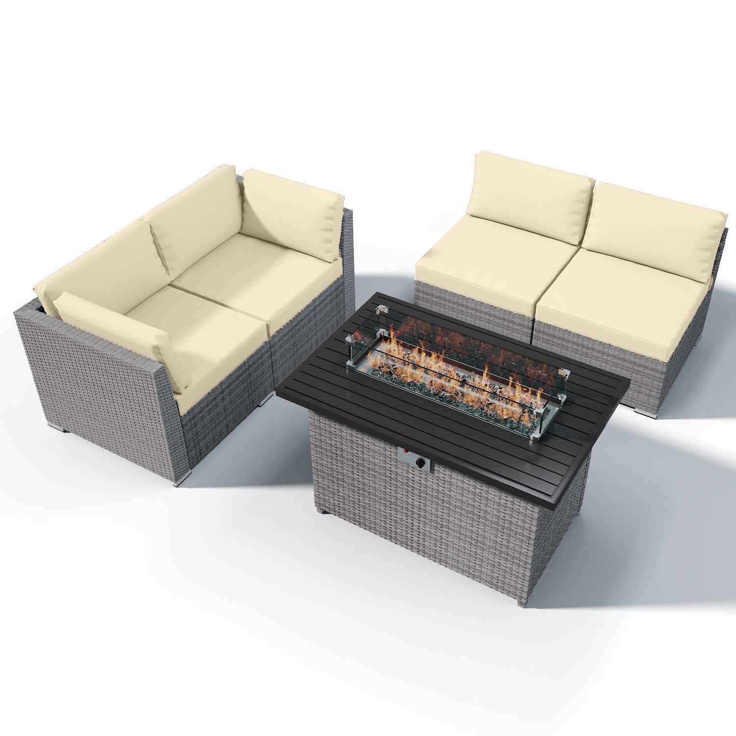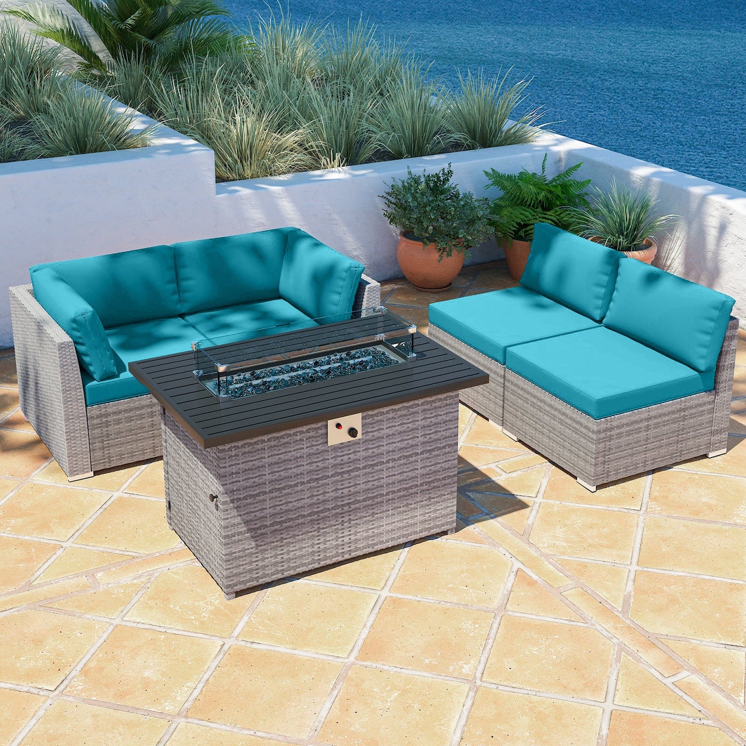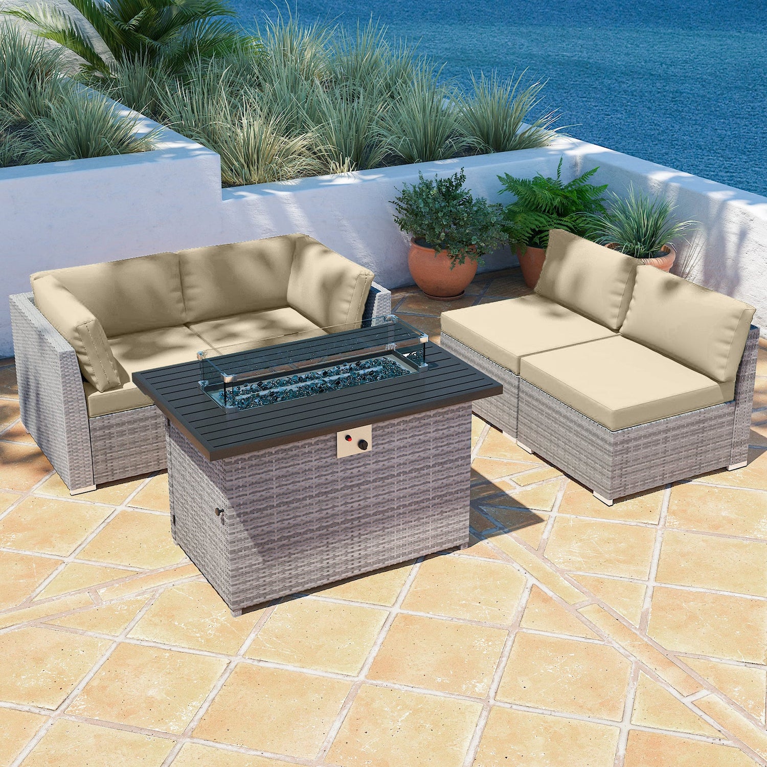 5 Piece Outdoor Wicker Patio Furniture Set with Fire Table, PE Rattan Sectional Conversation Sofa Set with Seating for 4 People