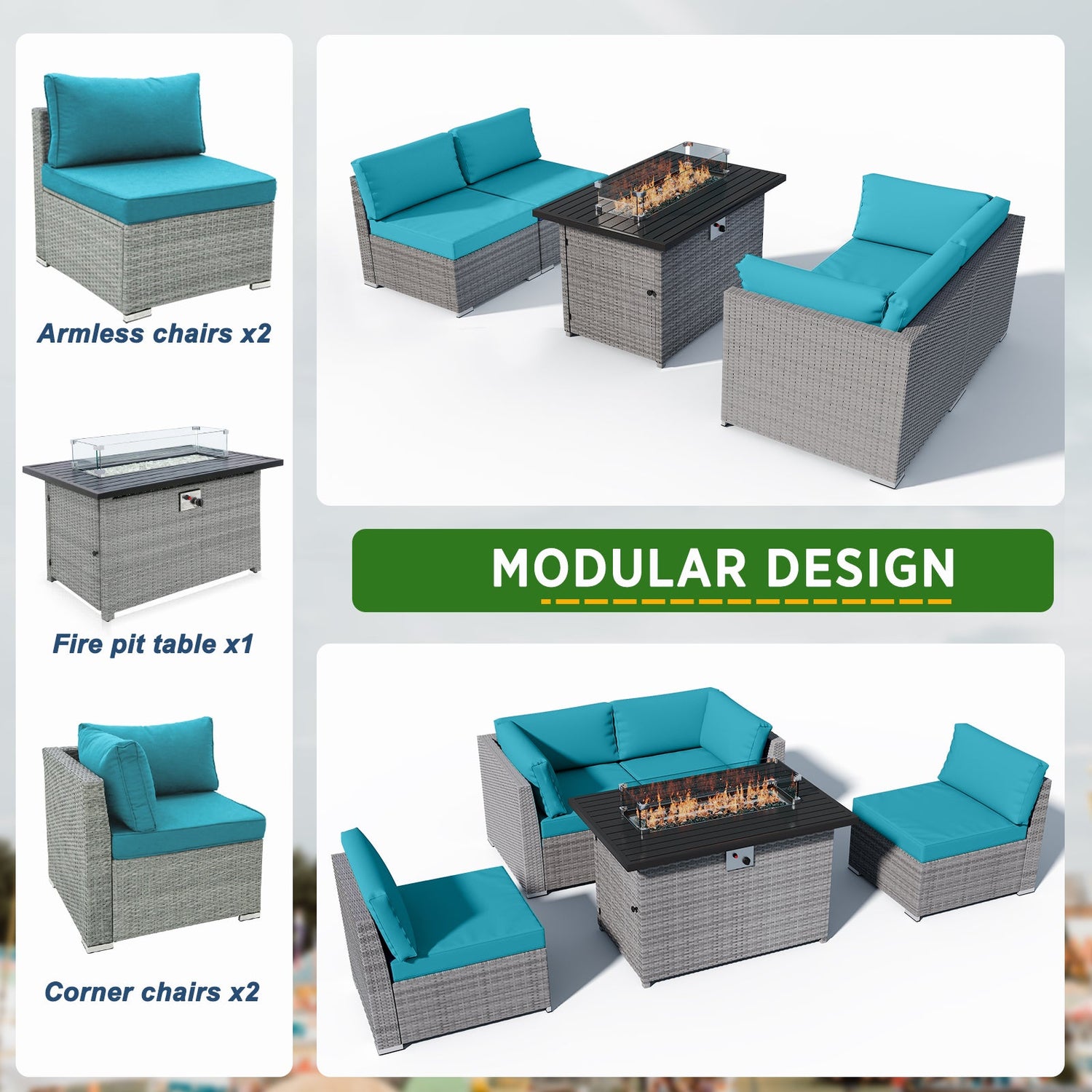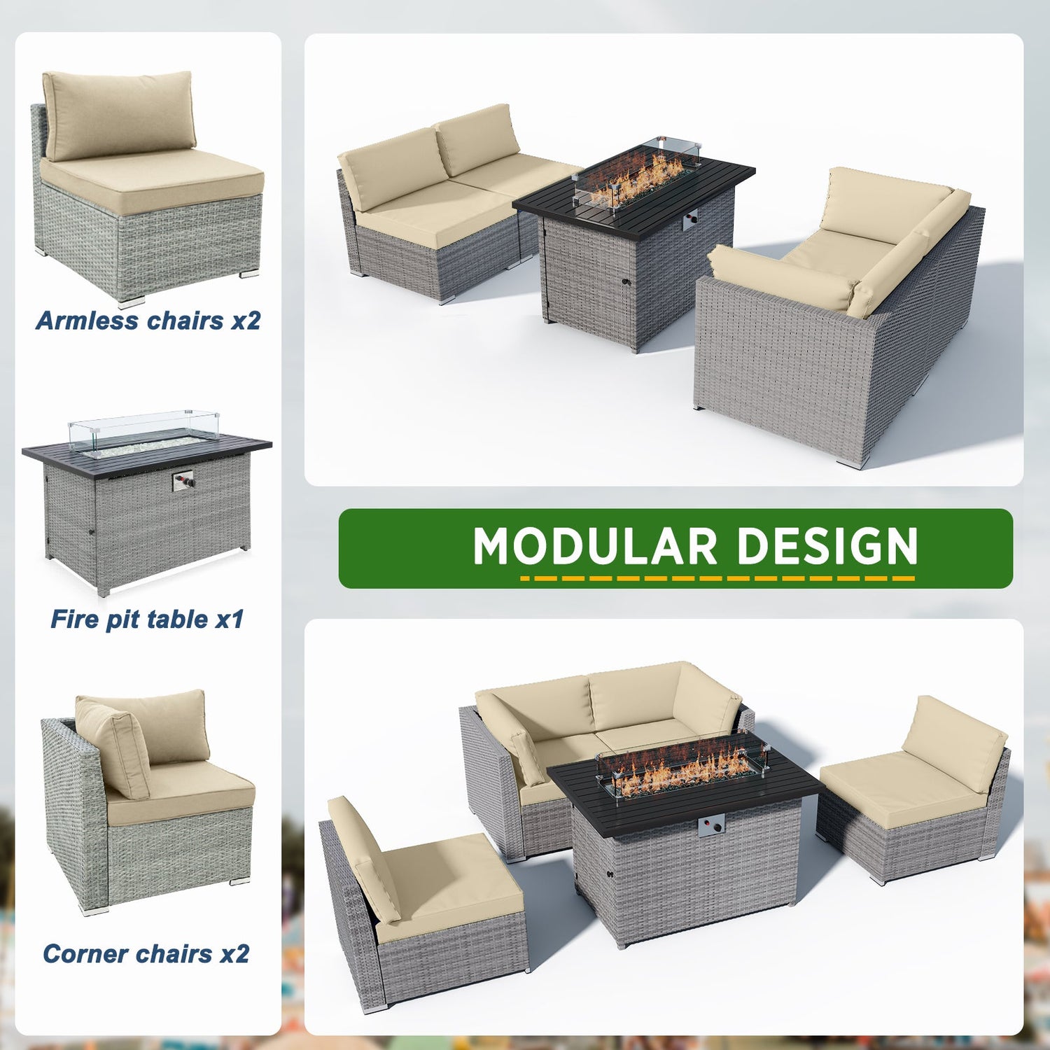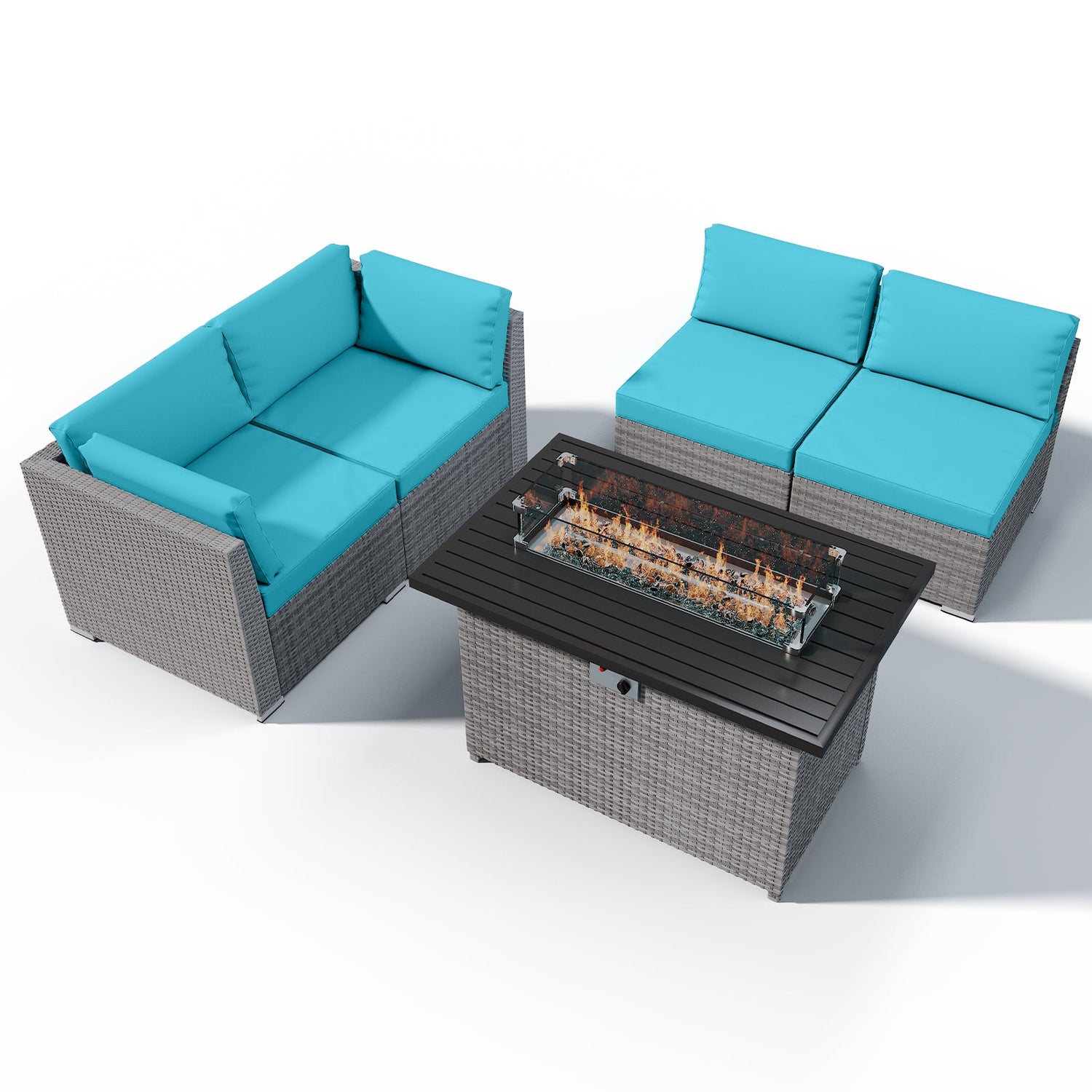 5 Piece Outdoor Wicker Patio Furniture Set with Fire Table, PE Rattan Sectional Conversation Sofa Set with Seating for 4 People