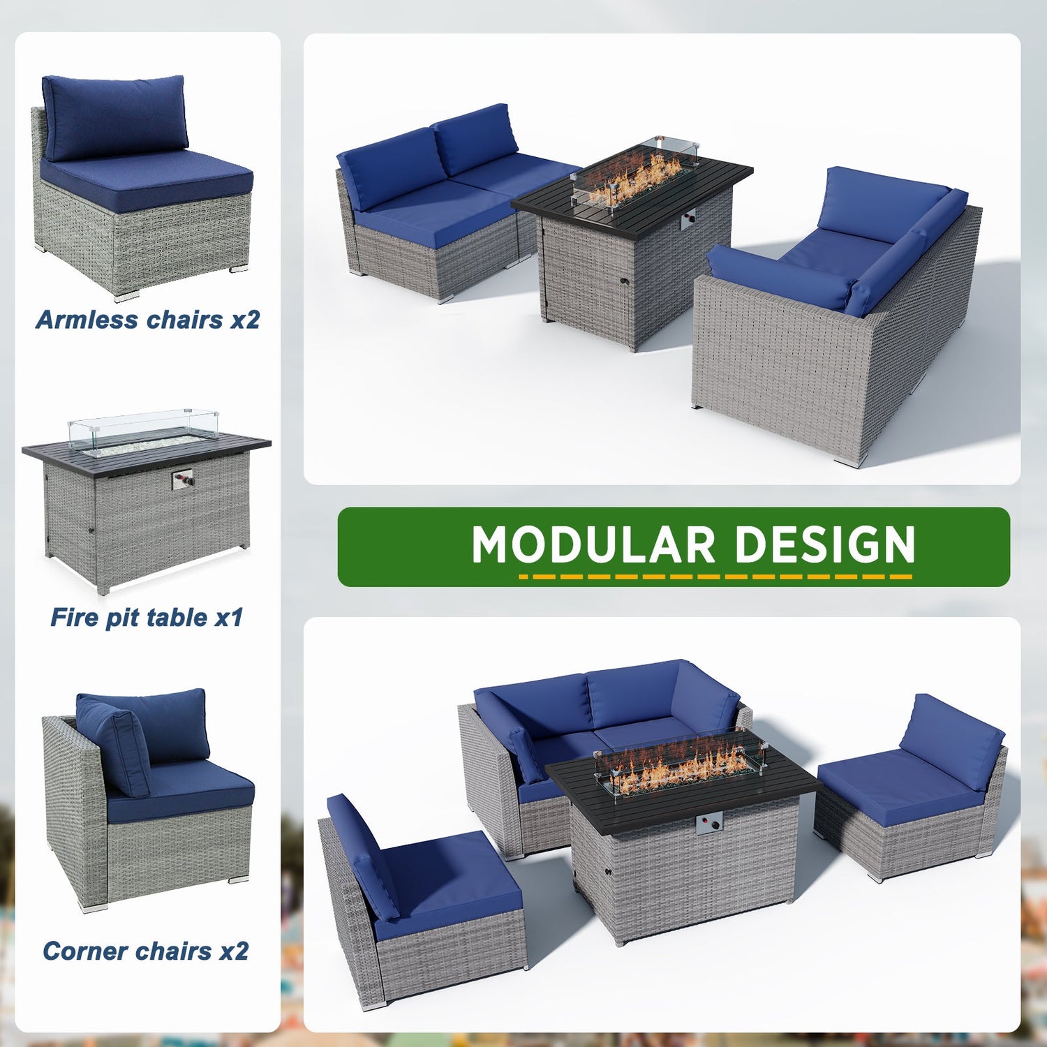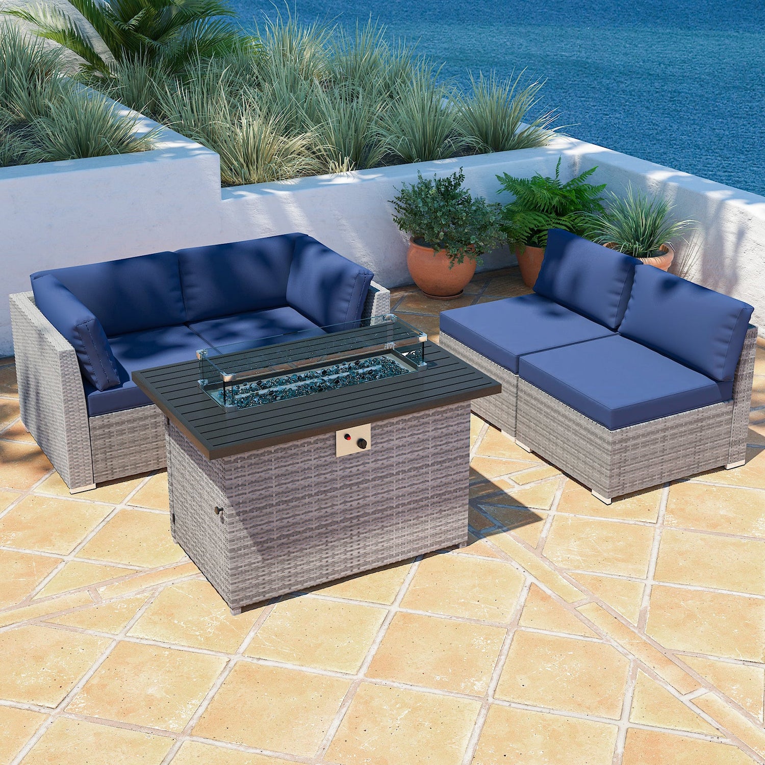 5 Piece Outdoor Wicker Patio Furniture Set with Fire Table, PE Rattan Sectional Conversation Sofa Set with Seating for 4 People - Dark Blue is backordered and will ship as soon as it is back in stock.