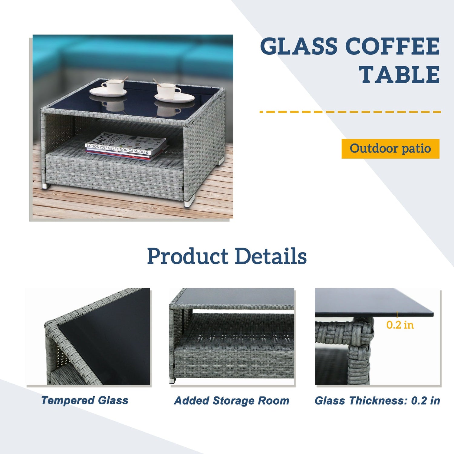 - GLASS COFFEE TABLE: 25.4in x 25.4in x 13.8in (LxWxH) square PE rattan coffee table with an easily cleaned tempered glass top.