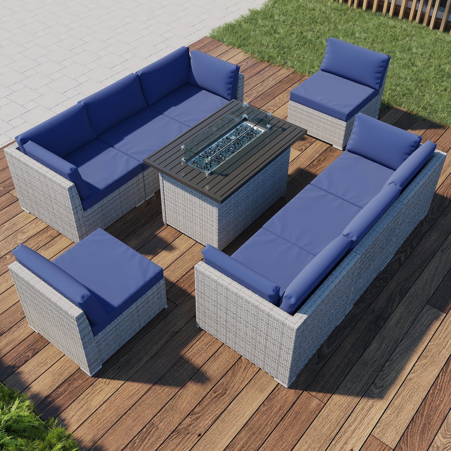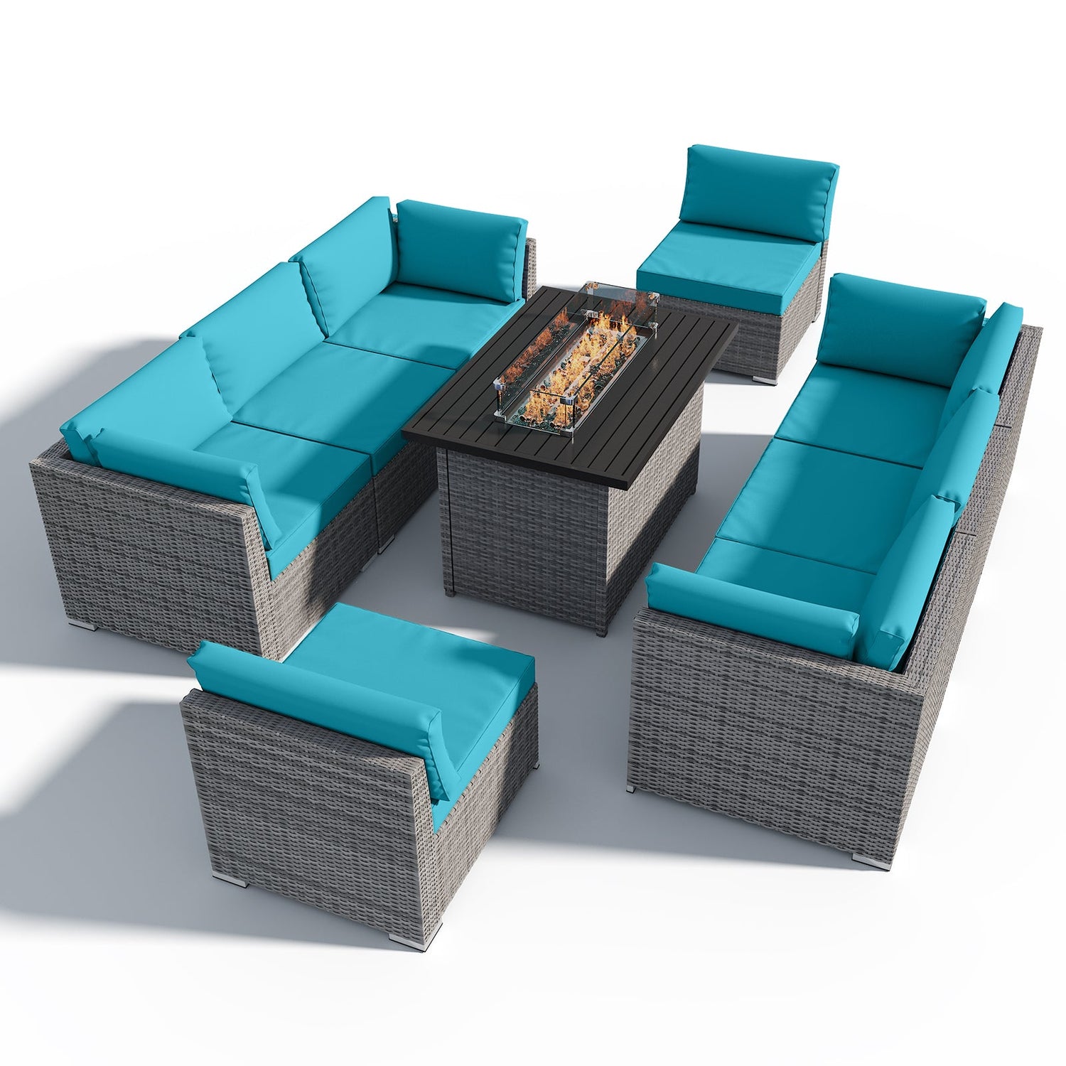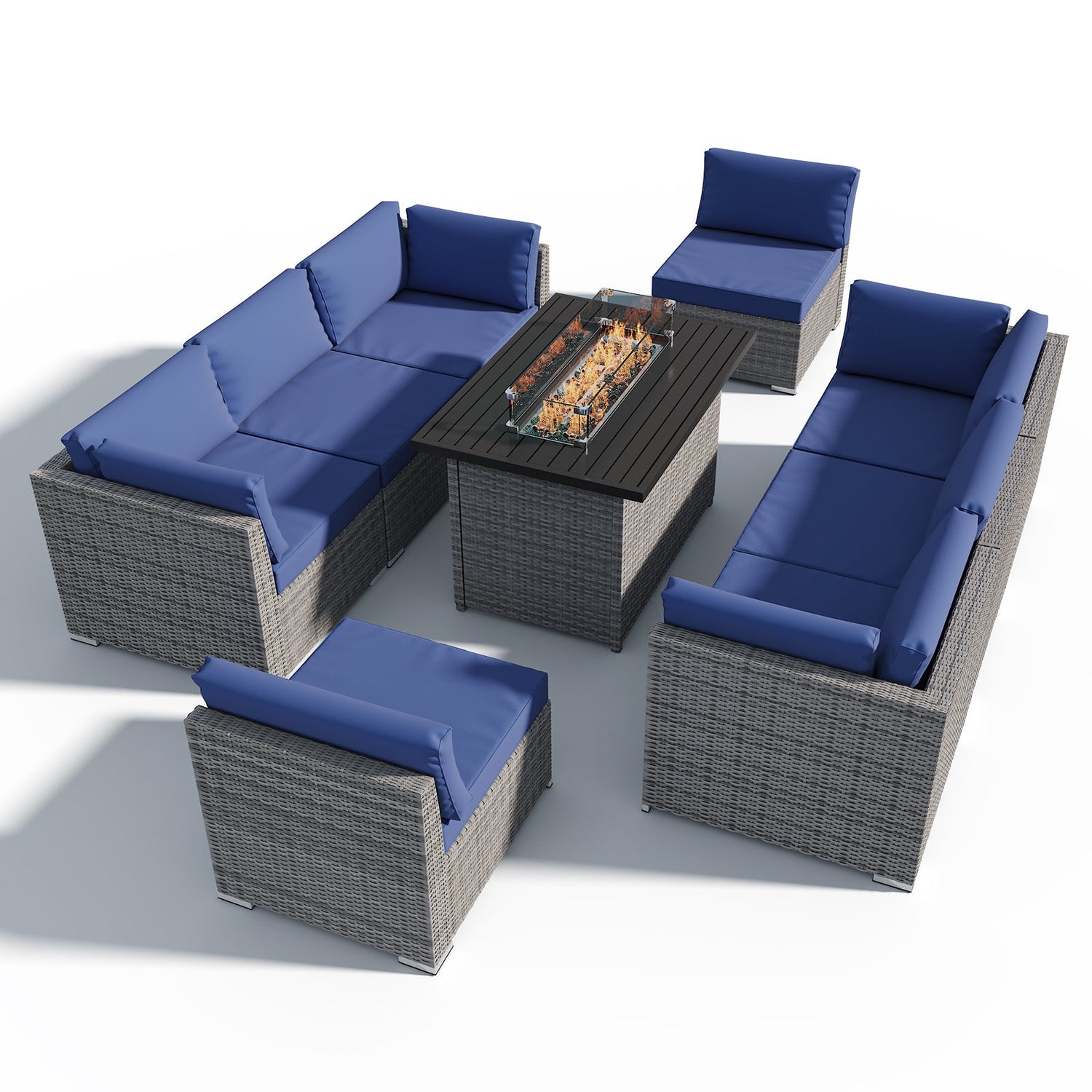 9 Piece Outdoor Wicker Patio Furniture Set with Fire Table for 8 People - Dark Blue is backordered and will ship as soon as it is back in stock.