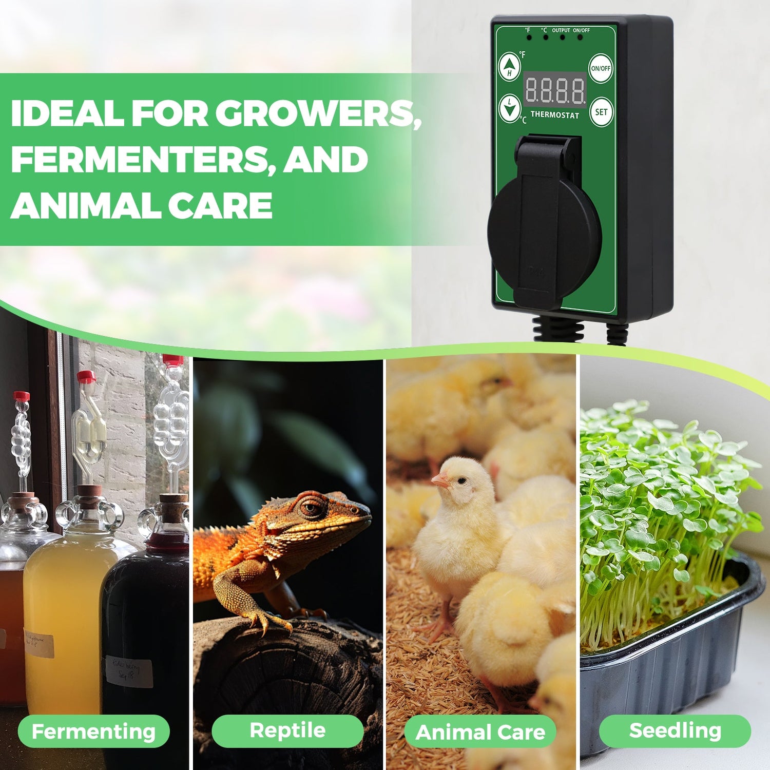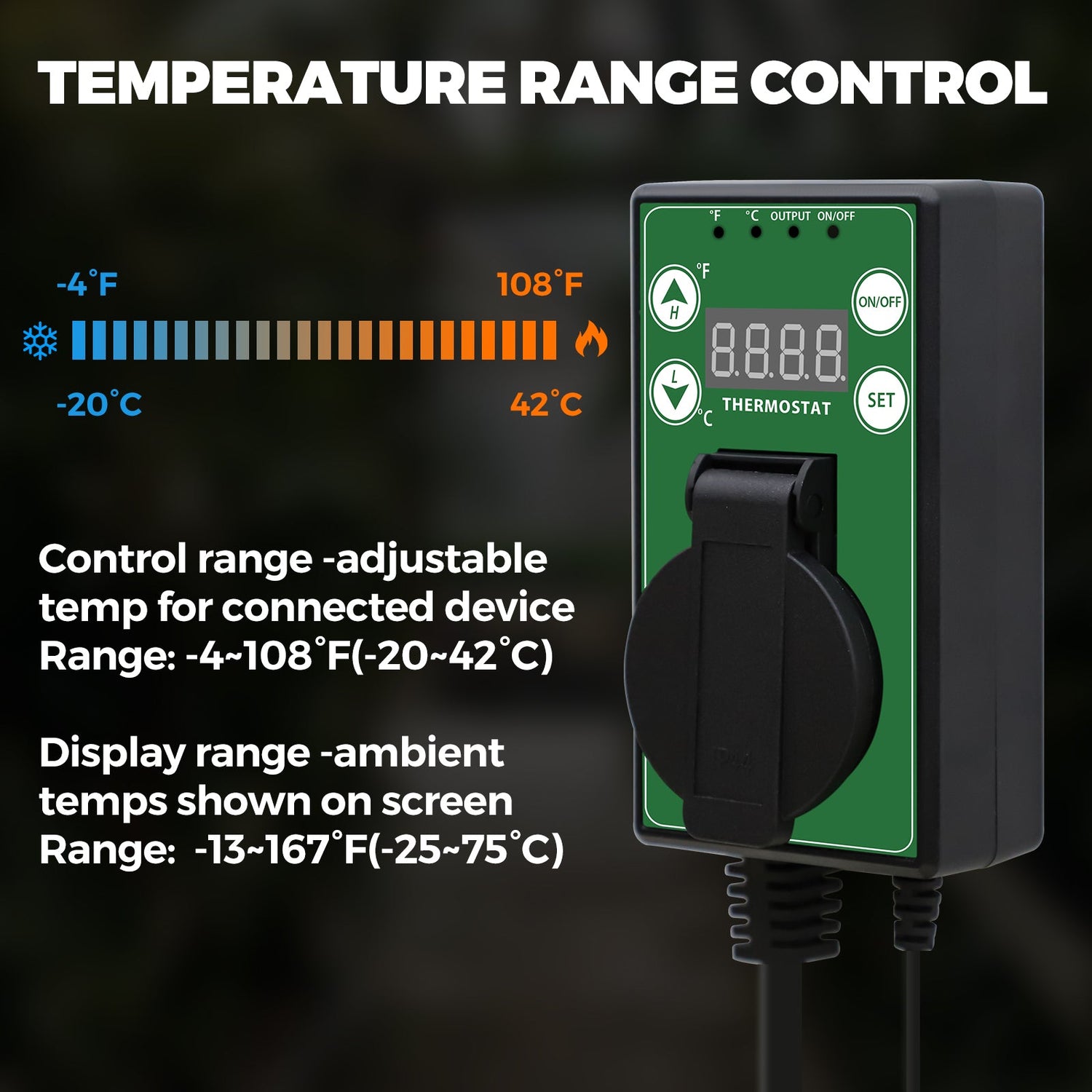 TEMPERATURE RANGE: Precisely regulate environments from -4°F to 108°F (-20°C to 42°C) with the EAGLE PEAK digital thermostat; ideal for greenhouses, seedling mats, reptile enclosures, brewing, and other heat-sensitive environments