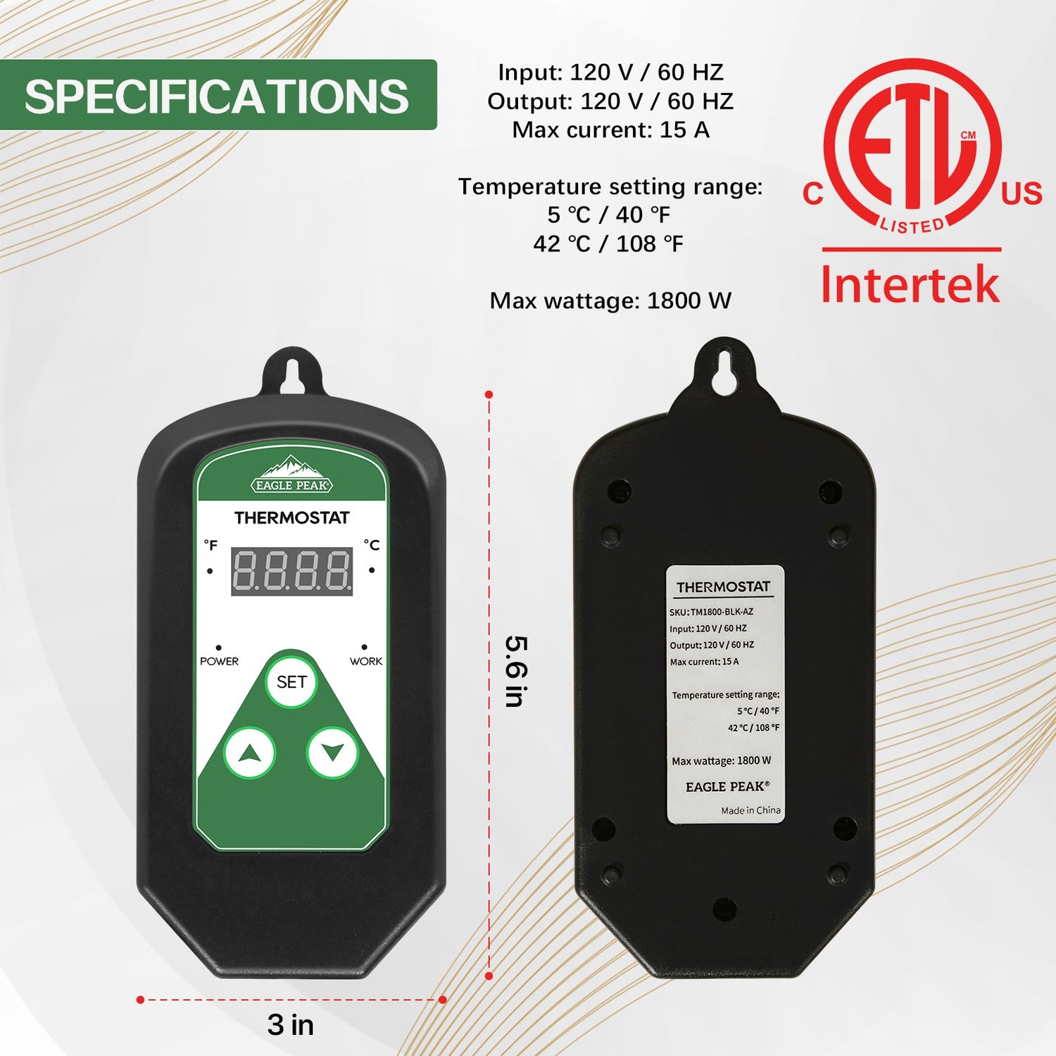 - TEMPERATURE RANGE: This EAGLE PEAK digital thermostat controller can control the temperature ranging from 42°F to 108°F (5℃ to 40℃).
