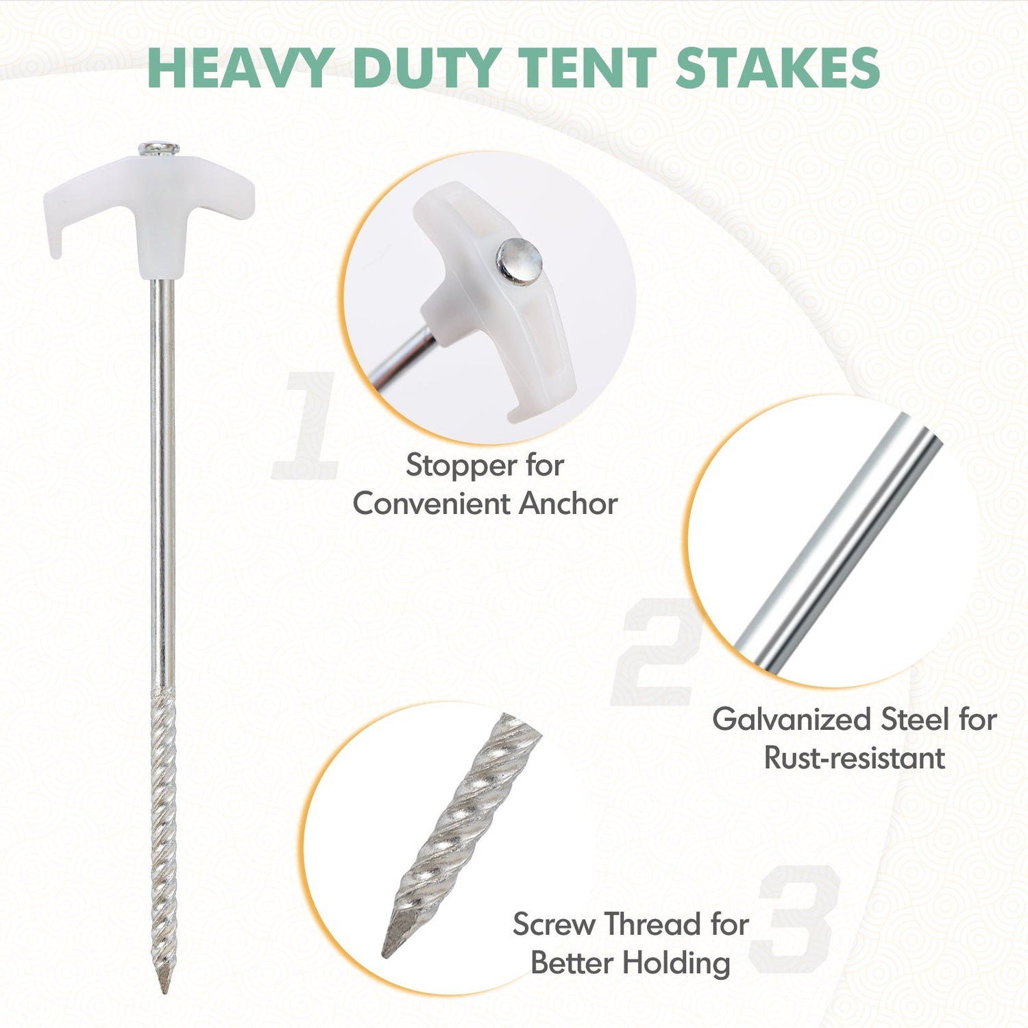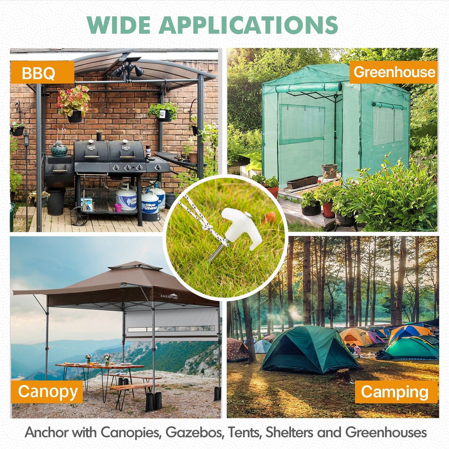 Multi-purpose Ground Stakes: This set of stakes is perfect for anchoring canopies, gazebos, tents, shelters, and greenhouses.