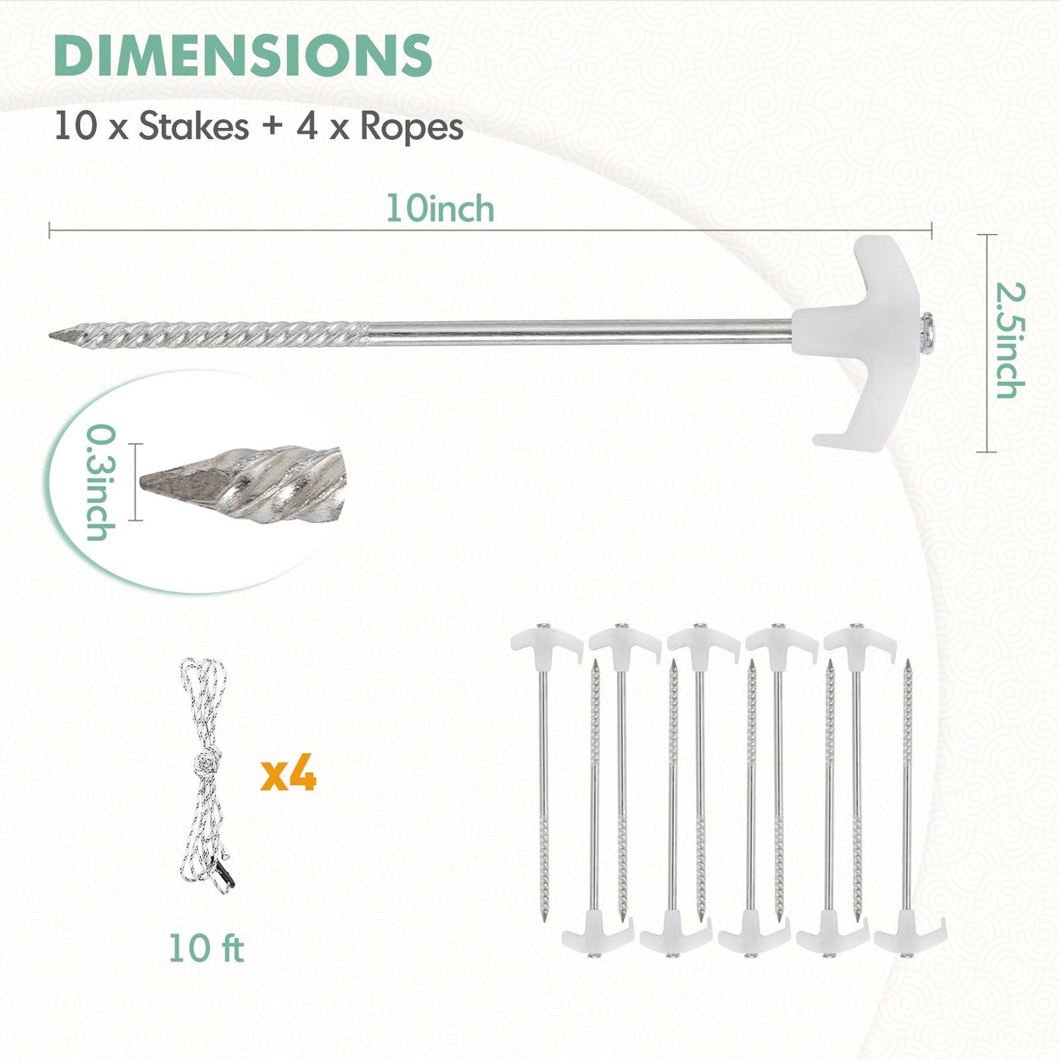 Package Includes: Packed with 10pcs tent stakes with stoppers, and 4 pcs 10ft ropes.