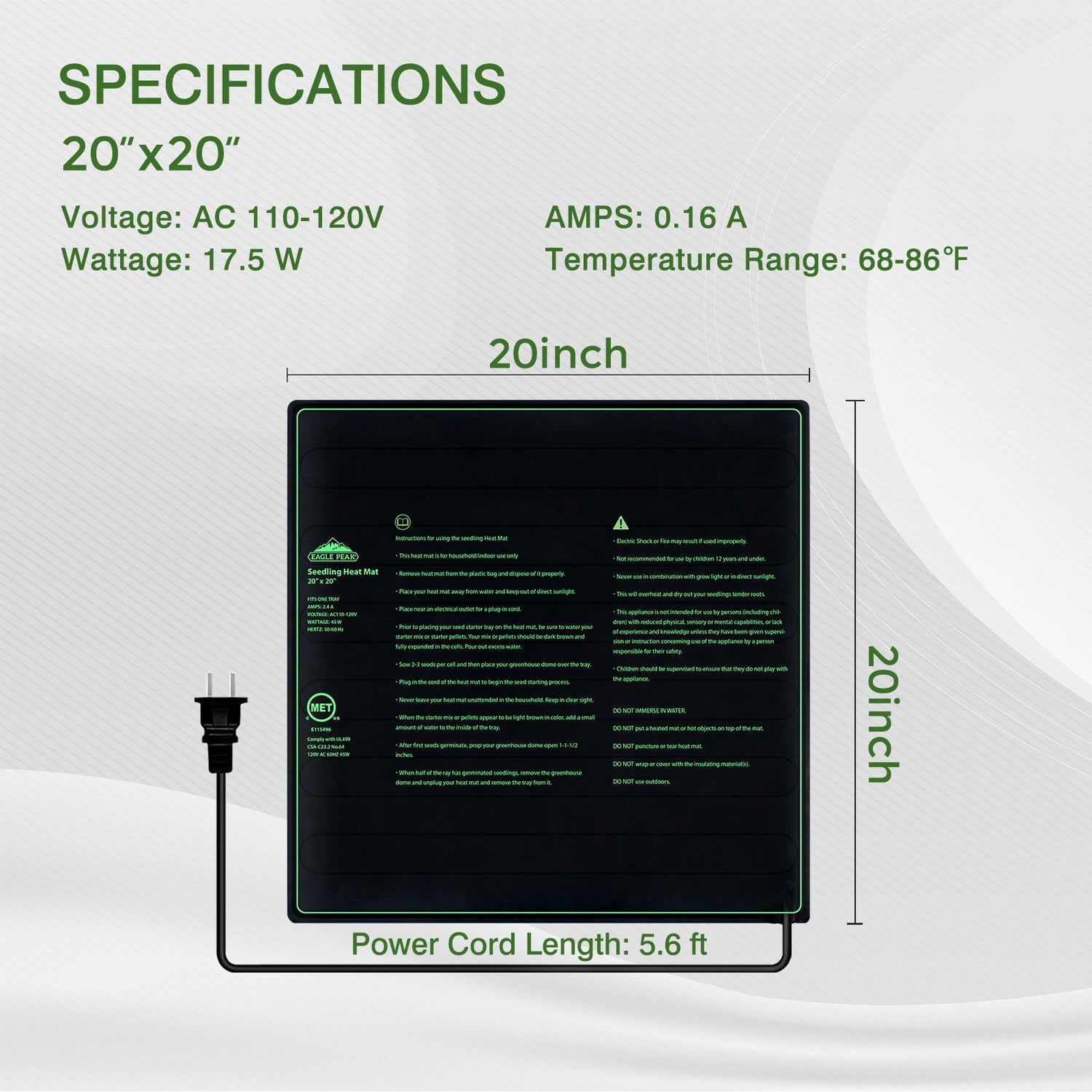EAGLE PEAK Seedling Heat Mat 20”x20”, UL & MET-Certified Heating Pad for Seed Starting, Waterproof Heating Mat for Seed Germination, Warm Hydroponic Gardening Heating Pad, Contains (1) Warming Mat