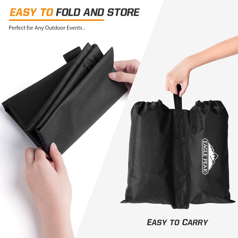 - EASY TO USE: EAGLE PEAK weight bags easily fill with sand, dirt or gravel and offer more stability and added safety. They easily fold and store for convenient transport. Our weight bags are easily attached to canopy legs with 2 velcro straps for a tight fit.