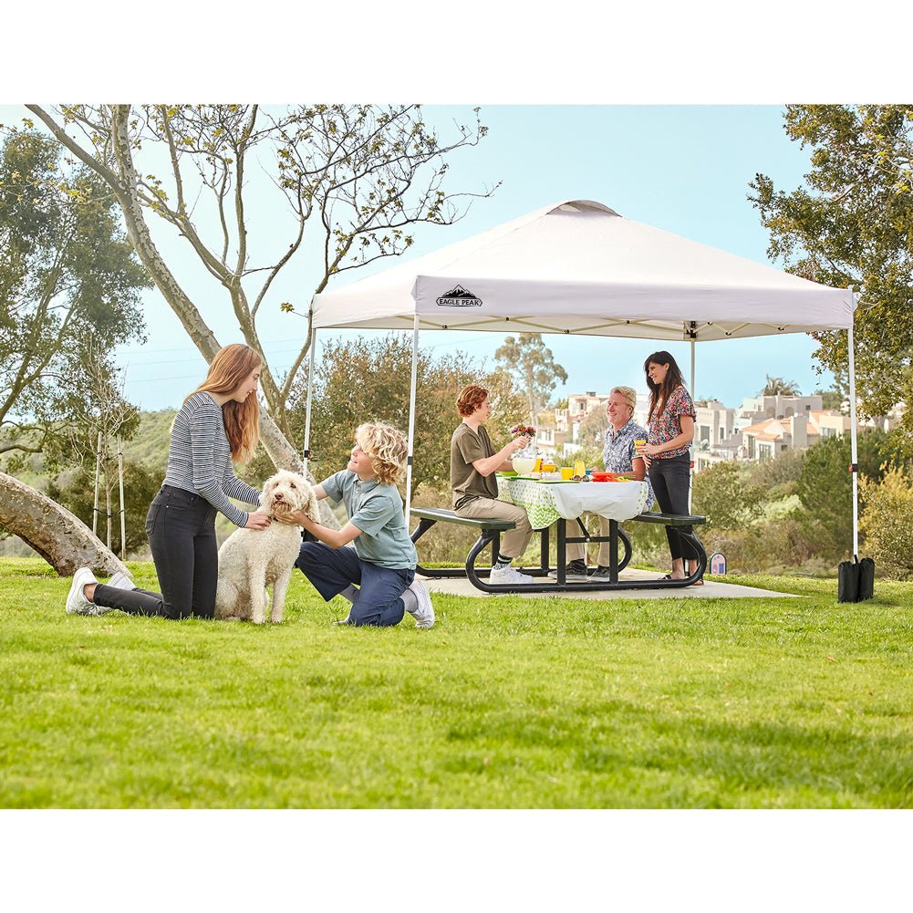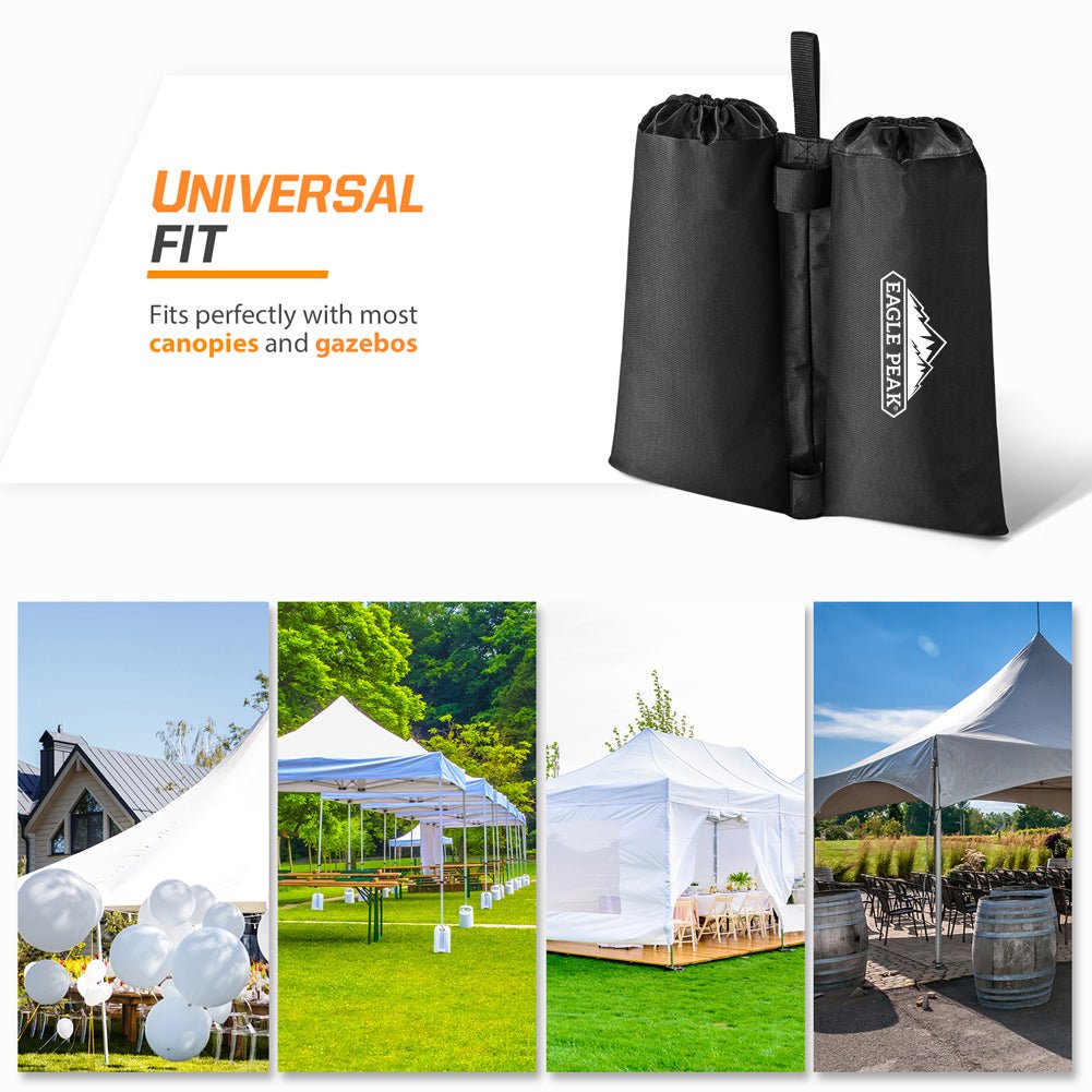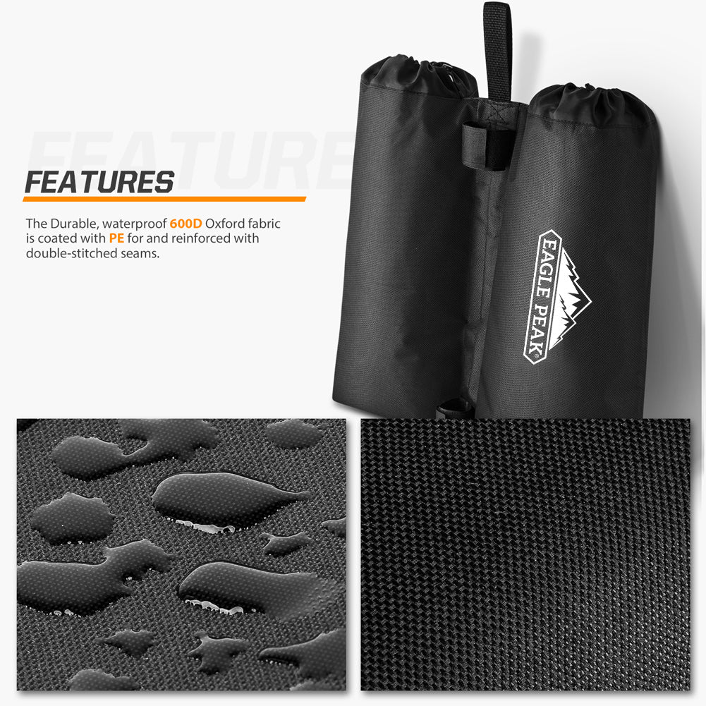 - SAFE & SECURE: 2 self-adhesive straps secure a tight fit around the tent poles. They are compatible with all of our canopies, pop-up tents and gazebos. EAGLE PEAK weight bags are perfect for enhancing stability and adding reinforcement in windy conditions.