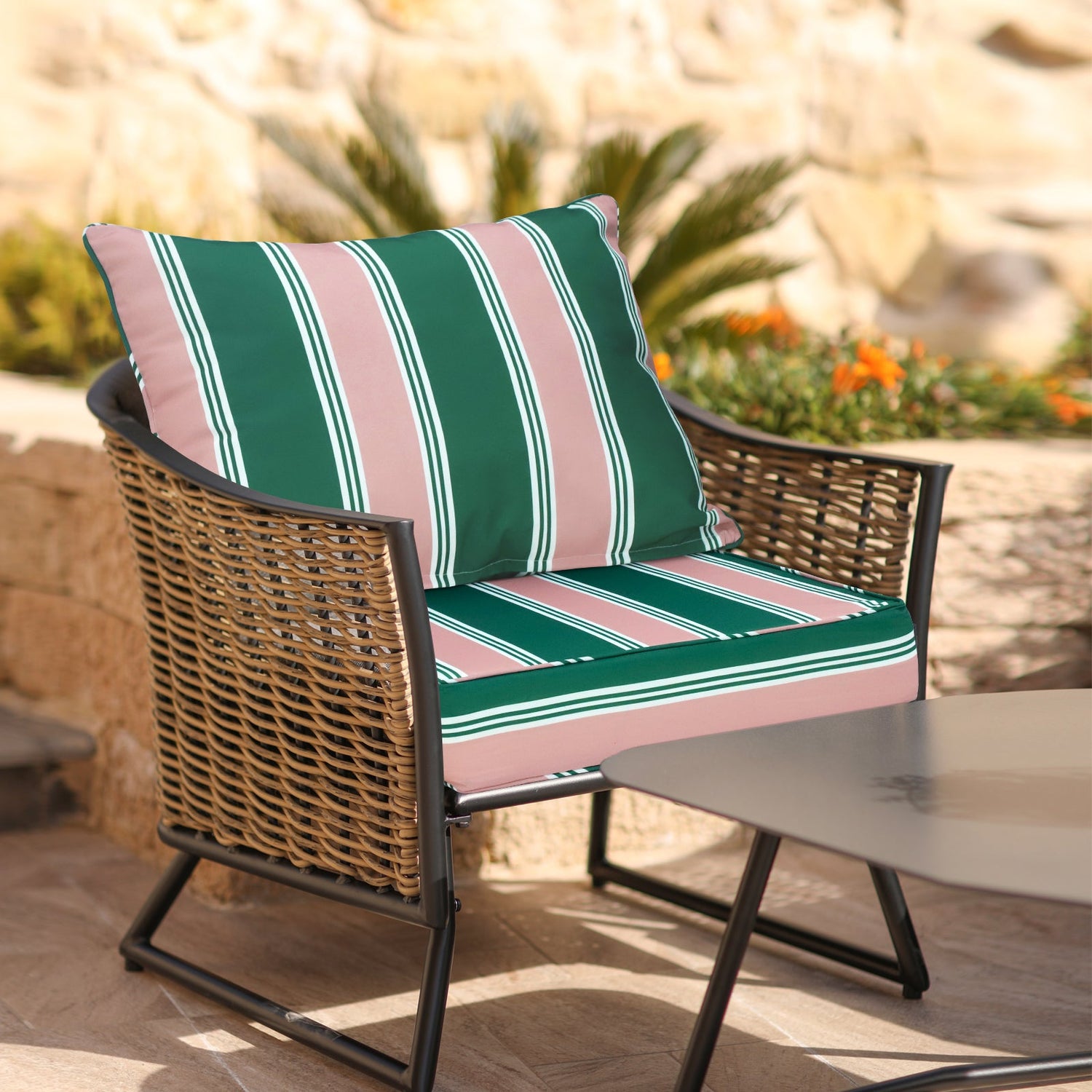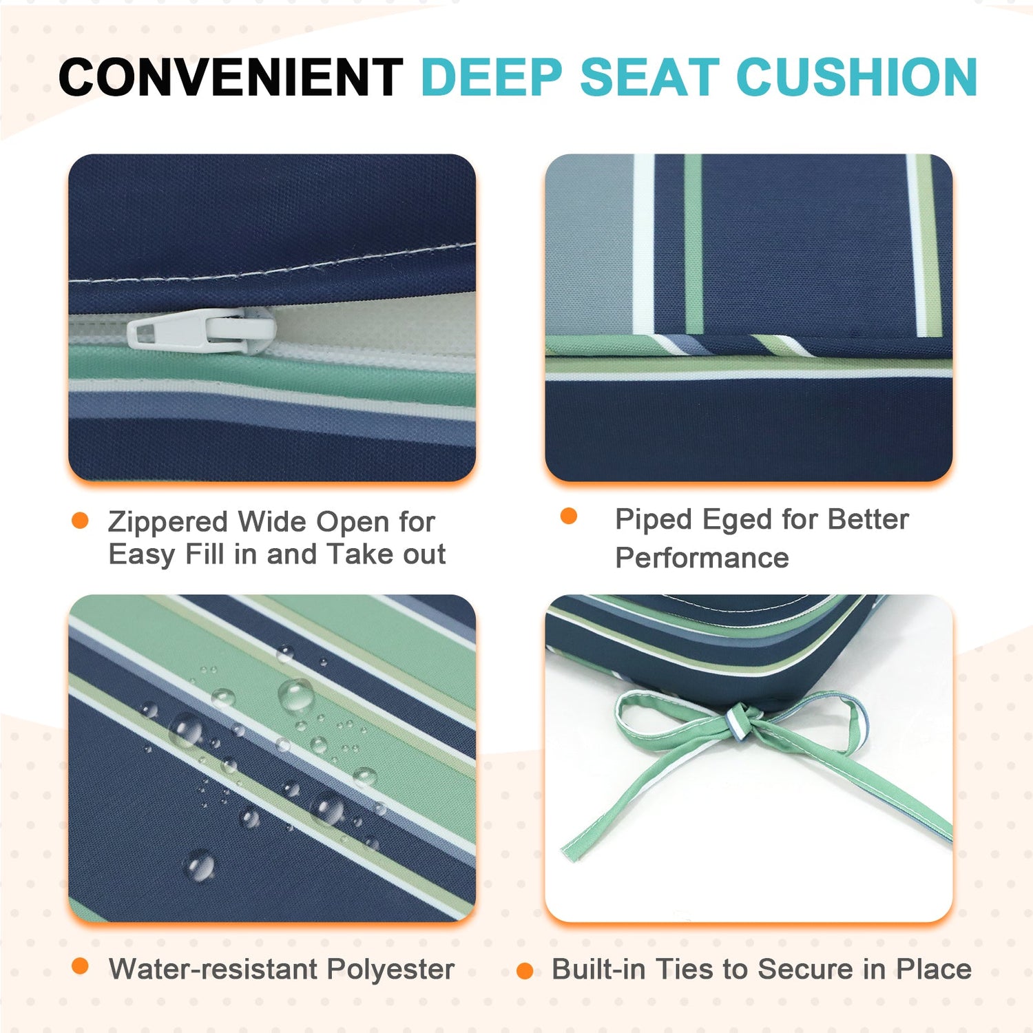 2-Piece Set Cushion: This EAGLE PEAK deep seat cushion set comes with one 25" W x 25" D seat cushion, and one 28" W x 22" H back cushion.