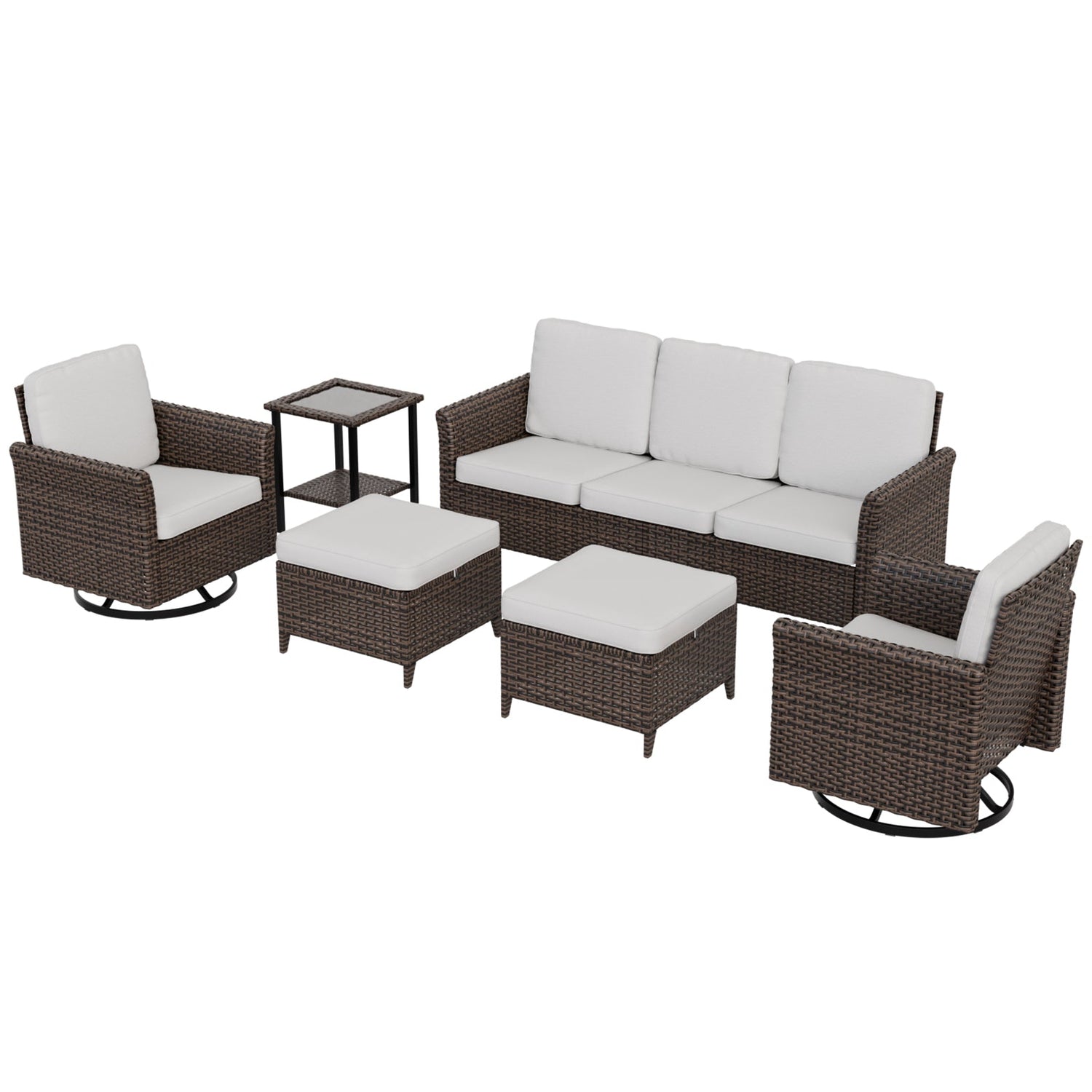 CLASSIC DESIGN: Transform your outdoor space with this timeless 6 piece wicker patio set, featuring a couch, 2 swivel rocking chairs with a smooth 360 degree gentle gliding motion, 2 ottomans, and side table. The combination of woven rattan and deep, soft cushions adds both comfort and style; perfect for patios, decks, porches or backyard lounging.