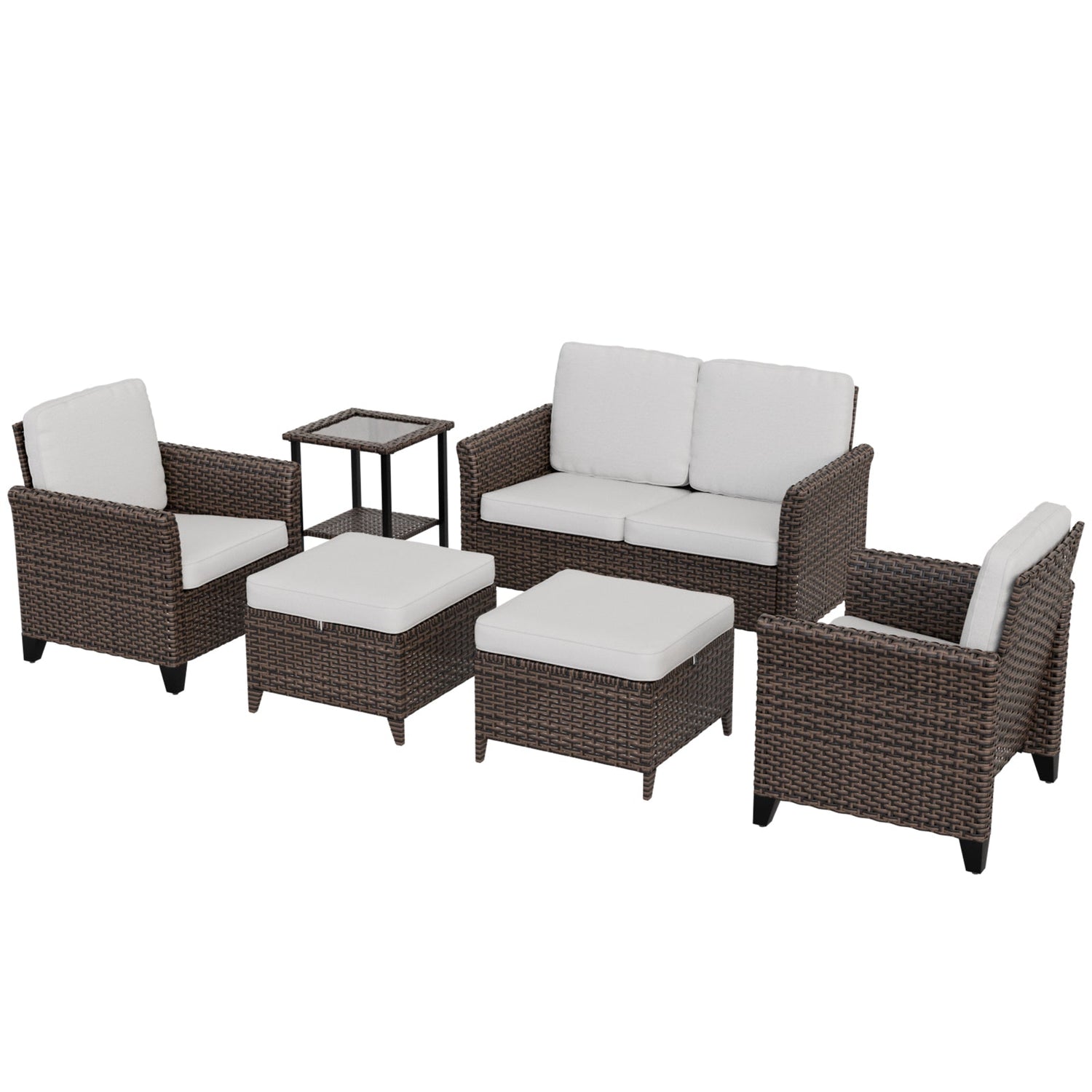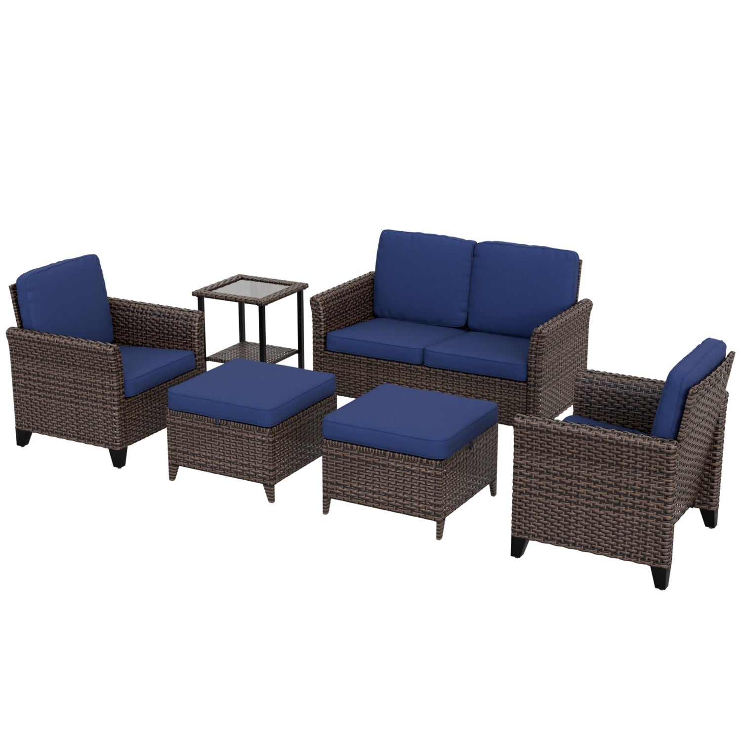 CLASSIC DESIGN: Transform your outdoor space with this timeless 6 piece wicker patio set, featuring a loveseat, 2 patio chairs, 2 ottomans, and side table. The combination of woven rattan and deep, soft cushions adds both comfort and style; perfect for patios, decks, porches or backyard lounging.