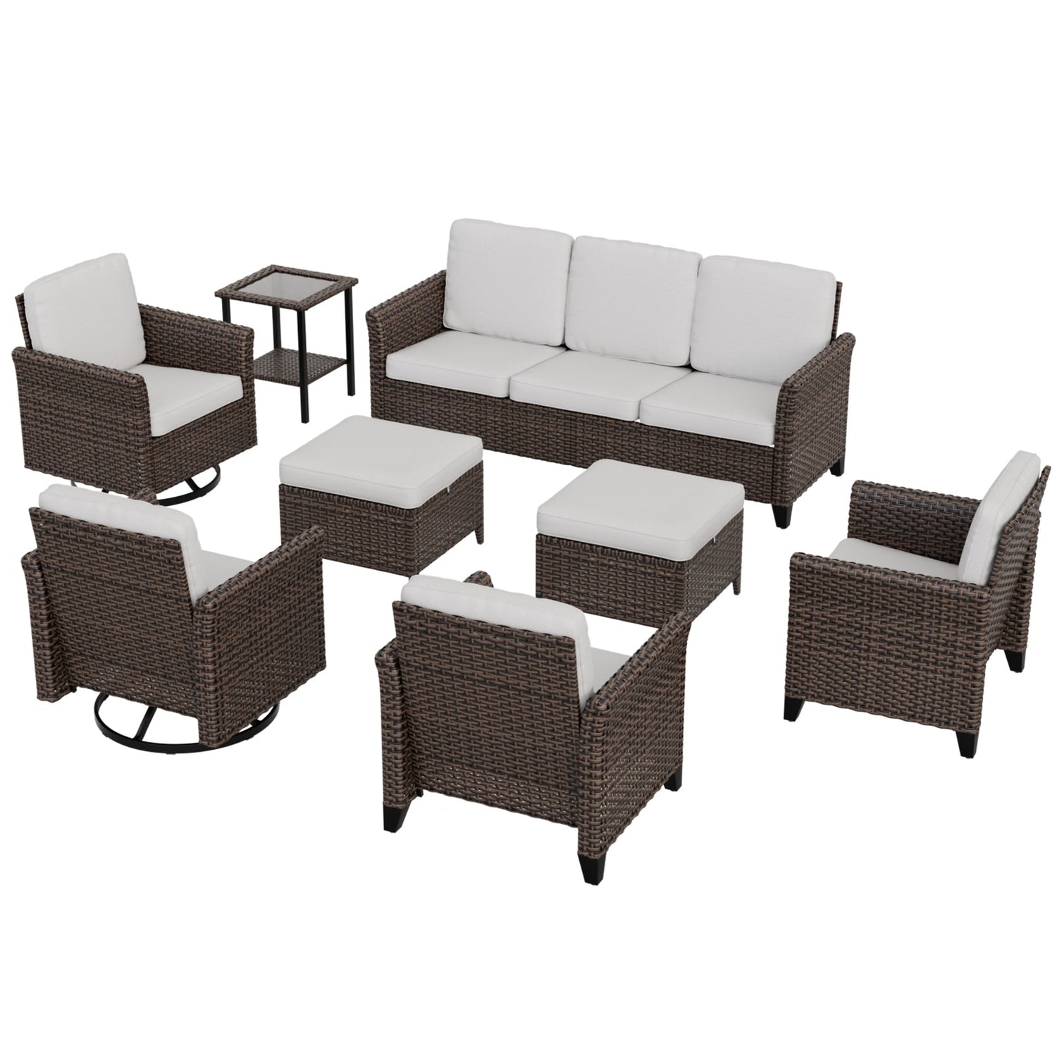 CLASSIC DESIGN: Transform your outdoor space with this timeless 8 piece wicker patio set, featuring a couch, 2 patio chairs, 2 swivel rocking chairs with a 360 gentle gliding motion, 2 ottomans, and side table. The combination of woven rattan and deep, soft cushions adds both comfort and style; perfect for patios, decks, porches or backyard lounging.