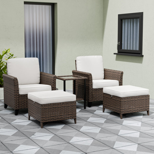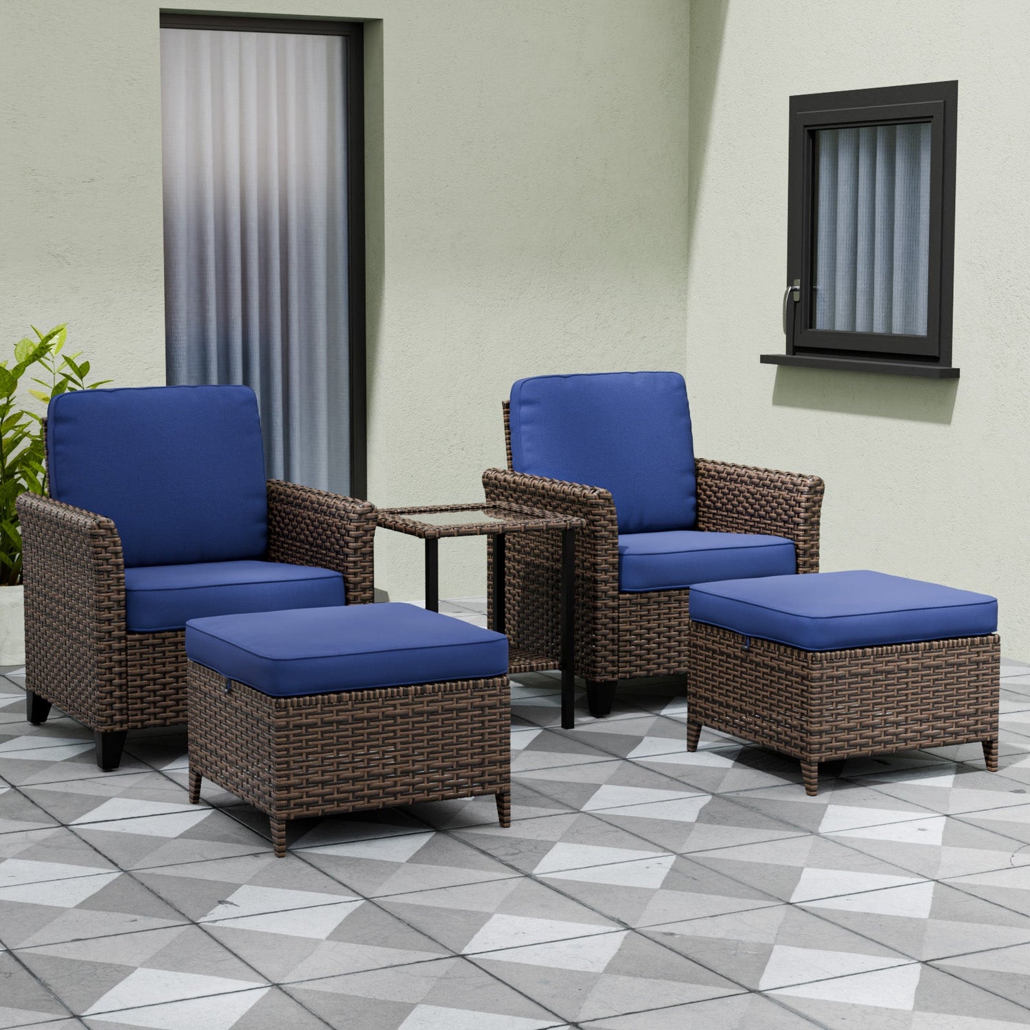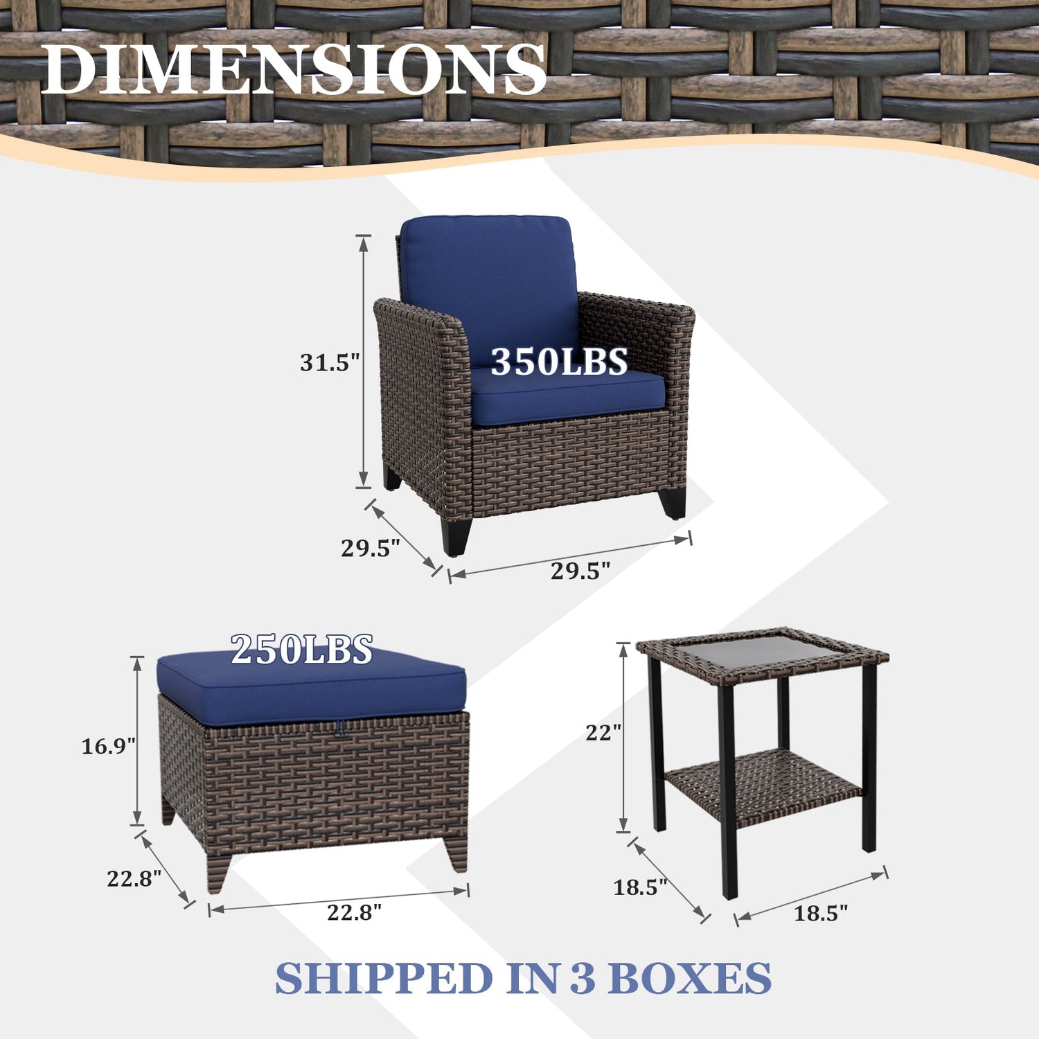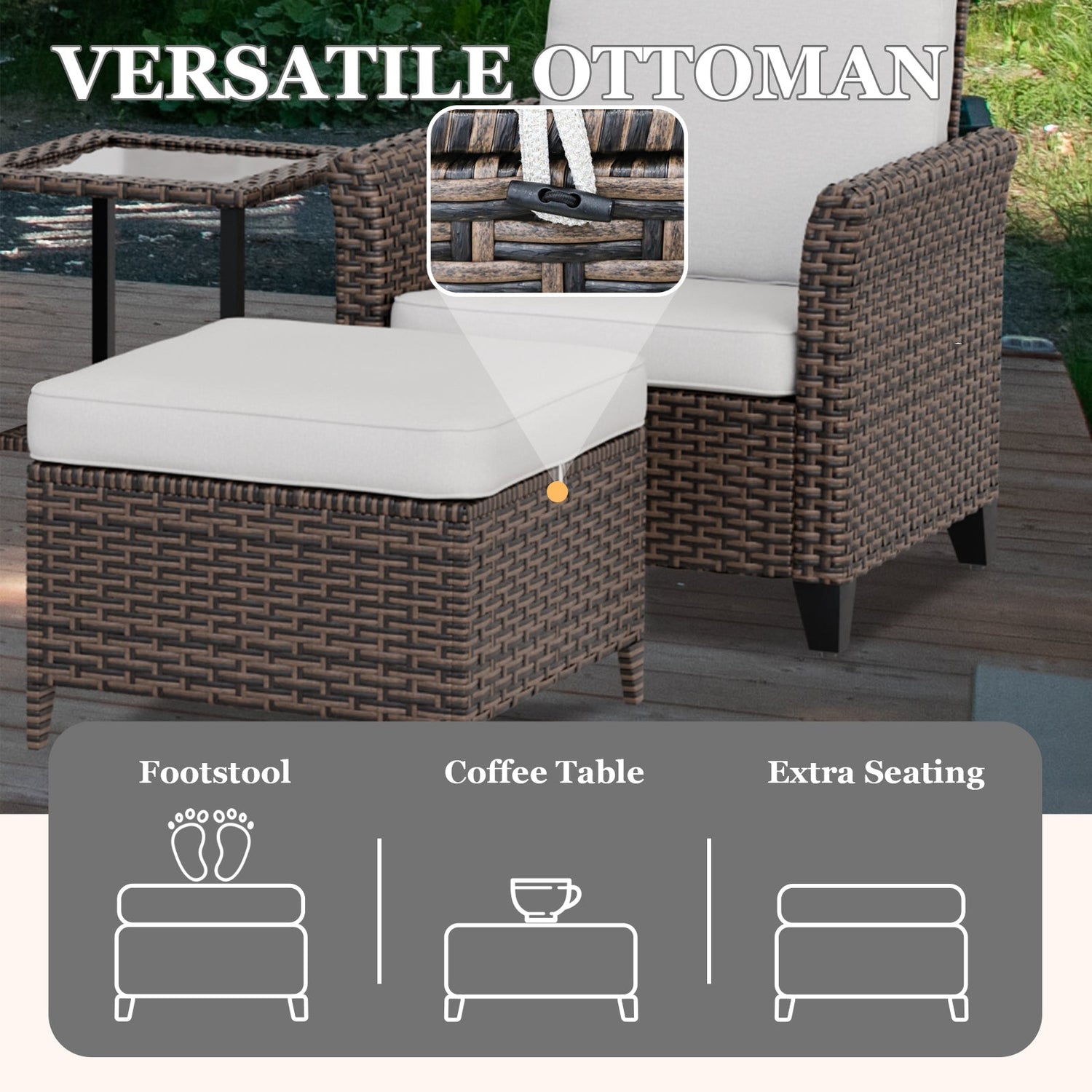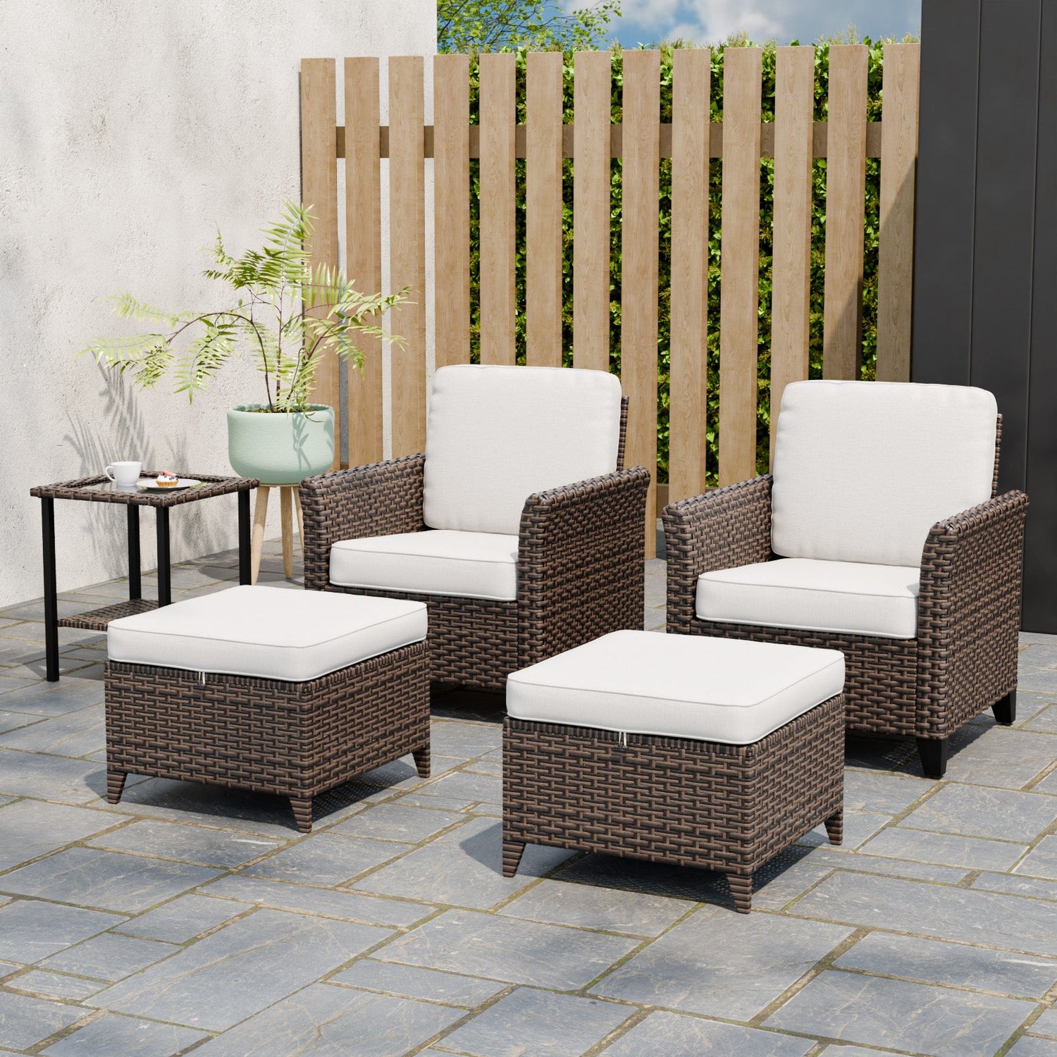 CLASSIC DESIGN: Transform your outdoor space with this timeless 5 piece wicker patio set, featuring 2 patio chairs, 2 ottomans, and side table. The combination of woven rattan and deep, soft cushions adds both comfort and style; perfect for patios, decks, porches or backyard lounging.