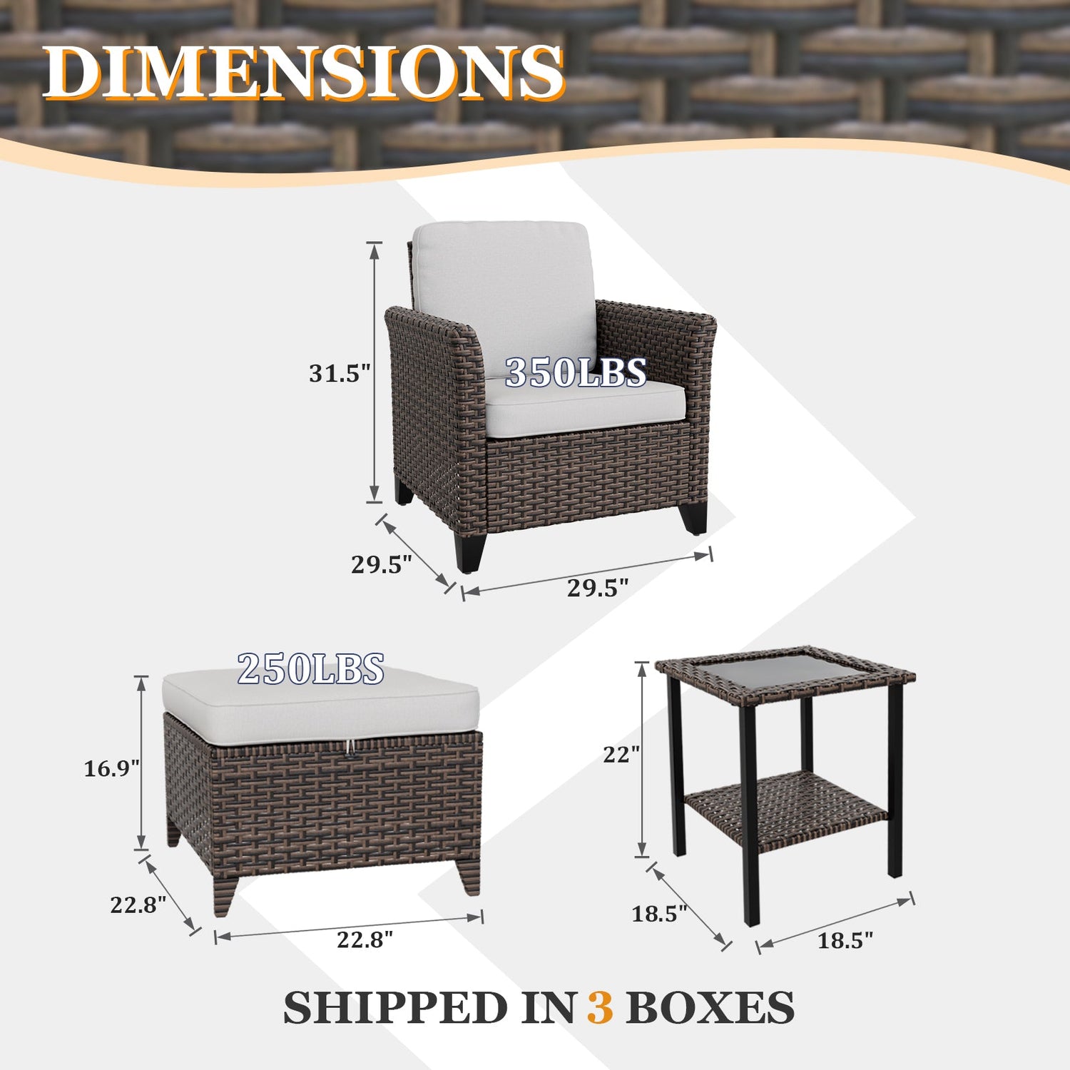 SIZED FOR OUTDOORS: Each chair measures 29.5" W x 29.5" D x 31.5" H, that supports up to 250 lbs per chair; ottomans measure 22.8" W x 22.8" D x 14.2" H and the side table measures 18.5"W x 18.5"D x 22"H.
