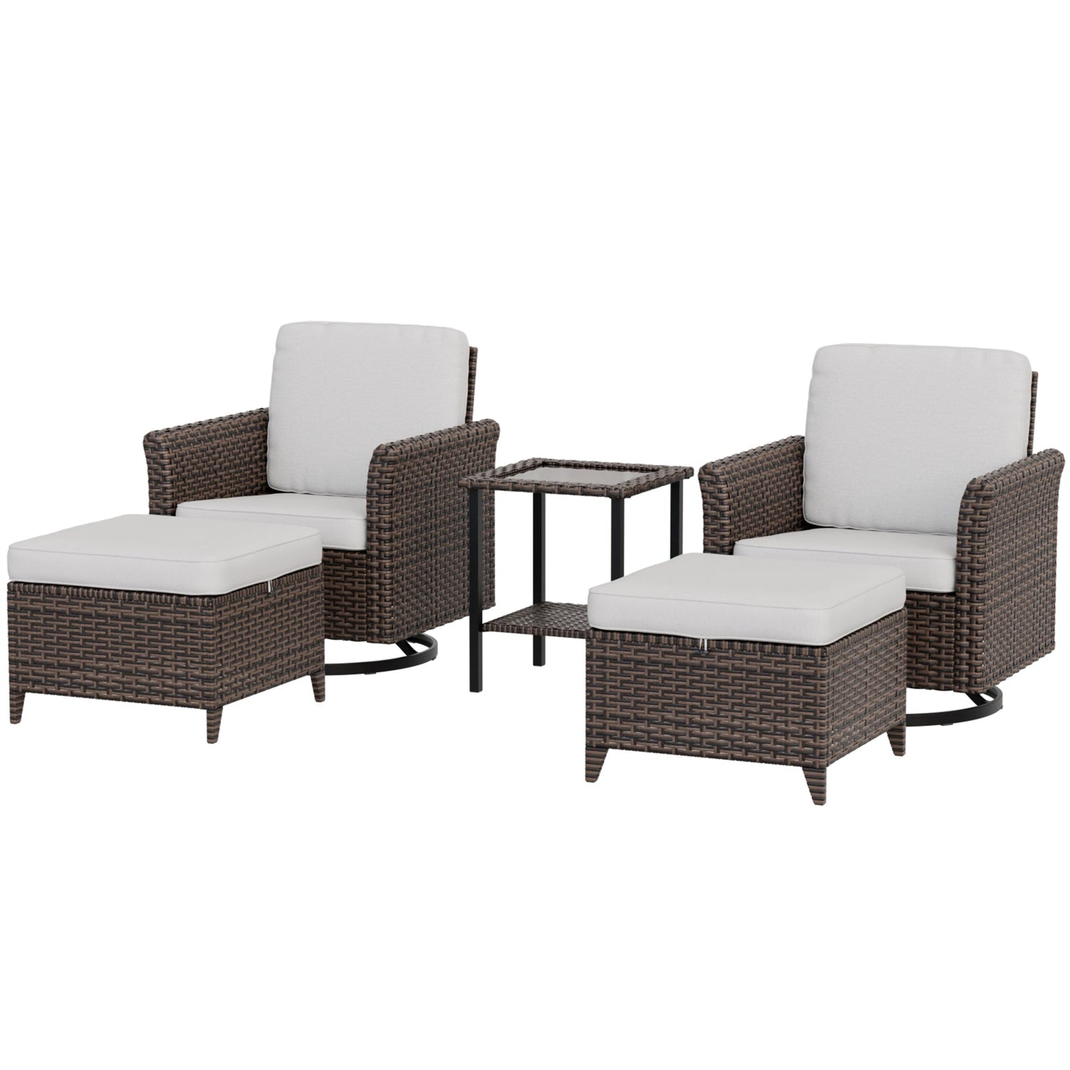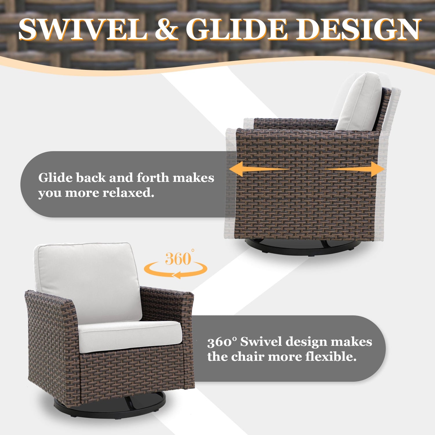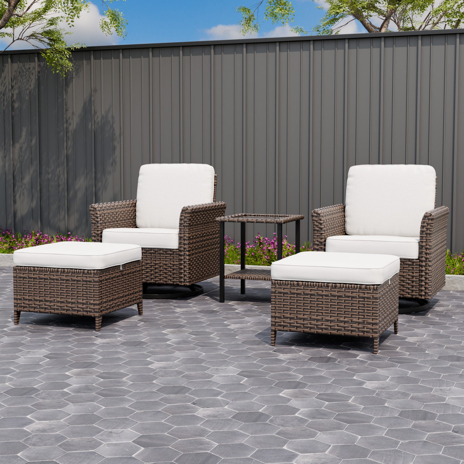 CLASSIC DESIGN: Transform your outdoor space with this timeless 5 piece wicker patio set, featuring 2 swivel rocking chairs with a smooth 360 degree gentle gliding motion, 2 ottomans, and side table. The combination of woven rattan and deep, soft cushions adds both comfort and style; perfect for patios, decks, porches or backyard lounging.