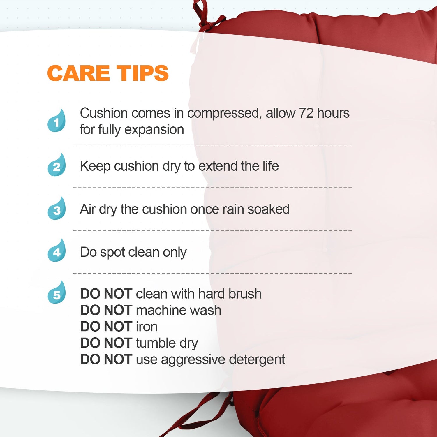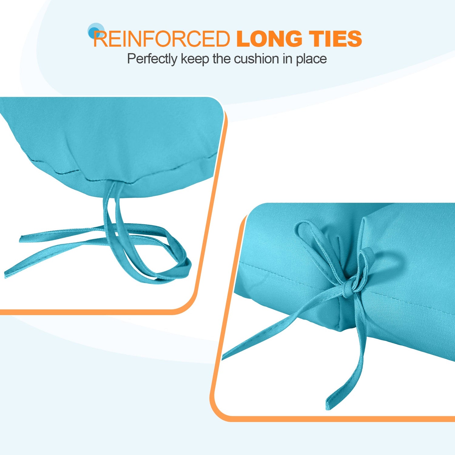 REINFORCED TIES: Features four long ties that help keep the cushion safely attached to furniture and keep the cushion in place. It is recommended to store or cover it when not in use to maintain the product.