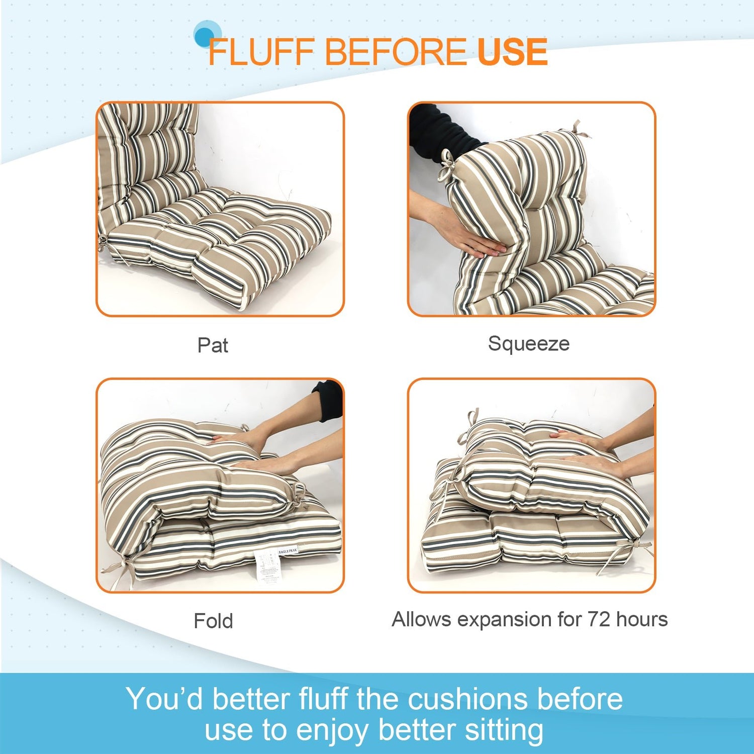 EASY TO CLEAN: The seat part measures L 21" x W 21" x thick 4", back part measures L 21"x W 21" x thick 4". Allow up to 72 hours for fully expansion. The cushions are reversible and easy to clean. Lightly dab the fabric with mild soap and warm water, then air dry.