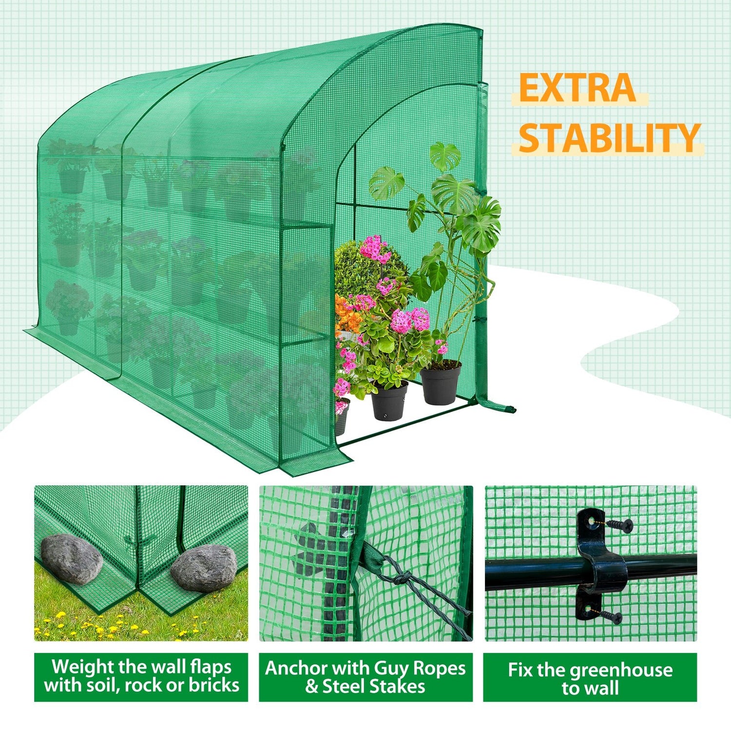 SHELF INCLUDED: This walk-in, lean-to greenhouse features a sturdy flower rack, offering a convenient space to organize and display your plants. The shelf provides ample room for seedlings, potted plants, or gardening tools, helping you maximize growing space and maintain an organized environment.
