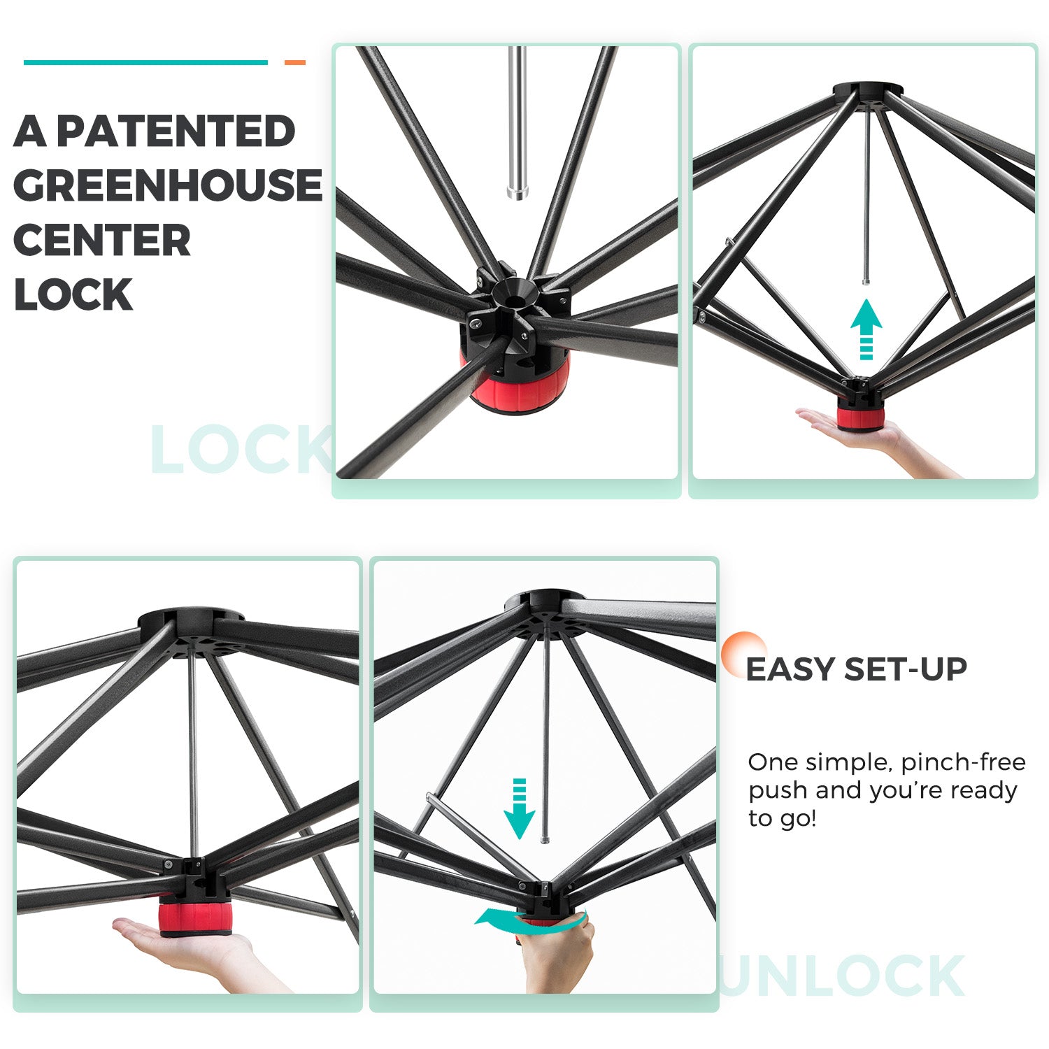 EASY SETUP: This easy setup pop up greenhouse plant tent features the Peak Push system, a patented greenhouse center lock. The portable greenhouse requires no tools and easily opens and closes from the center in seconds. Its unique greenhouse center lock enables a quick, one person setup, letting you maximize gardening with minimal effort.