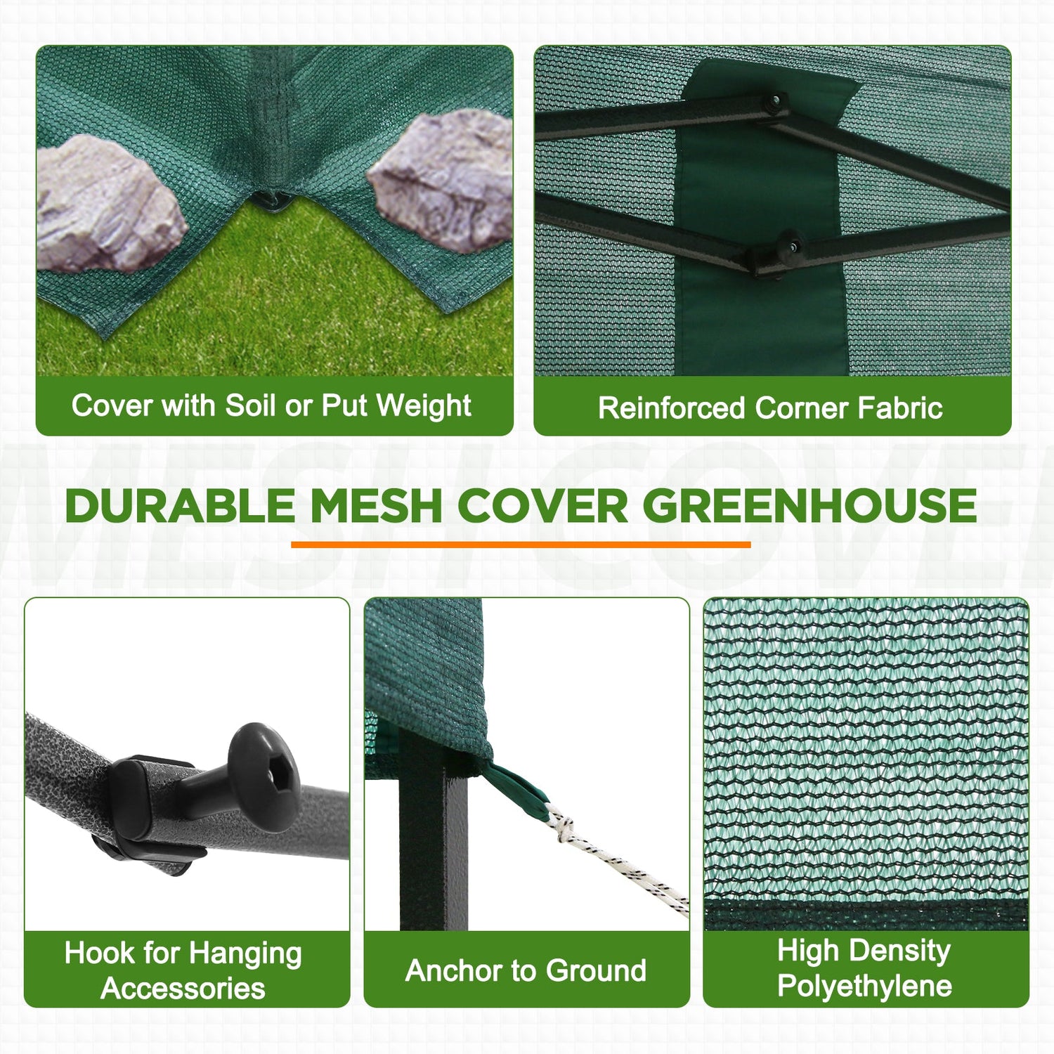 Premium HDPE Cover: The green shade cloth is made of 135gsm stabilized high density polyethylene (HDPE). It blocks 70% of UV rays and will keep out unwanted birds and flying. It is an ideal greenhouse for gardening.