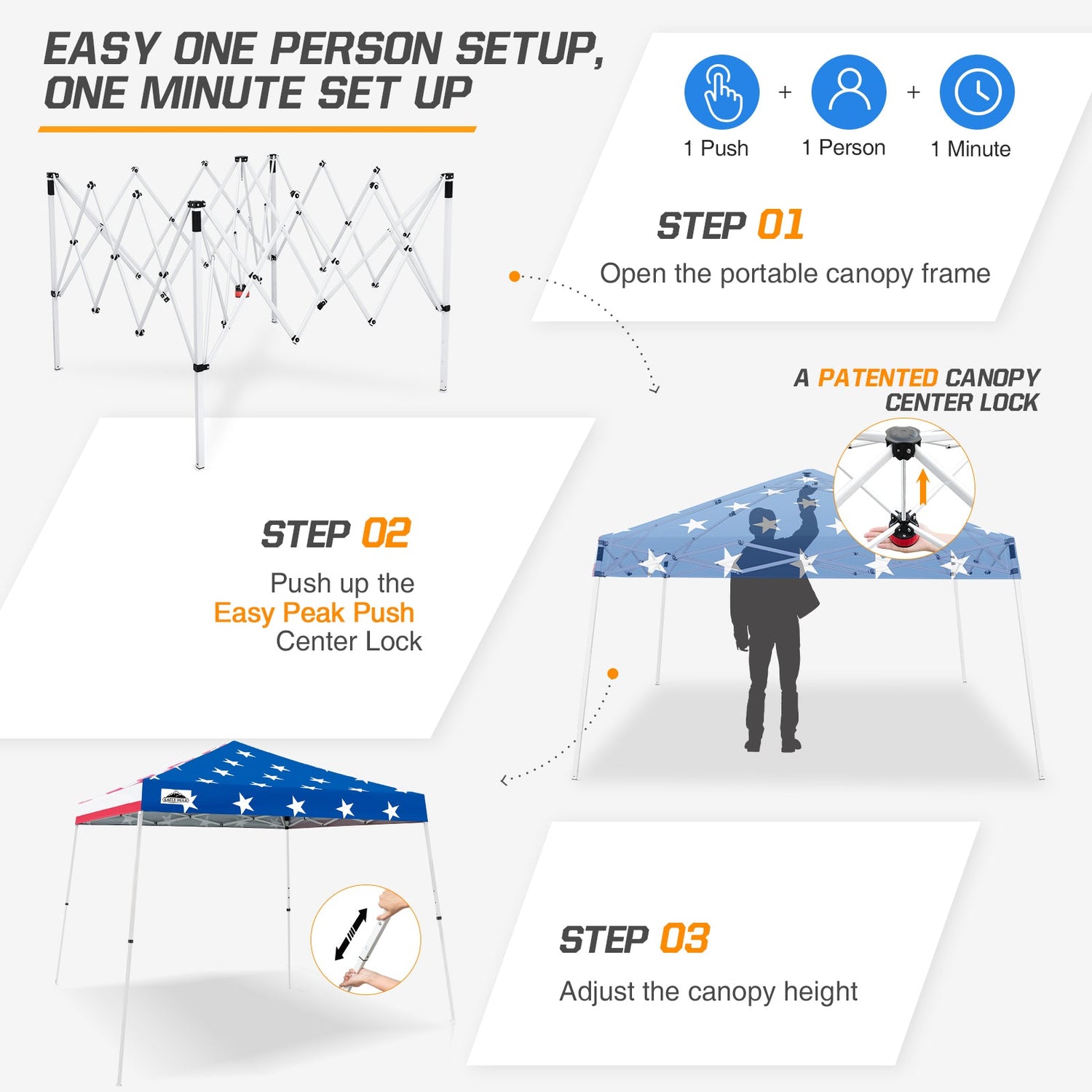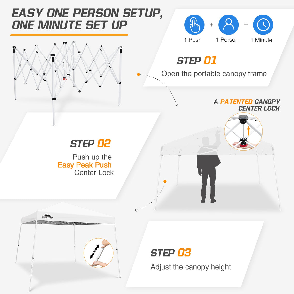 EASY SETUP: This easy setup pop up canopy tent features the Peak Push system, a patented canopy center lock.  The portable canopy requires no tools and easily opens and closes from the center in seconds. Its unique canopy tent center lock enables a quick, one person setup, letting you maximize outdoor time with minimal effort.