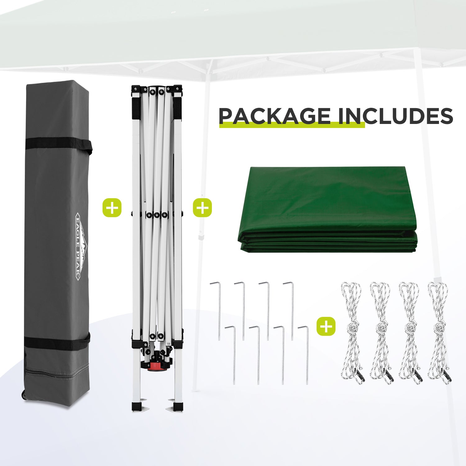 EASY SETUP: This easy setup pop up canopy tent features the Peak Push system, a patented canopy center lock.  The portable canopy requires no tools and easily opens and closes from the center in seconds. Its unique canopy tent center lock enables a quick, one person setup, letting you maximize outdoor time with minimal effort.