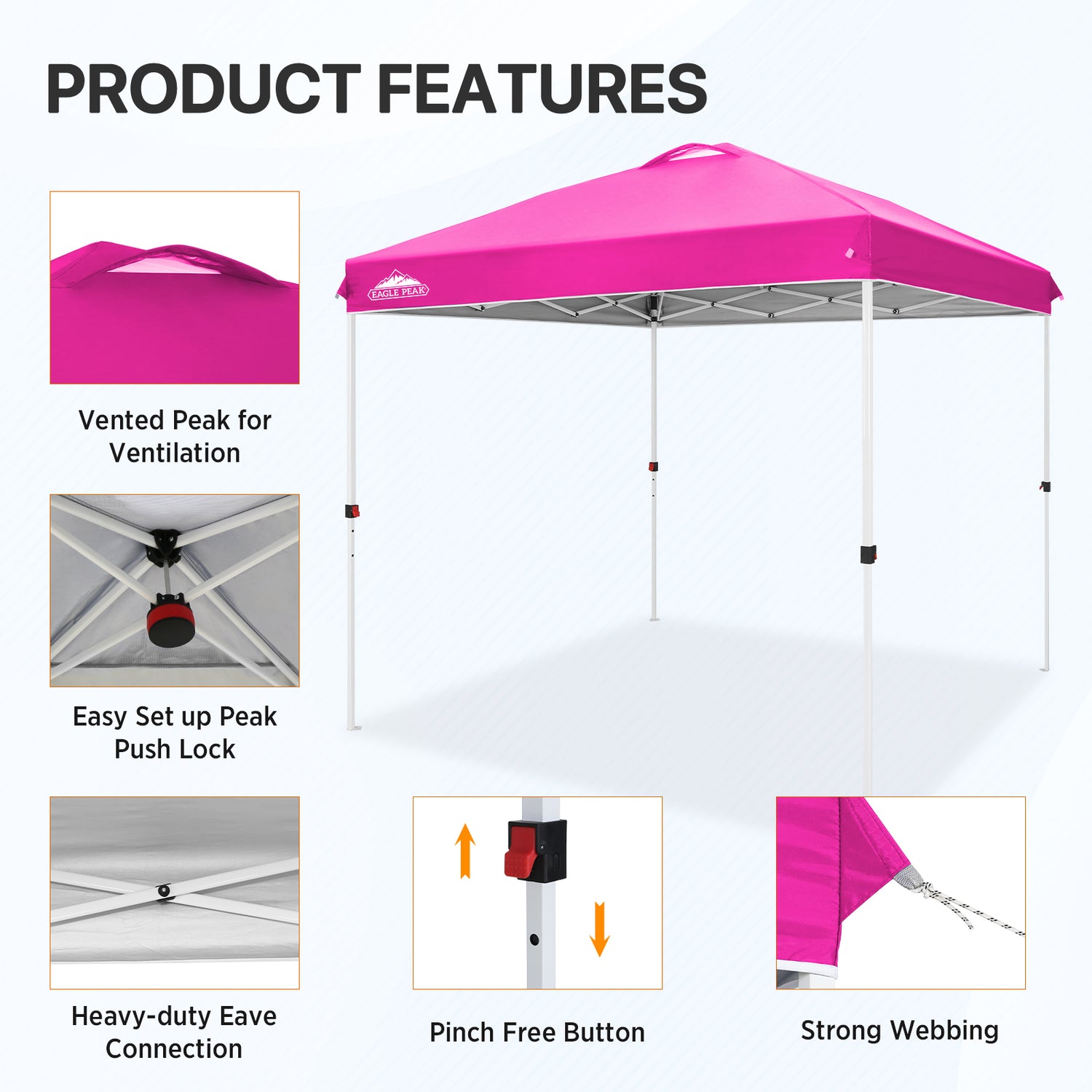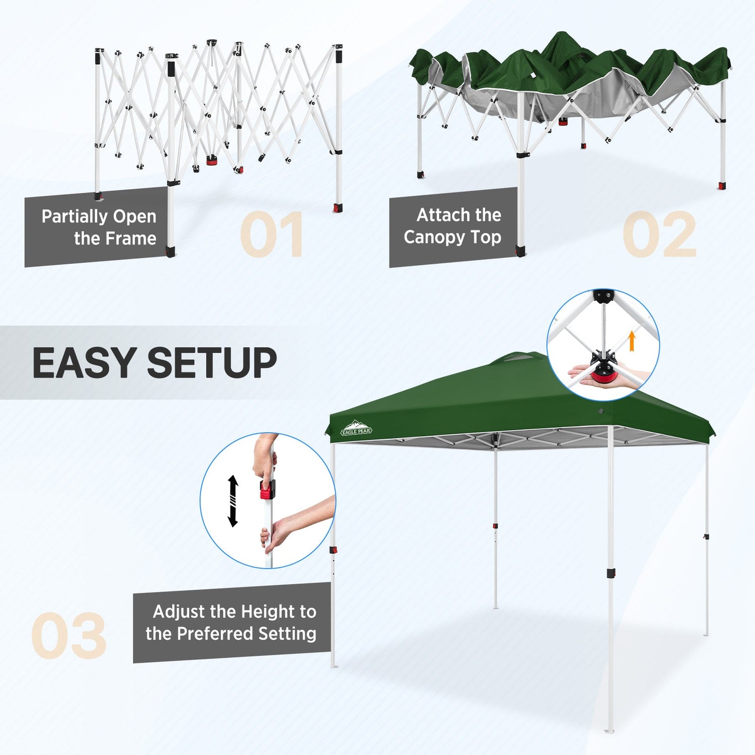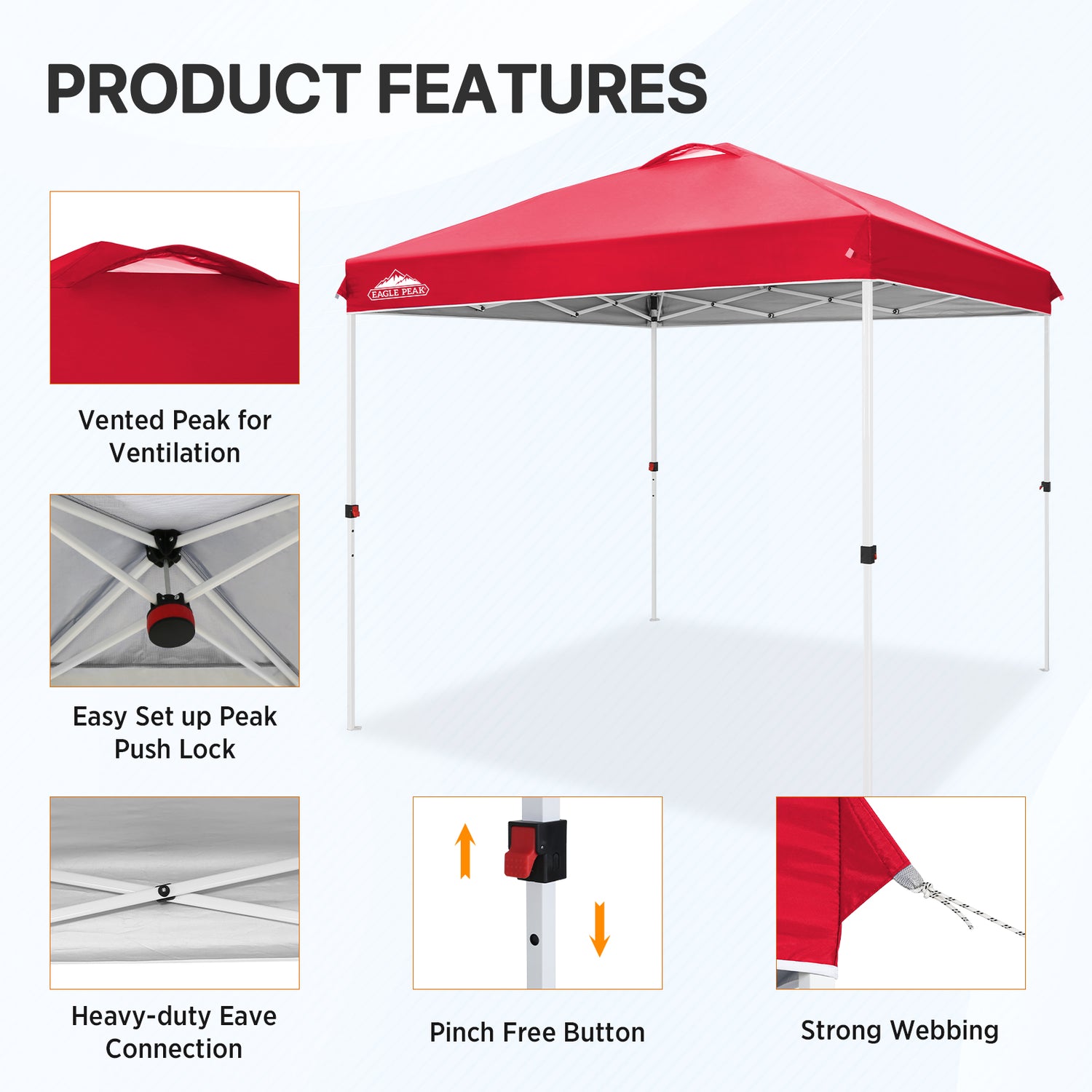 EASY SETUP: Say goodbye to complicated setups; this easy setup pop up canopy tent features the Peak Push system, a patented canopy center lock. This portable canopy requires no tools and easily opens and closes from the center in seconds. Its unique canopy tent center lock enables a seamless, one person setup, letting you maximize outdoor time with minimal effort.