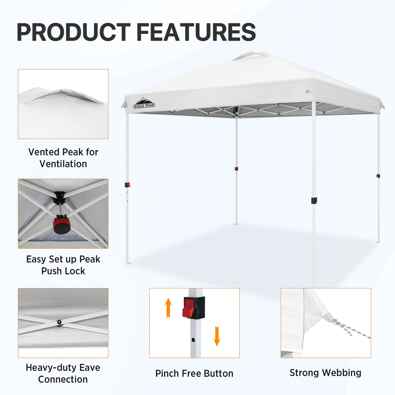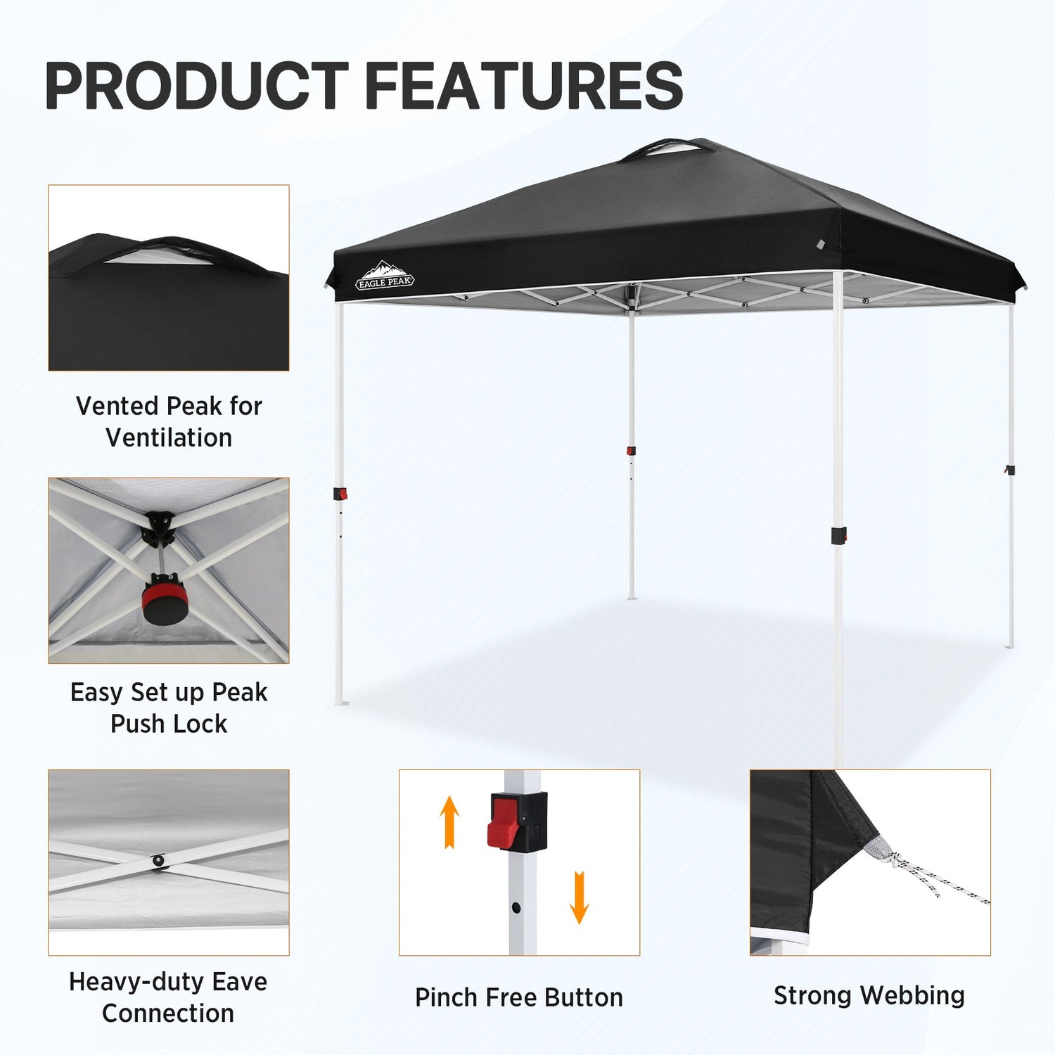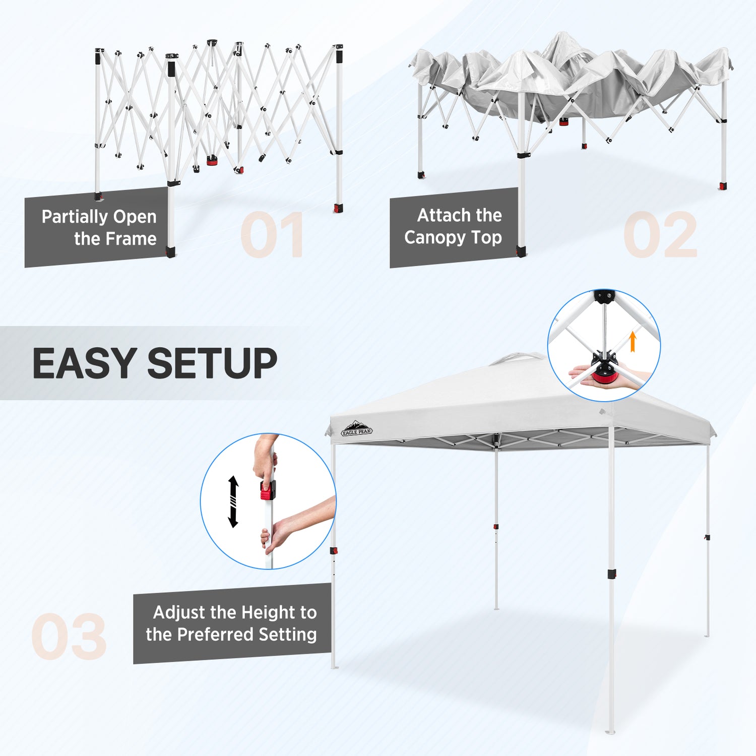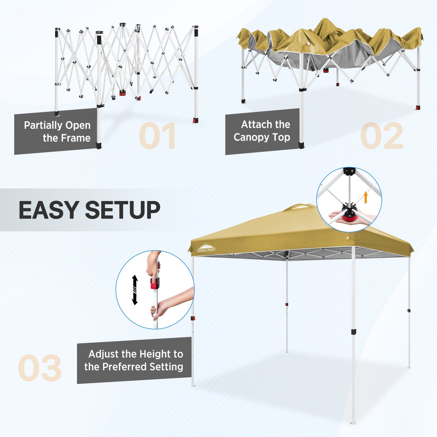 EASY SETUP: Say goodbye to complicated setups; this easy setup pop up canopy tent features the Peak Push system, a patented canopy center lock. This portable canopy requires no tools and easily opens and closes from the center in seconds. Its unique canopy tent center lock enables a seamless, one person setup, letting you maximize outdoor time with minimal effort.