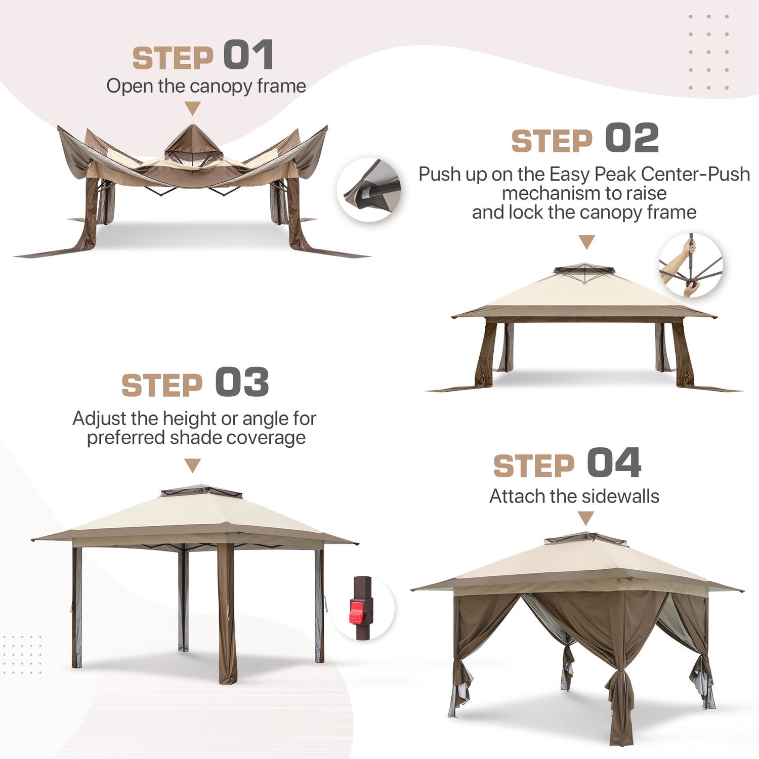 EASY SETUP: This easy setup pop up gazebo tent features the Peak Push system, a patented gazebo center lock. The portable gazebo requires no tools and easily opens and closes from the center in seconds. Its unique gazebo tent center lock enables a quick, one person setup, letting you maximize outdoor time with minimal effort.