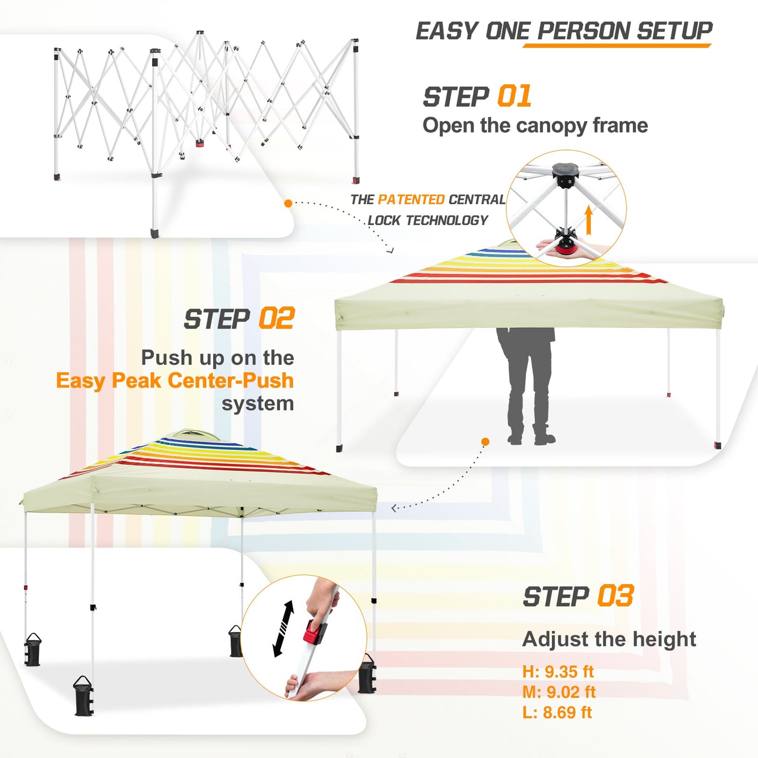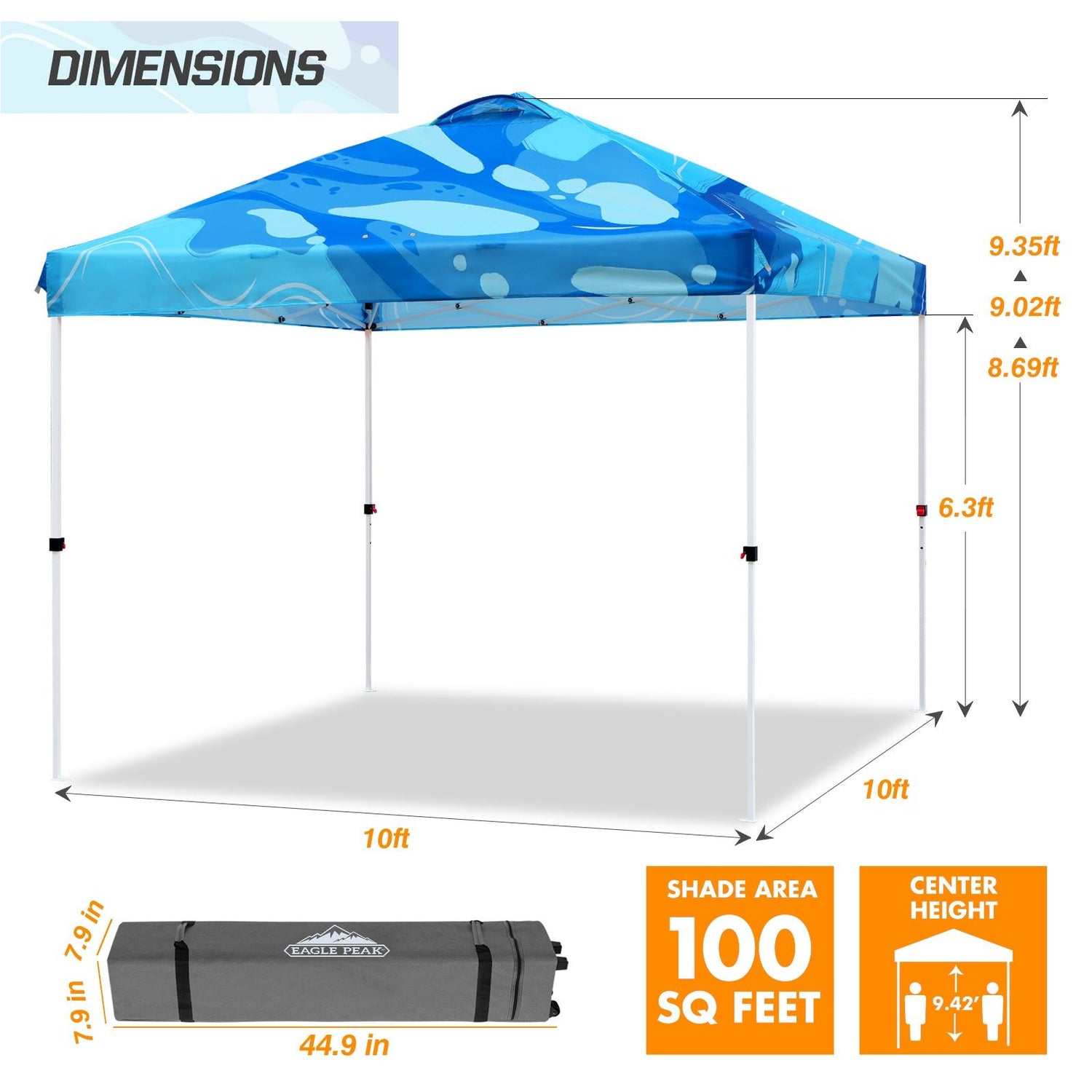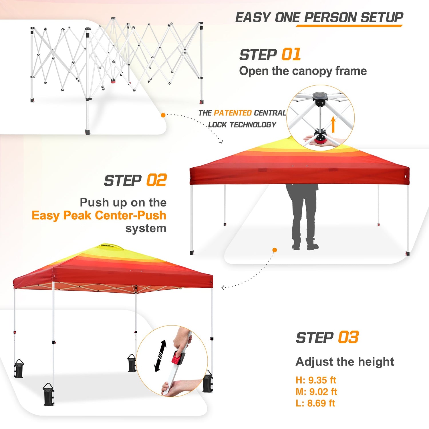 EASY SETUP: This easy setup pop up canopy tent features the Peak Push system, a patented canopy center lock. The portable canopy requires no tools and easily opens and closes from the center in seconds. Its unique canopy tent center lock enables a quick, one person setup, letting you maximize outdoor time with minimal effort.