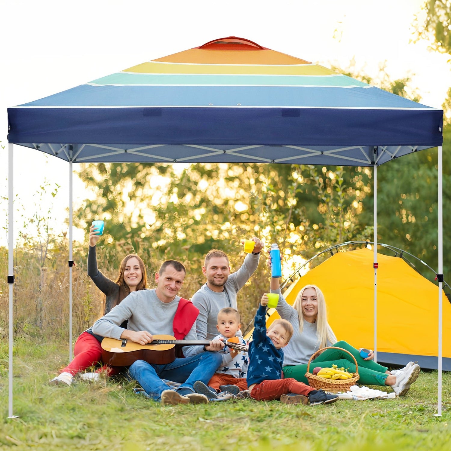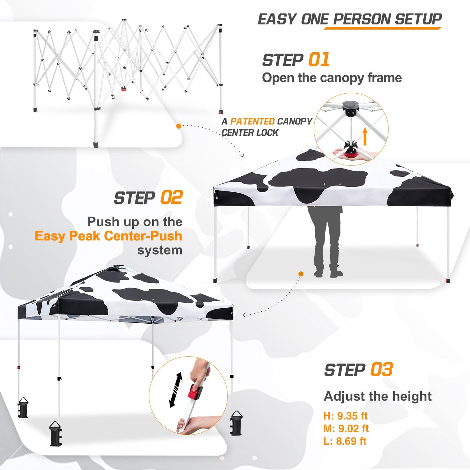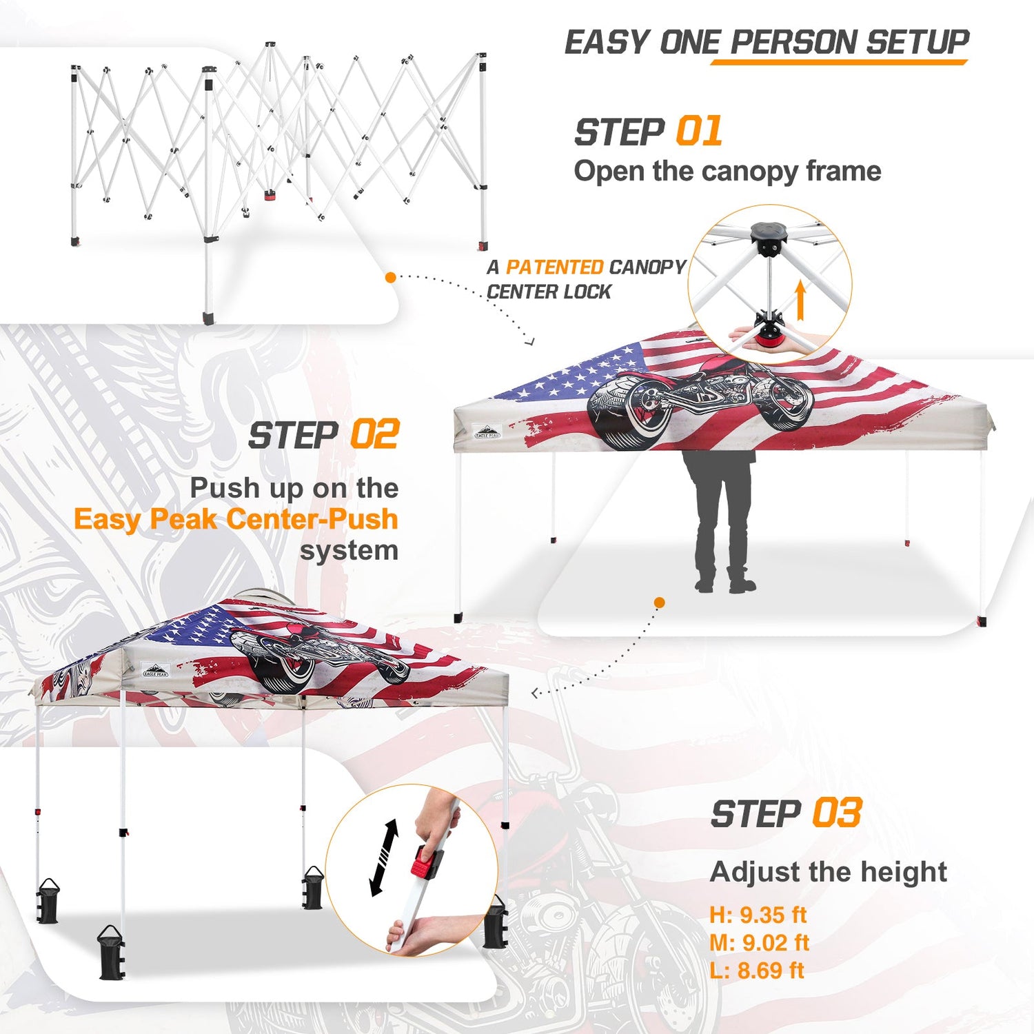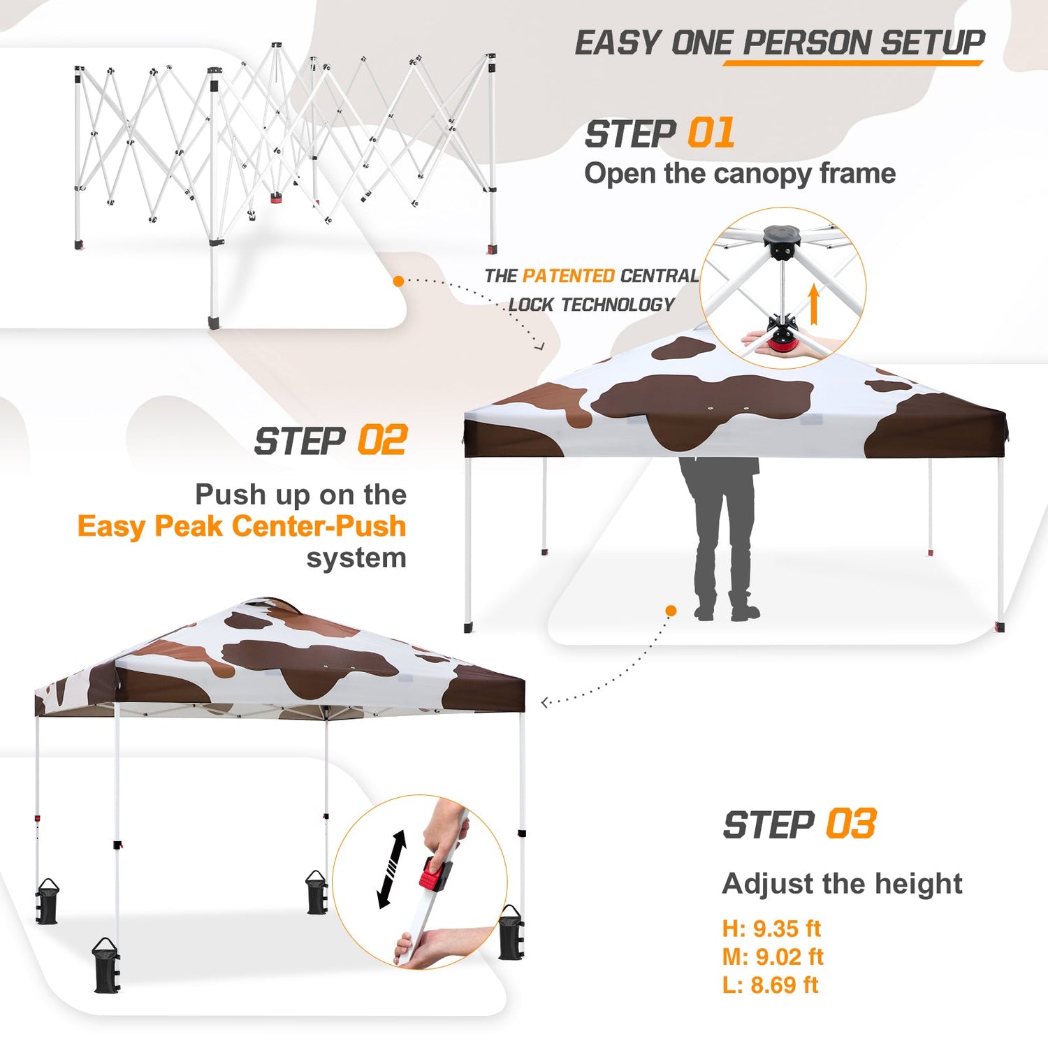 EASY SETUP: This easy setup pop up canopy tent features the Peak Push system, a patented canopy center lock. The portable canopy requires no tools and easily opens and closes from the center in seconds. Its unique canopy tent center lock enables a quick, one person setup, letting you maximize outdoor time with minimal effort.