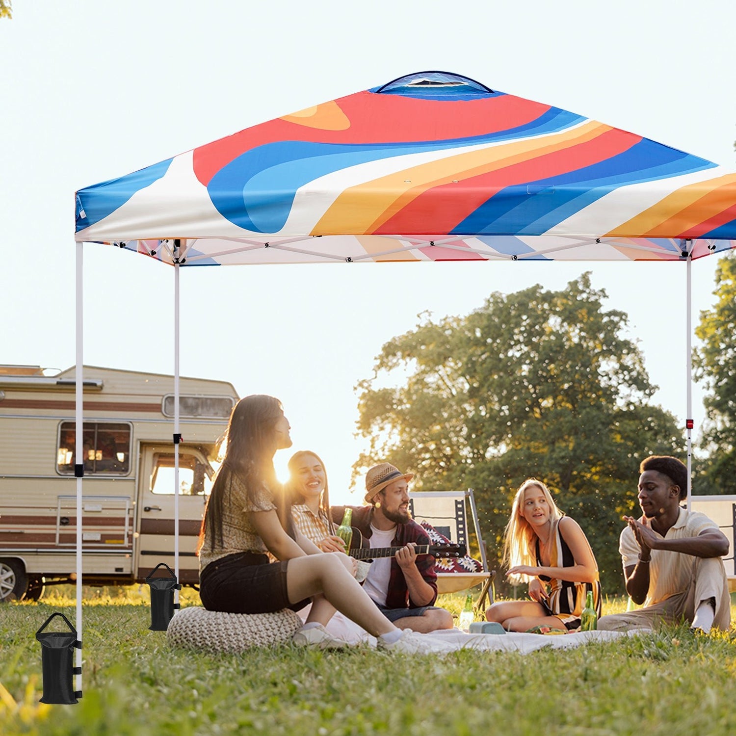 UNIQUE PRINTED FABRIC: Add a groovy design and fun colors to your next outdoor outing. Stand out in the crowd with this unique full coverage digital printing EAGLE PEAK 10x10 instant canopy. Our Shade GraphiX tops use dye sublimation printing which results in a vibrant and color rich canopy top on the entire peak and valence.