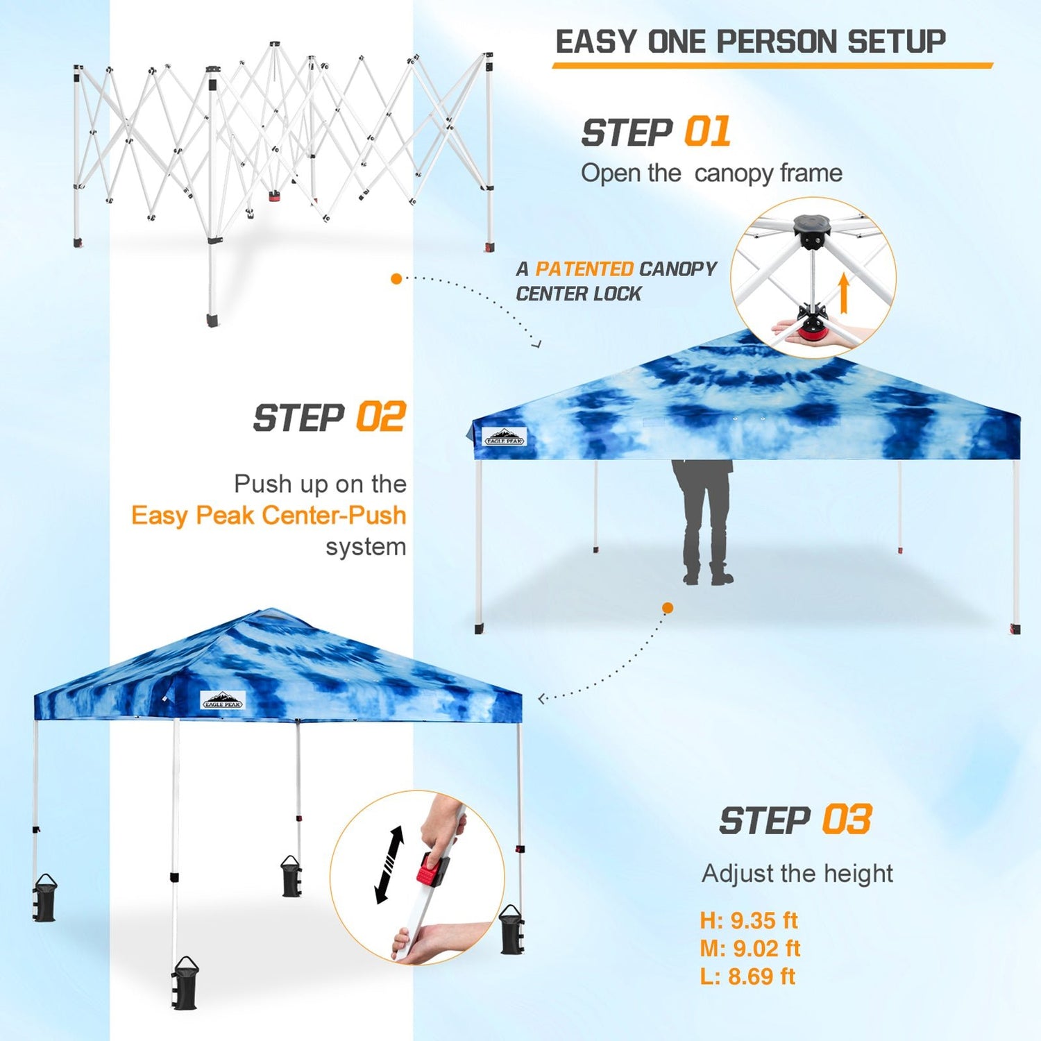 EASY SETUP: This easy setup pop up canopy tent features the Peak Push system, a patented canopy center lock.  The portable canopy requires no tools and easily opens and closes from the center in seconds. Its unique canopy tent center lock enables a quick, one person setup, letting you maximize outdoor time with minimal effort.