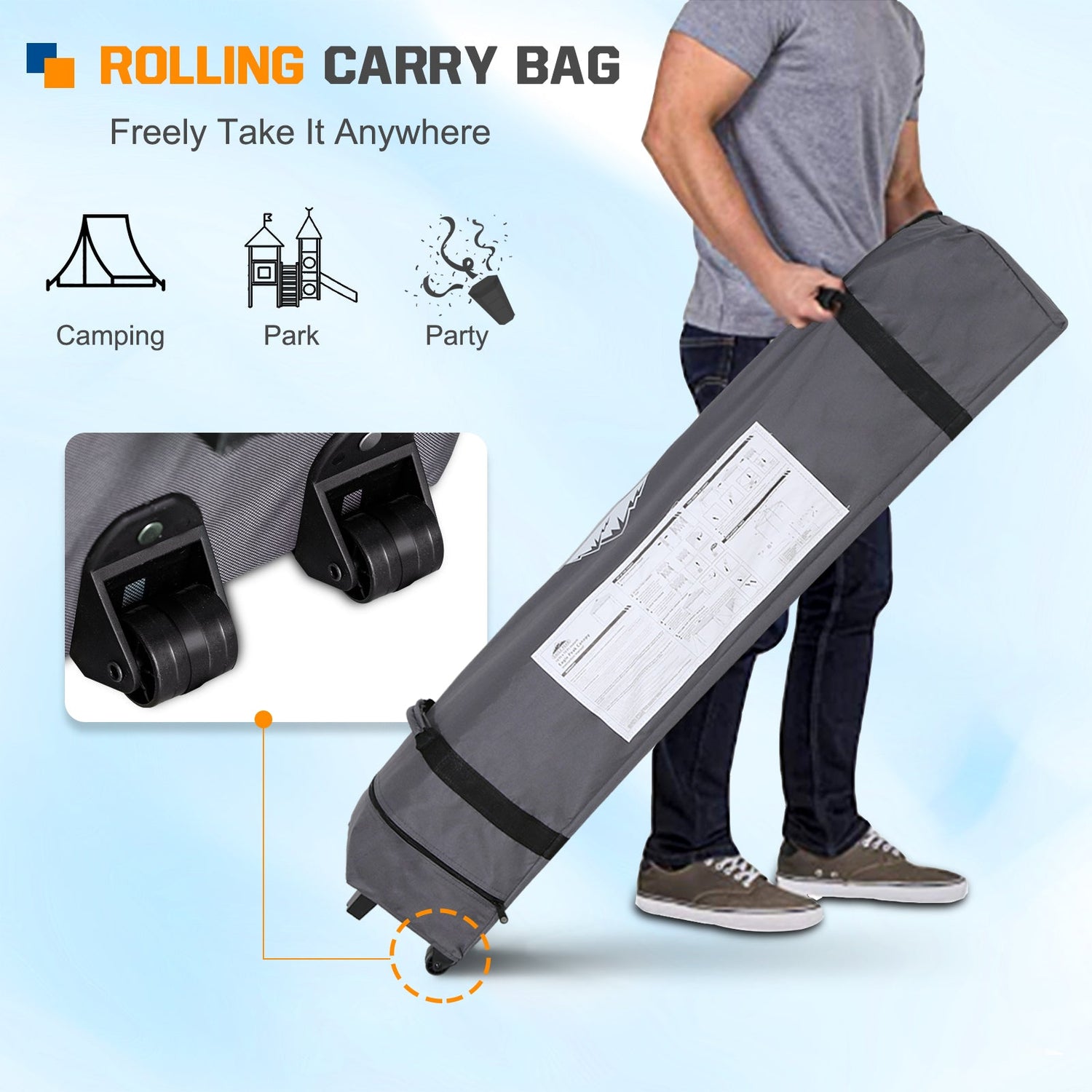 UPGRADED PACKAGE: This 10x10 ft instant canopy comes with 1 x canopy frame, 1 x canopy top, 1 x roller bag, 4 x guy ropes, 8 x steel stakes. Take this canopy with you anywhere using the portable compact 600x300D wheeled carrying bag.