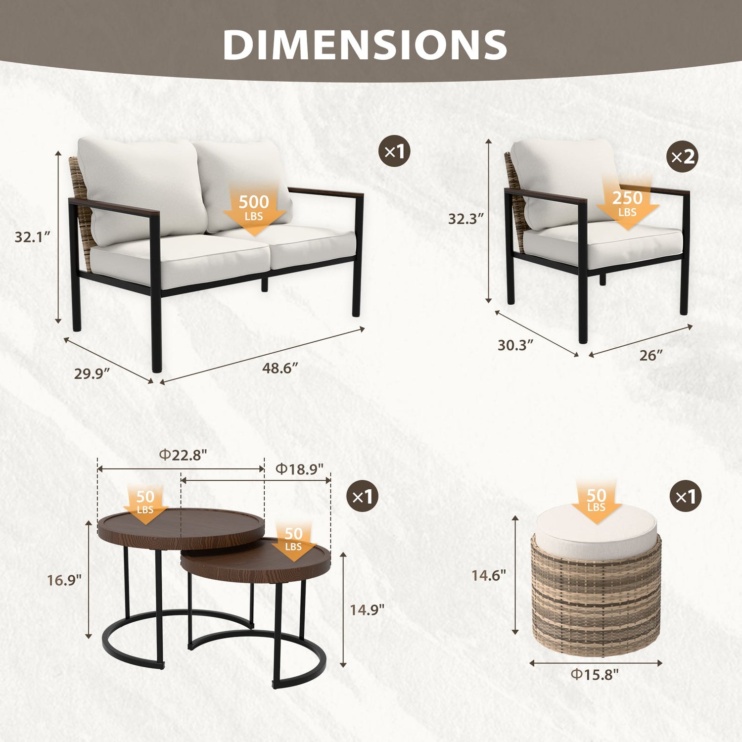 SPACIOUS & COMPACT DESIGN: Chairs measures 25.9" W x 30.3" D x 32.3" H and supports 250 lbs; Loveseat sofa measures 48.6" W x 29.9" D x 32.9" H" and supports up to 500 lbs; tables measure 16.9" tall with a diameter of 22.8".