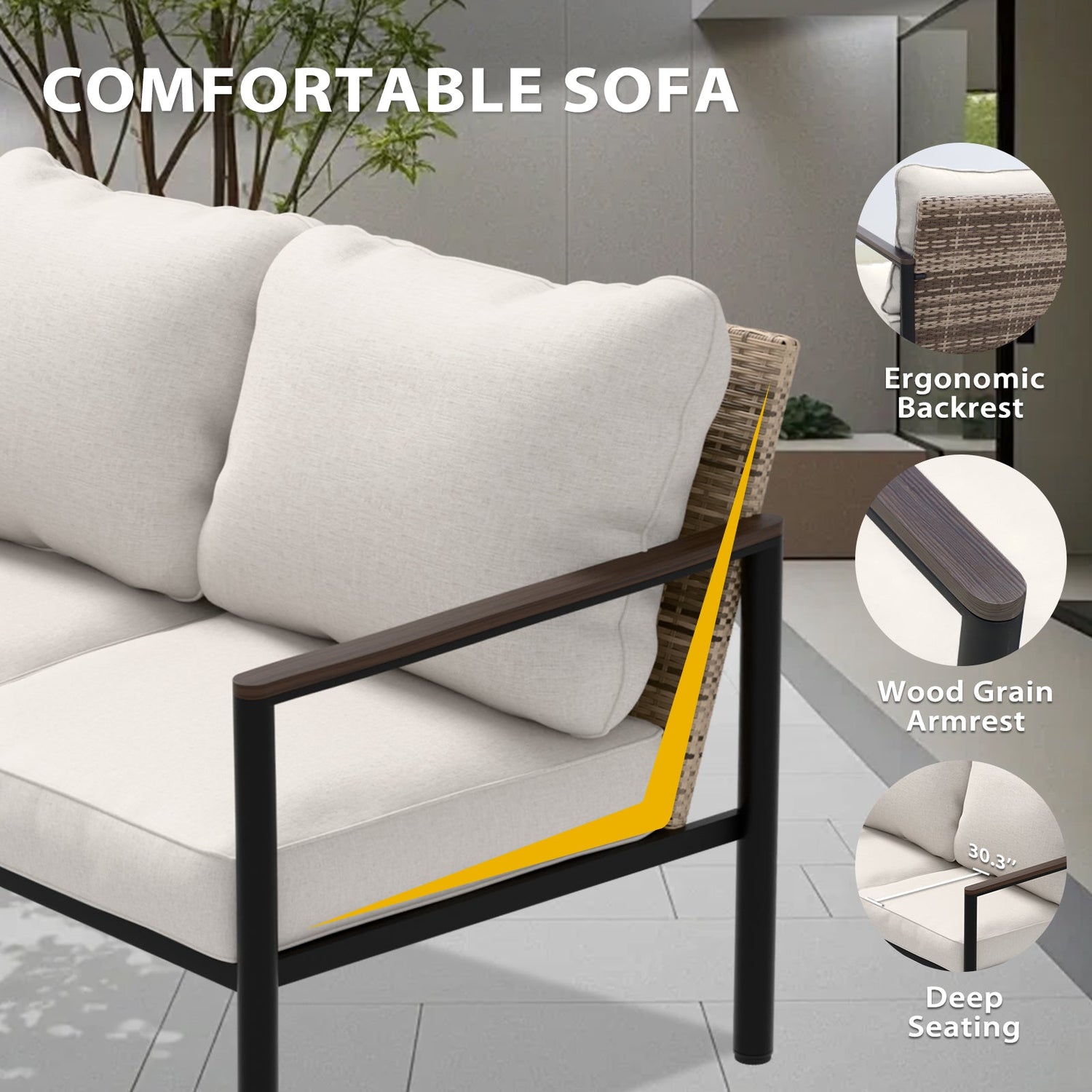 MODERN OUTDOOR LIVING: Elevate your outdoor space with this sleek, 6-piece wicker patio lounge set featuring 2 chairs, 1 loveseat sofa, 2 tables, and an ottoman, this set combines chic wood grain accents and deep 4 inch thick cushions for added comfort, making it perfect for both relaxing and entertaining.