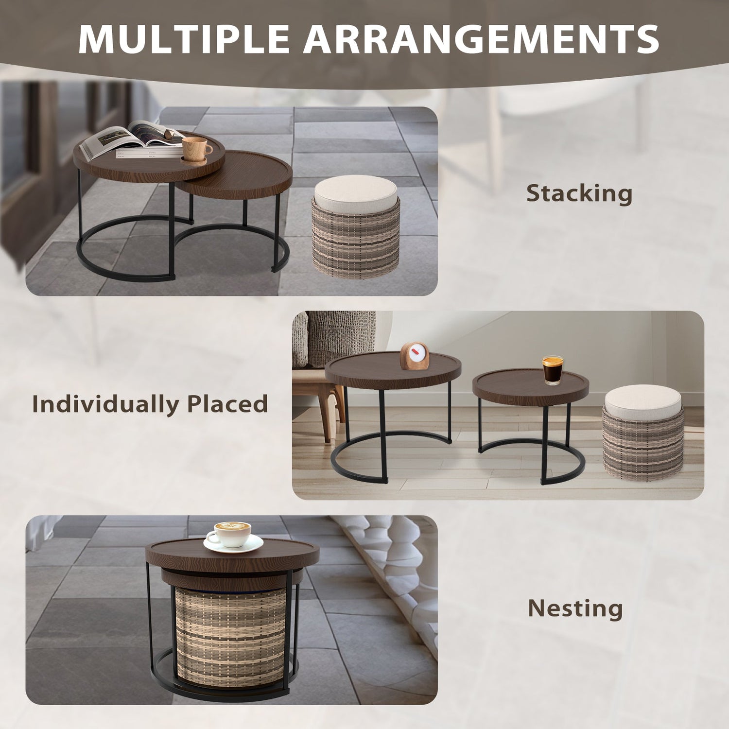 PERFECTLY SIZED: The nesting tables stand at a comfortable height of 16.9" with a diameter of 22.8", making them a great fit for any space; while the matching ottoman complements the set and fits under the smallest table without overwhelming your style.
