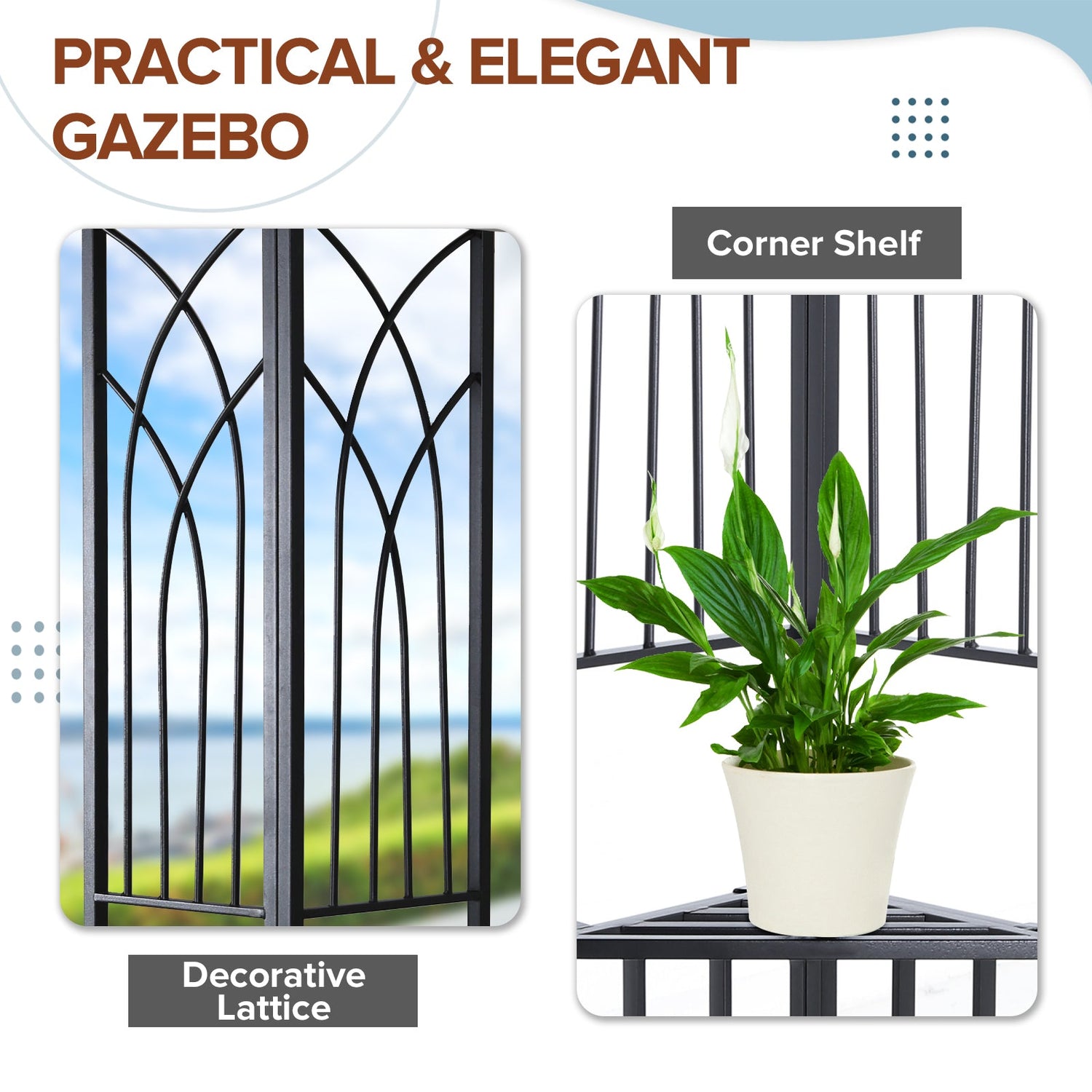 CORNER SHELVES DESIGN: The decorative steel trellis style corner posts feature shelves for added functionality. They are the perfect place for small lights, plants and more.