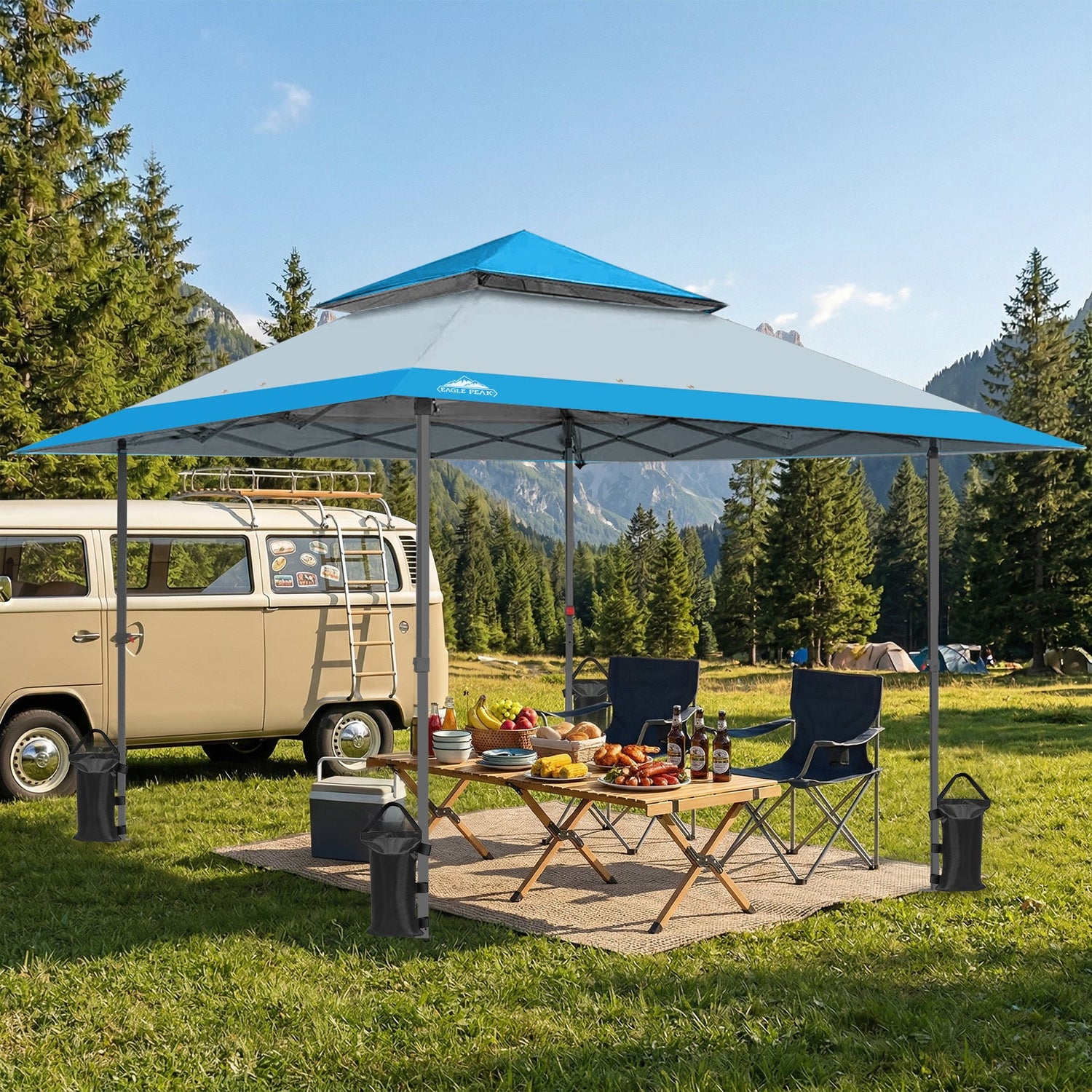 VENTED TOP & AUTOMATIC EXTENDED EAVES: Stay cool with the EAGLE PEAK VENT that allows for greater airflow while you work or relax. The canopy’s automatically extending eaves open without any manual assembly and, combined with a sturdy straight-leg design, provides maximum coverage so 8 or more people can enjoy the spacious 169 square feet of shade. The easily adjustable telescoping 3-position steel frame is perfect for adjusting the canopy for your preferred coverage.
